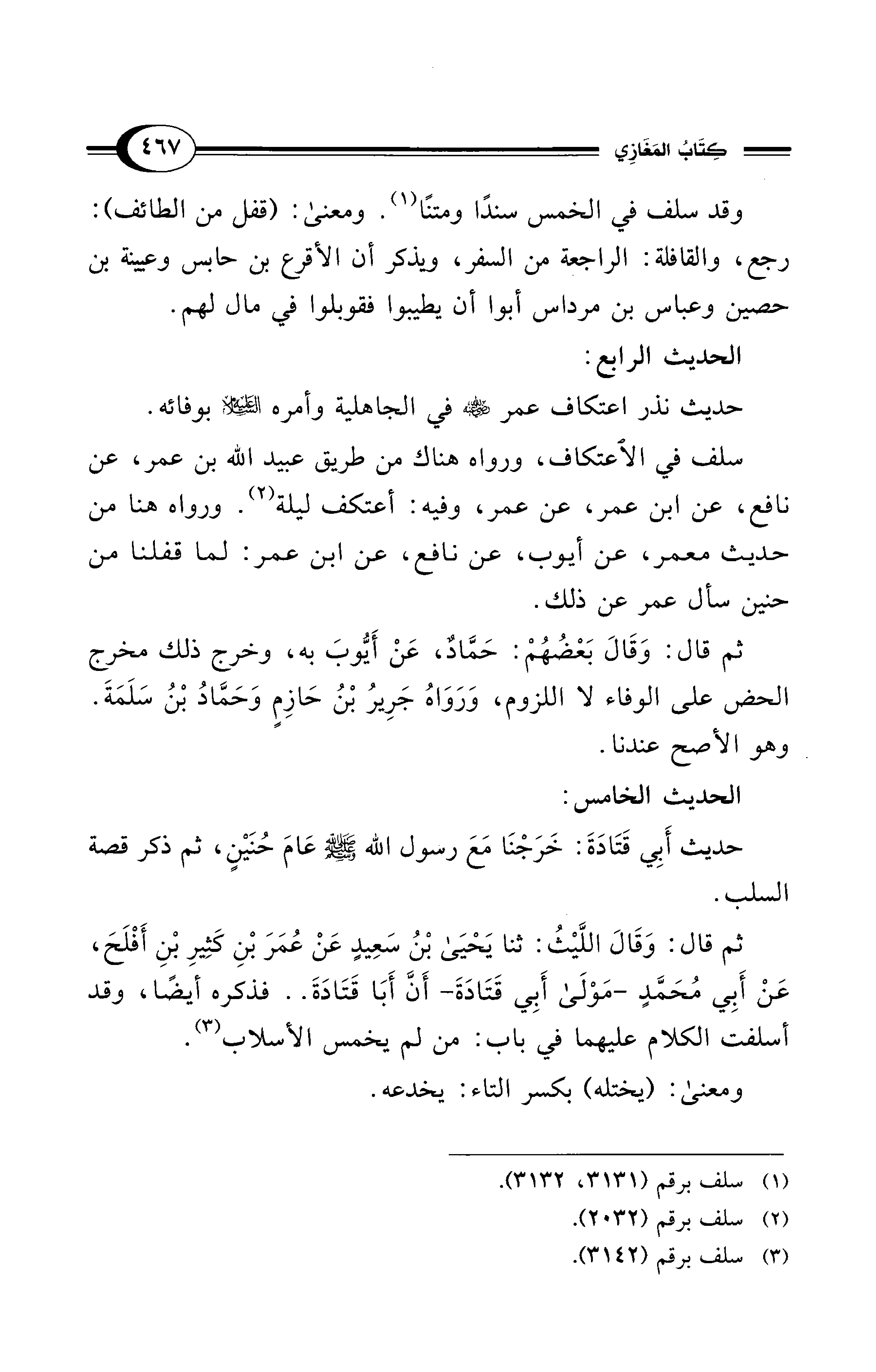 سلف في الاعتكاف، ورواه هناك من طريق عبيد الله بن عمر، عن نافع، عن ابن عمر، عن عمر، وفيه: أعتكف ليلة (¬2). ورواه هنا من حديث معمر، عن أيوب، عن نافع، عن ابن عمر: لما قفلنا من حنين سأل عمر عن ذلك.