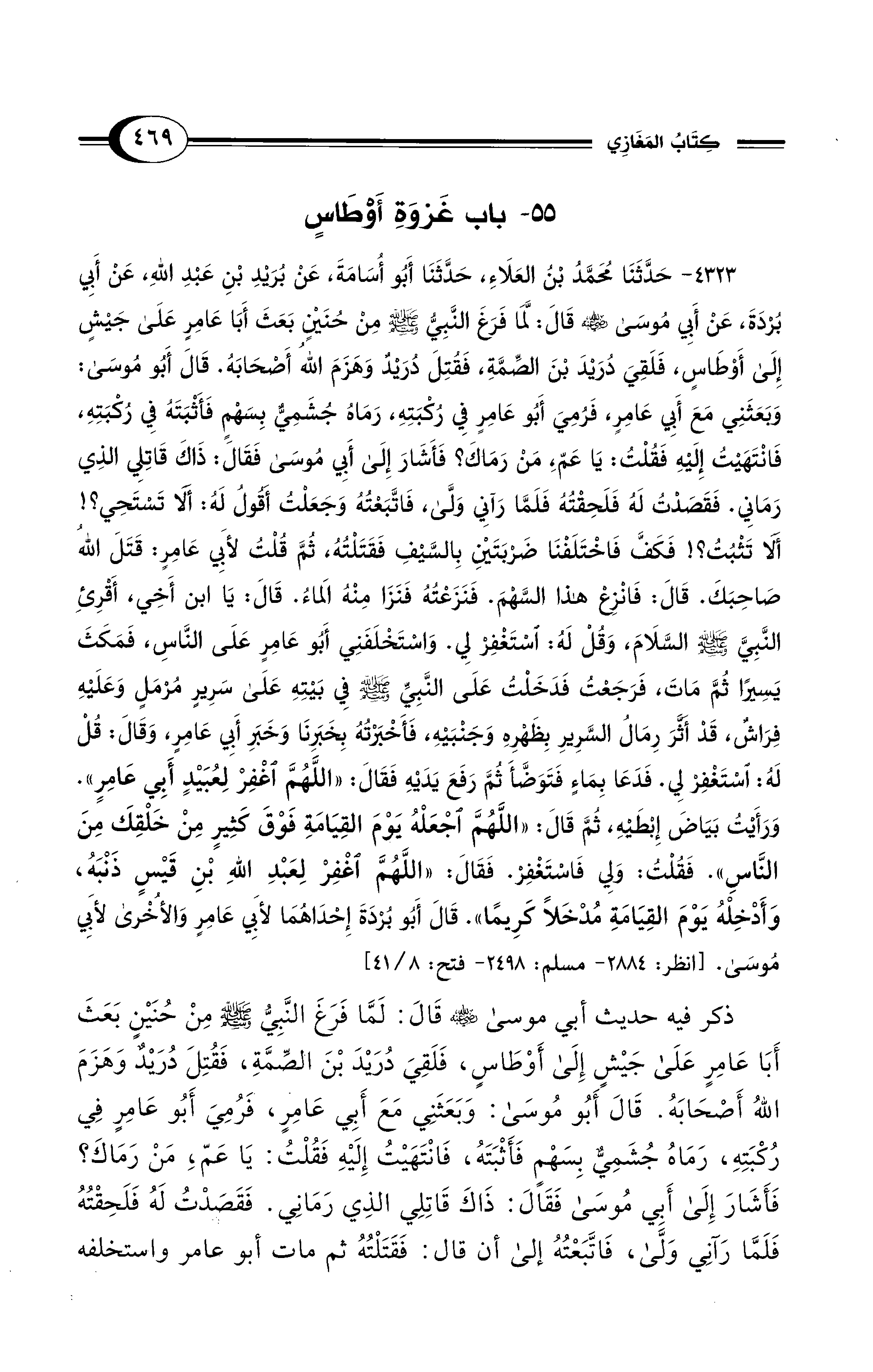 4323 - حَدَّثَنَا مُحَمَّدُ بْنُ الْعَلاَءِ, حَدَّثَنَا أَبُو أُسَامَةَ, عَنْ بُرَيْدِ بْنِ عَبْدِ اللهِ, عَنْ أَبِي بُرْدَةَ, عَنْ أَبِي مُوسَى - رضي الله عنه - قَالَ: لَمَّا فَرَغَ النَّبِيُّ - صلى الله عليه وسلم - مِنْ حُنَيْنٍ بَعَثَ أَبَا عَامِرٍ عَلَى جَيْشٍ إِلَى أَوْطَاسٍ, فَلَقِىَ دُرَيْدَ بْنَ الصِّمَّةِ، فَقُتِلَ دُرَيْدٌ وَهَزَمَ اللهُ أَصْحَابَهُ. قَالَ أَبُو مُوسَى: وَبَعَثَنِي مَعَ أَبِي عَامِرٍ, فَرُمِيَ أَبُو عَامِرٍ فِي رُكْبَتِهِ، رَمَاهُ جُشَمِيٌّ بِسَهْمٍ فَأَثْبَتَهُ فِي رُكْبَتِهِ، فَانْتَهَيْتُ إِلَيْهِ فَقُلْتُ: يَا عَمِّ مَنْ رَمَاكَ؟ فَأَشَارَ إِلَى أَبِي مُوسَى فَقَالَ: ذَاكَ قَاتِلِي الَّذِي رَمَانِي. فَقَصَدْتُ لَهُ فَلَحِقْتُهُ فَلَمَّا رَآنِي وَلَّى, فَاتَّبَعْتُهُ وَجَعَلْتُ أَقُولُ لَهُ: أَلاَ تَسْتَحِي؟! أَلاَ تَثْبُتُ؟! فَكَفَّ فَاخْتَلَفْنَا ضَرْبَتَيْنِ بِالسَّيْفِ فَقَتَلْتُهُ, ثُمَّ قُلْتُ لأَبِي عَامِرٍ: قَتَلَ اللهُ صَاحِبَكَ. قَالَ: فَانْزِعْ هَذَا السَّهْمَ. فَنَزَعْتُهُ فَنَزَا مِنْهُ الْمَاءُ. قَالَ: يَا ابْنَ أَخِي, أَقْرِئِ النَّبِيَّ - صلى الله عليه وسلم - السَّلاَمَ، وَقُلْ لَهُ: اسْتَغْفِرْ لِي. وَاسْتَخْلَفَنِي أَبُو عَامِرٍ عَلَى النَّاسِ، فَمَكَثَ يَسِيرًا ثُمَّ مَاتَ، فَرَجَعْتُ فَدَخَلْتُ عَلَى النَّبِيِّ - صلى الله عليه وسلم - فِي بَيْتِهِ عَلَى سَرِيرٍ مُرْمَلٍ وَعَلَيْهِ فِرَاشٌ قَدْ أَثَّرَ رِمَالُ السَّرِيرِ بِظَهْرِهِ وَجَنْبَيْهِ، فَأَخْبَرْتُهُ بِخَبَرِنَا وَخَبَرِ أَبِي عَامِرٍ، وَقَالَ: قُلْ لَهُ: اسْتَغْفِرْ لِي. فَدَعَا بِمَاءٍ فَتَوَضَّأَ ثُمَّ رَفَعَ يَدَيْهِ فَقَالَ: "اللَّهُمَّ اغْفِرْ لِعُبَيْدٍ أَبِي عَامِرٍ". وَرَأَيْتُ بَيَاضَ إِبْطَيْهِ ثُمَّ قَالَ: "اللَّهُمَّ اجْعَلْهُ يَوْمَ الْقِيَامَةِ فَوْقَ كَثِيرٍ مِنْ خَلْقِكَ مِنَ النَّاسِ". فَقُلْتُ: وَلِي فَاسْتَغْفِرْ. فَقَالَ: "اللَّهُمَّ اغْفِرْ لِعَبْدِ اللهِ بْنِ قَيْسٍ ذَنْبَهُ, وَأَدْخِلْهُ يَوْمَ الْقِيَامَةِ مُدْخَلاً كَرِيمًا". قَالَ أَبُو بُرْدَةَ إِحْدَاهُمَا لأَبِي عَامِرٍ وَالأُخْرَى لأَبِي مُوسَى. [انظر: 2884 - مسلم: 2498 - فتح: 8/ 41]