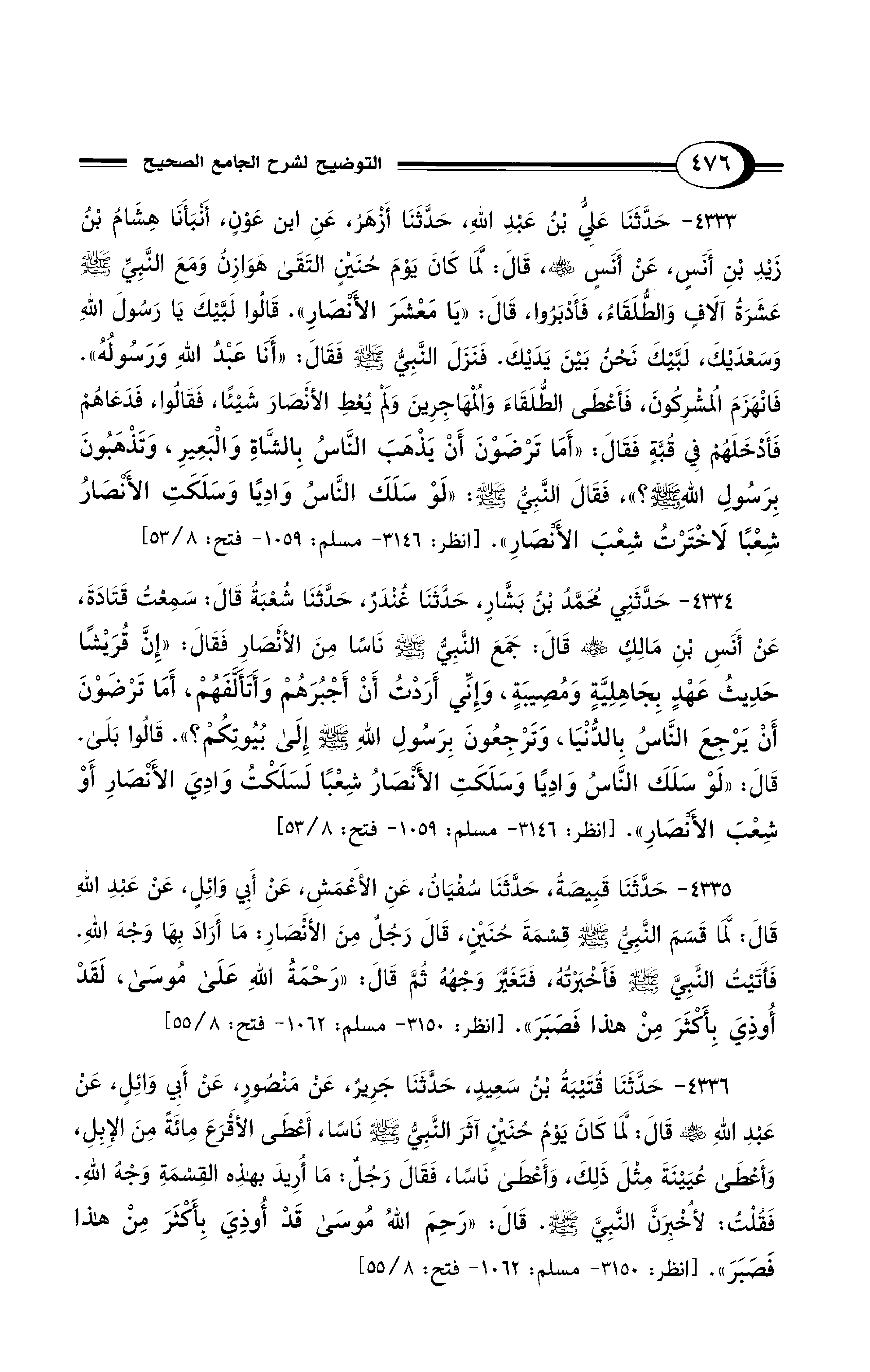 4334 - حَدَّثَنِي مُحَمَّدُ بْنُ بَشَّارٍ, حَدَّثَنَا غُنْدَرٌ, حَدَّثَنَا شُعْبَةُ قَالَ: سَمِعْتُ قَتَادَةَ ,عَنْ أَنَسِ بْنِ مَالِكٍ - رضي الله عنه - قَالَ: جَمَعَ النَّبِيُّ - صلى الله عليه وسلم - نَاسًا مِنَ الأَنْصَارِ فَقَالَ: "إِنَّ قُرَيْشًا حَدِيثُ عَهْدٍ بِجَاهِلِيَّةٍ وَمُصِيبَةٍ، وَإِنِّي أَرَدْتُ أَنْ أَجْبُرَهُمْ وَأَتَأَلَّفَهُمْ, أَمَا تَرْضَوْنَ أَنْ يَرْجِعَ النَّاسُ بِالدُّنْيَا، وَتَرْجِعُونَ بِرَسُولِ اللهِ - صلى الله عليه وسلم - إِلَى بُيُوتِكُمْ؟ ". قَالُوا بَلَى. قَالَ: "لَوْ سَلَكَ النَّاسُ وَادِيًا وَسَلَكَتِ الأَنْصَارُ شِعْبًا لَسَلَكْتُ وَادِيَ الأَنْصَارِ أَوْ شِعْبَ الأَنْصَارِ". [انظر: 3146 - مسلم: 1059 - فتح: 8/ 53]