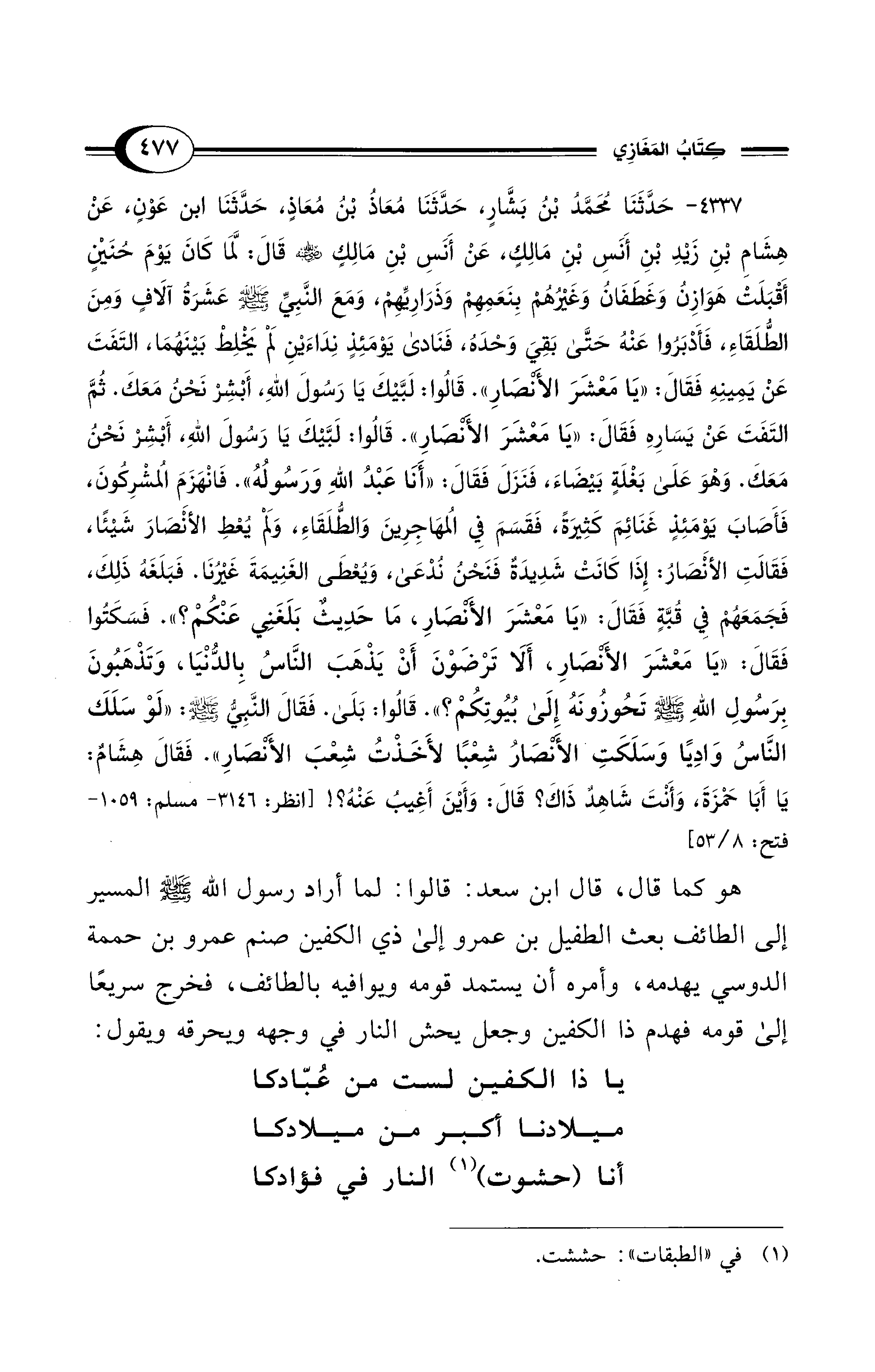 4337 - حَدَّثَنَا مُحَمَّدُ بْنُ بَشَّارٍ, حَدَّثَنَا مُعَاذُ بْنُ مُعَاذٍ, حَدَّثَنَا ابْنُ عَوْنٍ, عَنْ هِشَامِ بْنِ زَيْدِ بْنِ أَنَسِ بْنِ مَالِكٍ, عَنْ أَنَسِ بْنِ مَالِكٍ - رضي الله عنه - قَالَ: لَمَّا كَانَ يَوْمُ حُنَيْنٍ أَقْبَلَتْ هَوَازِنُ وَغَطَفَانُ وَغَيْرُهُمْ بِنَعَمِهِمْ وَذَرَارِيِّهِمْ، وَمَعَ النَّبِيِّ - صلى الله عليه وسلم - عَشَرَةُ آلاَفٍ وَمِنَ الطُّلَقَاءِ، فَأَدْبَرُوا عَنْهُ حَتَّى بَقِيَ وَحْدَهُ، فَنَادَى يَوْمَئِذٍ نِدَاءَيْنِ لَمْ يَخْلِطْ بَيْنَهُمَا، الْتَفَتَ عَنْ يَمِينِهِ، فَقَالَ: "يَا مَعْشَرَ الأَنْصَارِ". قَالُوا: لَبَّيْكَ يَا رَسُولَ اللهِ، أَبْشِرْ نَحْنُ مَعَكَ. ثُمَّ الْتَفَتَ عَنْ يَسَارِهِ، فَقَالَ: "يَا مَعْشَرَ الأَنْصَارِ". قَالُوا: لَبَّيْكَ يَا رَسُولَ اللهِ، أَبْشِرْ نَحْنُ مَعَكَ. وَهْوَ عَلَى بَغْلَةٍ بَيْضَاءَ، فَنَزَلَ فَقَالَ: "أَنَا عَبْدُ اللهِ وَرَسُولُهُ".فَانْهَزَمَ الْمُشْرِكُونَ، فَأَصَابَ يَوْمَئِذٍ غَنَائِمَ كَثِيرَةً، فَقَسَمَ فِي الْمُهَاجِرِينَ وَالطُّلَقَاءِ وَلَمْ يُعْطِ الأَنْصَارَ شَيْئًا، فَقَالَتِ الأَنْصَارُ: إِذَا كَانَتْ شَدِيدَةٌ فَنَحْنُ نُدْعَى، وَيُعْطَى الْغَنِيمَةَ غَيْرُنَا. فَبَلَغَهُ ذَلِكَ، فَجَمَعَهُمْ فِي قُبَّةٍ، فَقَالَ: "يَا مَعْشَرَ الأَنْصَارِ مَا حَدِيثٌ بَلَغَنِي عَنْكُمْ؟ ". فَسَكَتُوا فَقَالَ: "يَا مَعْشَرَ الأَنْصَارِ, أَلاَ تَرْضَوْنَ أَنْ يَذْهَبَ النَّاسُ بِالدُّنْيَا، وَتَذْهَبُونَ بِرَسُولِ اللهِ - صلى الله عليه وسلم - تَحُوزُونَهُ إِلَى بُيُوتِكُمْ؟ ". قَالُوا: بَلَى. فَقَالَ النَّبيُّ - صلى الله عليه وسلم -: "لَوْ سَلَكَ النَّاسُ وَادِيًا، وَسَلَكَتِ الأَنْصَارُ شِعْبًا لأَخَذْتُ شِعْبَ الأَنْصَارِ". فَقَالَ هِشَامٌ: يَا أَبَا حَمْزَةَ، وَأَنْتَ شَاهِدٌ ذَاكَ؟ قَالَ: وَأَيْنَ أَغِيبُ عَنْه؟! [انظر: 3146 - مسلم: 1059 - فتح: 8/ 53]
