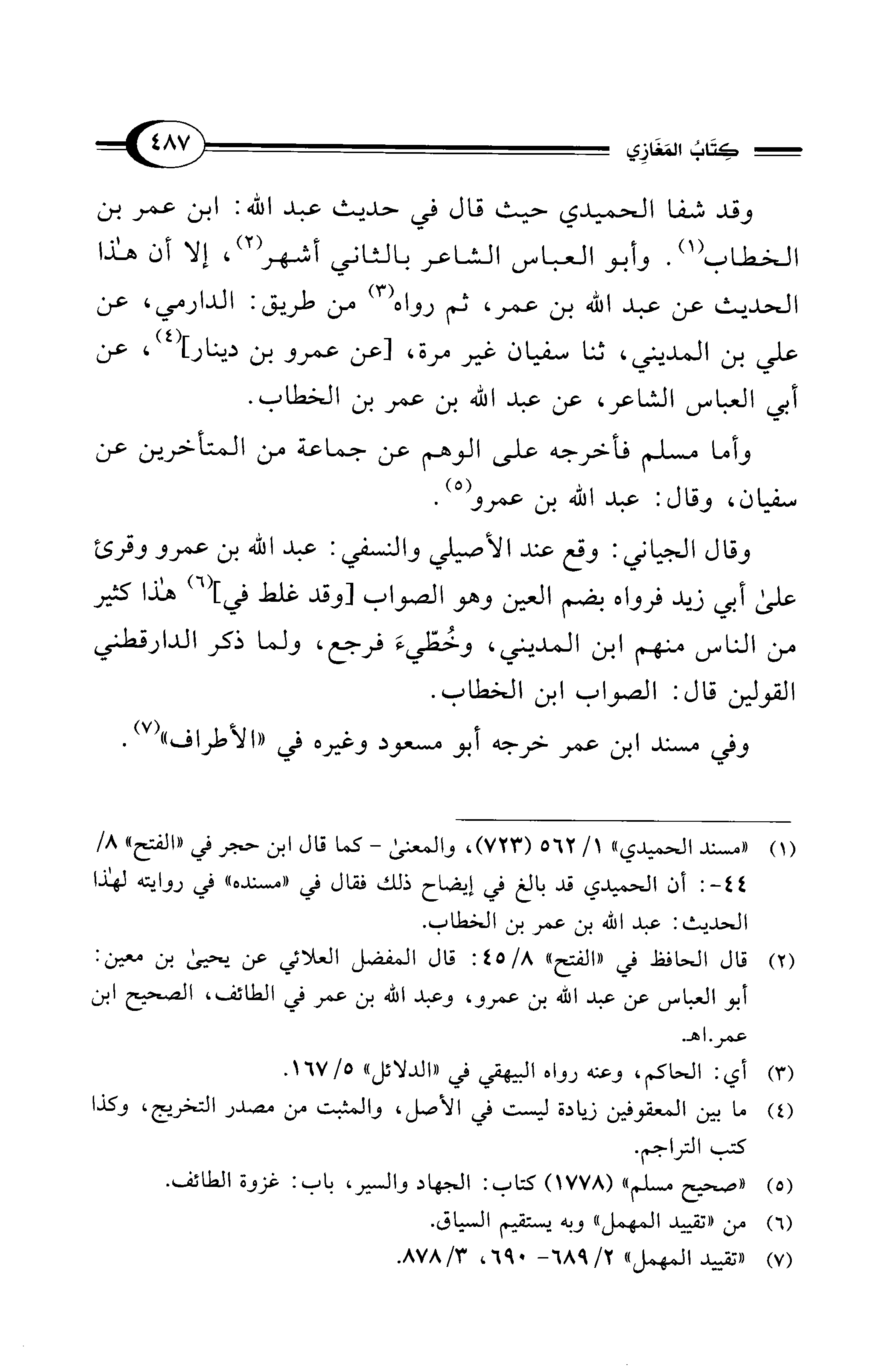 (¬1) "مسند الحميدي" 1/ 562 (723)، والمعنى -كما قال ابن حجر في "الفتح" 8/ 44 - : أن الحميدي قد بالغ في إيضاح ذلك فقال في "مسنده" في روايته لهذا الحديث: عبد الله بن عمر بن الخطاب.