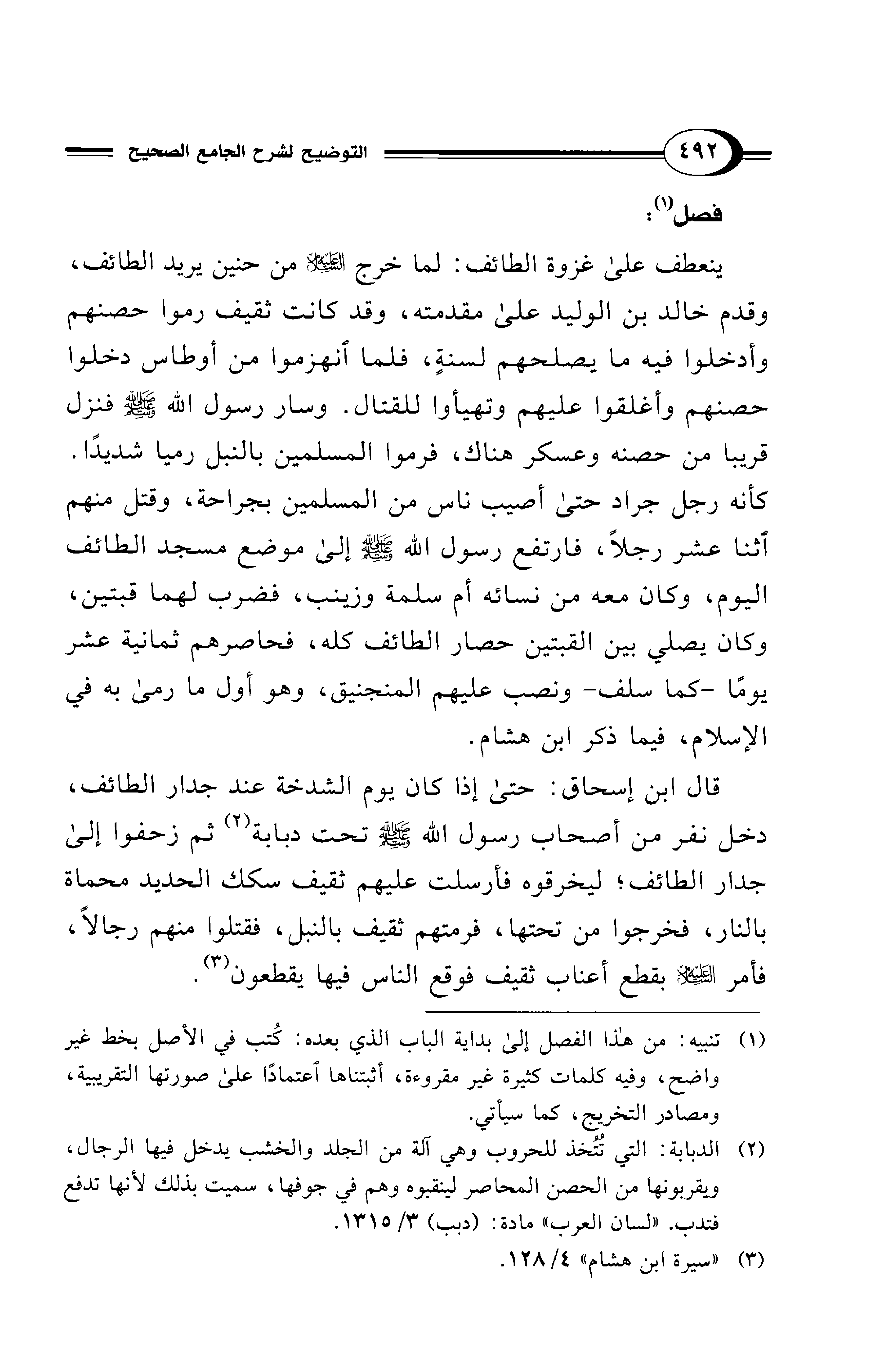 ينعطف على غزوة الطائف: لما خرج - عليه السلام - من حنين يريد الطائف، وقدم خالد بن الوليد على مقدمته، وقد كانت ثقيف رموا حصنهم وأدخلوا فيه ما يصلحهم لسنةٍ، فلما انهزموا من أوطاس دخلوا حصنهم وأغلقوا عليهم وتهيأوا للقتال. وسار رسول الله - صلى الله عليه وسلم - فنزل قريبا من حصنه وعسكر هناك، فرموا المسلمين بالنبل رميا شديدًا. كأنه رجل جراد حتى أصيب ناس من المسلمين بجراحة، وقتل منهم اثنا عشر رجلاً، فارتفع رسول الله - صلى الله عليه وسلم - إلى موضع مسجد الطائف اليوم، وكان معه من نسائه أم سلمة وزينب، فضرب لهما قبتين، وكان يصلي بين القبتين حصار الطائف كله، فحاصرهم ثمانية عشر يومًا -كما سلف- ونصب عليهم المنجنيق، وهو أول ما رمى به في الإسلام، فيما ذكر ابن هشام.