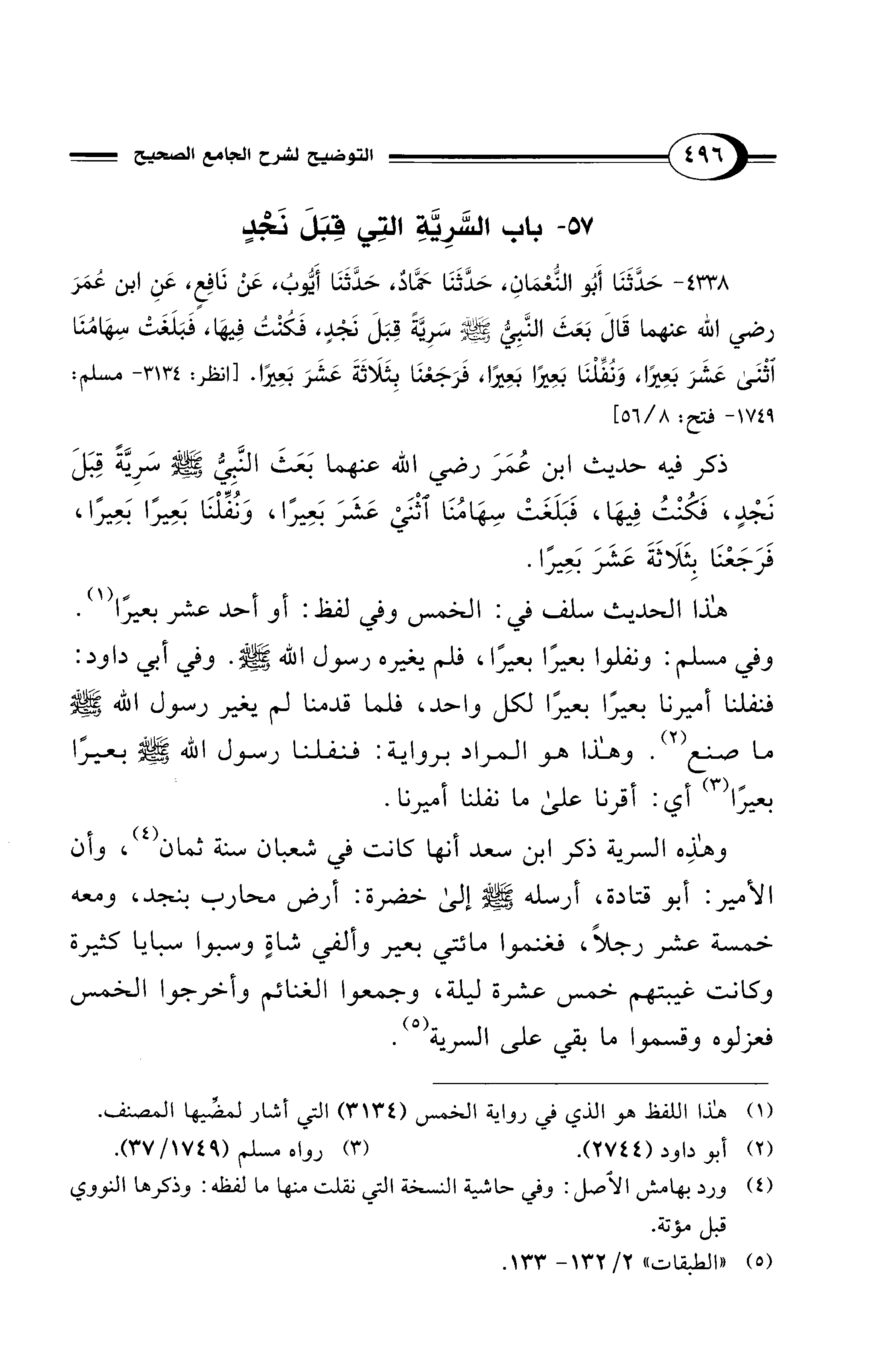 4338 - حَدَّثَنَا أَبُو النُّعْمَانِ, حَدَّثَنَا حَمَّادٌ, حَدَّثَنَا أَيُّوبُ, عَنْ نَافِعٍ, عَنِ ابْنِ عُمَرَ - رضي الله عنهما - قَالَ بَعَثَ النَّبِيُّ - صلى الله عليه وسلم - سَرِيَّةً قِبَلَ نَجْدٍ، فَكُنْتُ فِيهَا، فَبَلَغَتْ سِهَامُنَا اثْنَىْ عَشَرَ بَعِيرًا، وَنُفِّلْنَا بَعِيرًا بَعِيرًا، فَرَجَعْنَا بِثَلاَثَةَ عَشَرَ بَعِيرًا. [انظر: 3134 - مسلم: 1749 - فتح: 8/ 56]