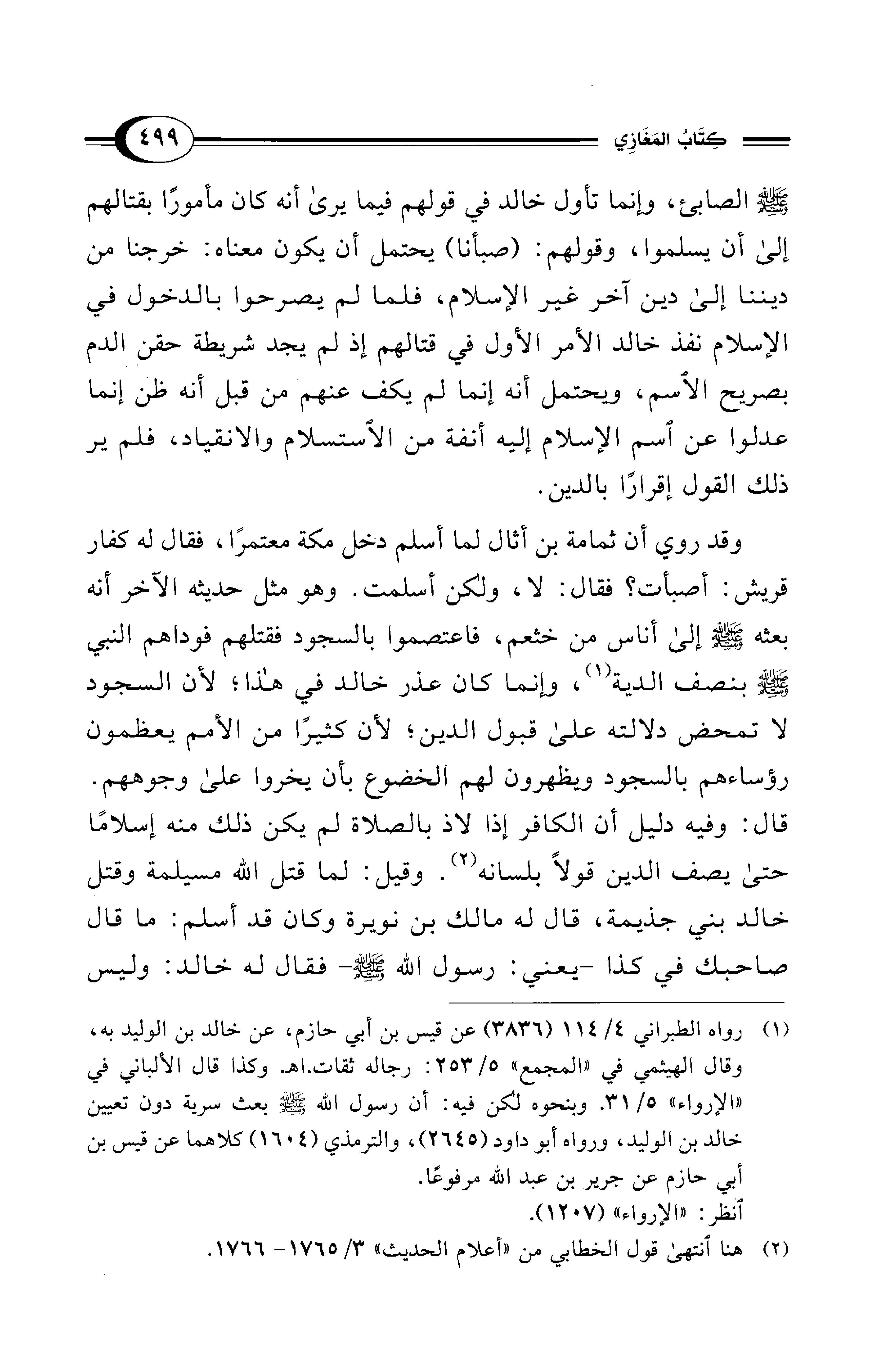- صلى الله عليه وسلم - الصابئ، وإنما تأول خالد في قولهم فيما يرى أنه كان مأمورًا بقتالهم إلى أن يسلموا، وقولهم: (صبأنا) يحتمل أن يكون معناه: خرجنا من ديننا إلى دين آخر غير الإسلام، فلما لم يصرحوا بالدخول في الإسلام نفذ خالد الأمر الأول في قتالهم إذ لم يجد شريطة حقن الدم بصريح الاسم، ويحتمل أنه إنما لم يكف عنهم من قبل أنه ظن إنما عدلوا عن اسم الإسلام إليه أنفة من الاستسلام والانقياد، فلم ير ذلك القول إقرارًا بالدين.