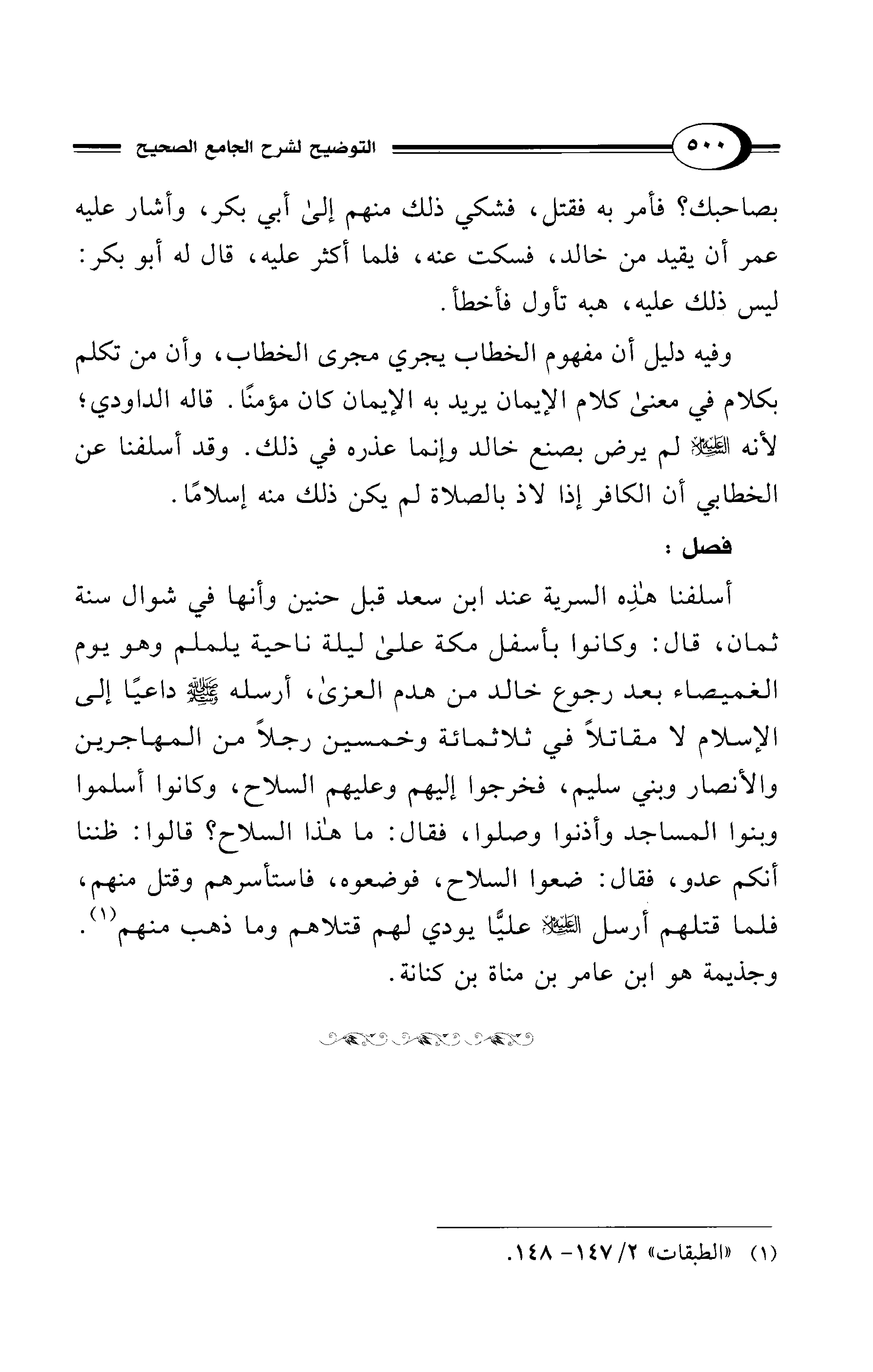 أسلفنا هذِه السرية عند ابن سعد قبل حنين وأنها في شوال سنة ثمان، قال: وكانوا بأسفل مكة على ليلة ناحية يلملم وهو يوم الغميصاء بعد رجوع خالد من هدم العزى، أرسله - صلى الله عليه وسلم - داعيًا إلى الإسلام لا مقاتلاً في ثلاثمائة وخمسين رجلاً من المهاجرين والأنصار وبني سليم، فخرجوا إليهم وعليهم السلاح، وكانوا أسلموا وبنوا المساجد وأذنوا وصلوا، فقال: ما هذا السلاح؟ قالوا: ظننا أنكم عدو، فقال: ضعوا السلاح، فوضعوه، فاستأسرهم وقتل منهم، فلما قتلهم أرسل - عليه السلام - عليًّا يودي لهم قتلاهم وما ذهب منهم (¬1). وجذيمة هو ابن عامر بن مناة بن كنانة.
