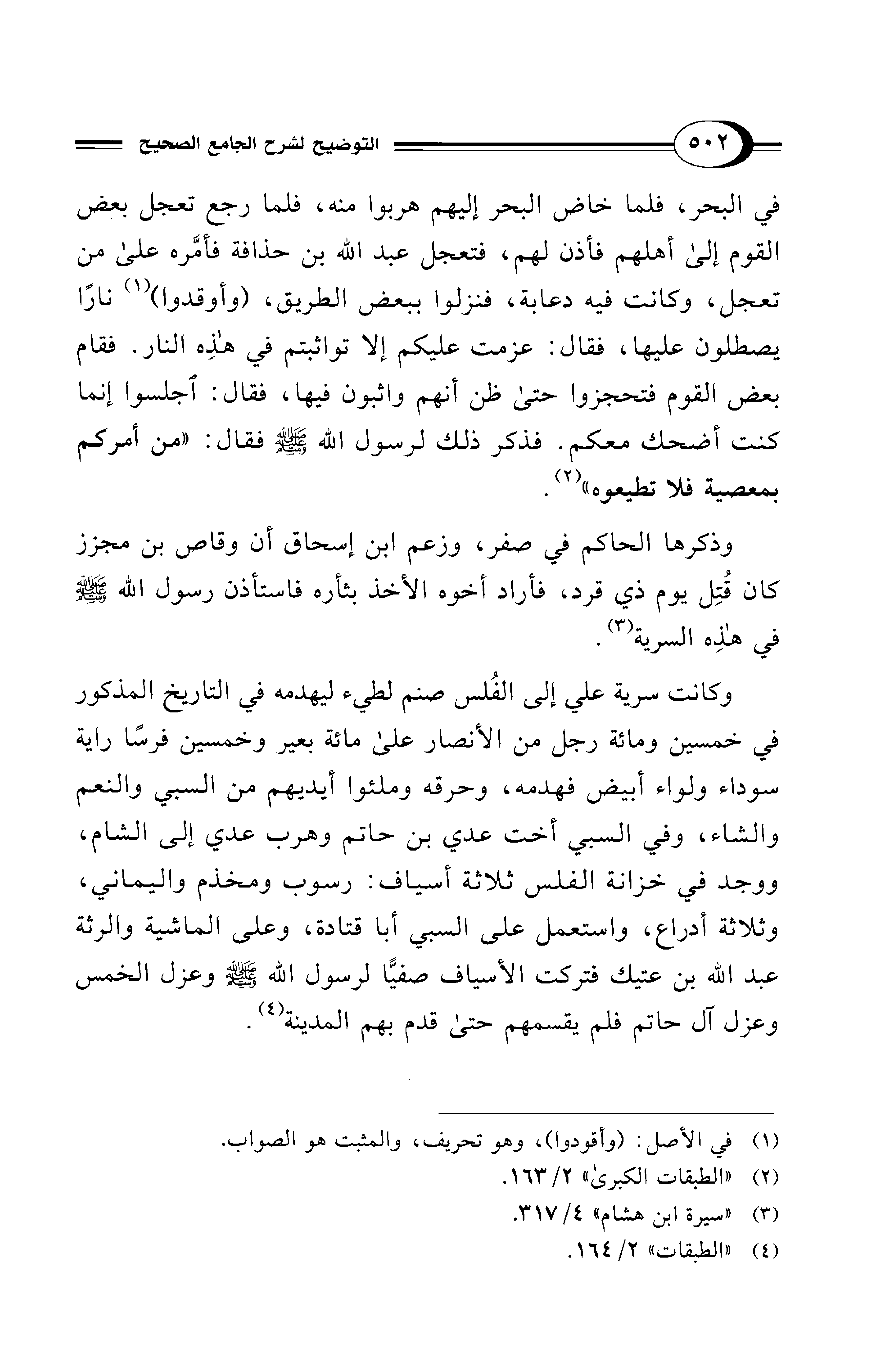 وكانت سرية علي إلى الفُلس صنم لطيء ليهدمه في التاريخ المذكور في خمسين ومائة رجل من الأنصار على مائة بعير وخمسين فرسًا راية سوداء ولواء أبيض فهدمه، وحرقه وملئوا أيديهم من السبي والنعم والشاء، وفي السبي أخت عدي بن حاتم وهرب عدي إلى الشام، ووجد في خزانة الفلس ثلاثة أسياف: رسوب ومخذم واليماني، وثلاثة أدراع، واستعمل على السبي أبا قتادة، وعلى الماشية والرثة عبد الله بن عتيك فتركت الأسياف صفيًّا لرسول الله - صلى الله عليه وسلم - وعزل الخمس وعزل آل حاتم فلم يقسمهم حتى قدم بهم المدينة (¬4).