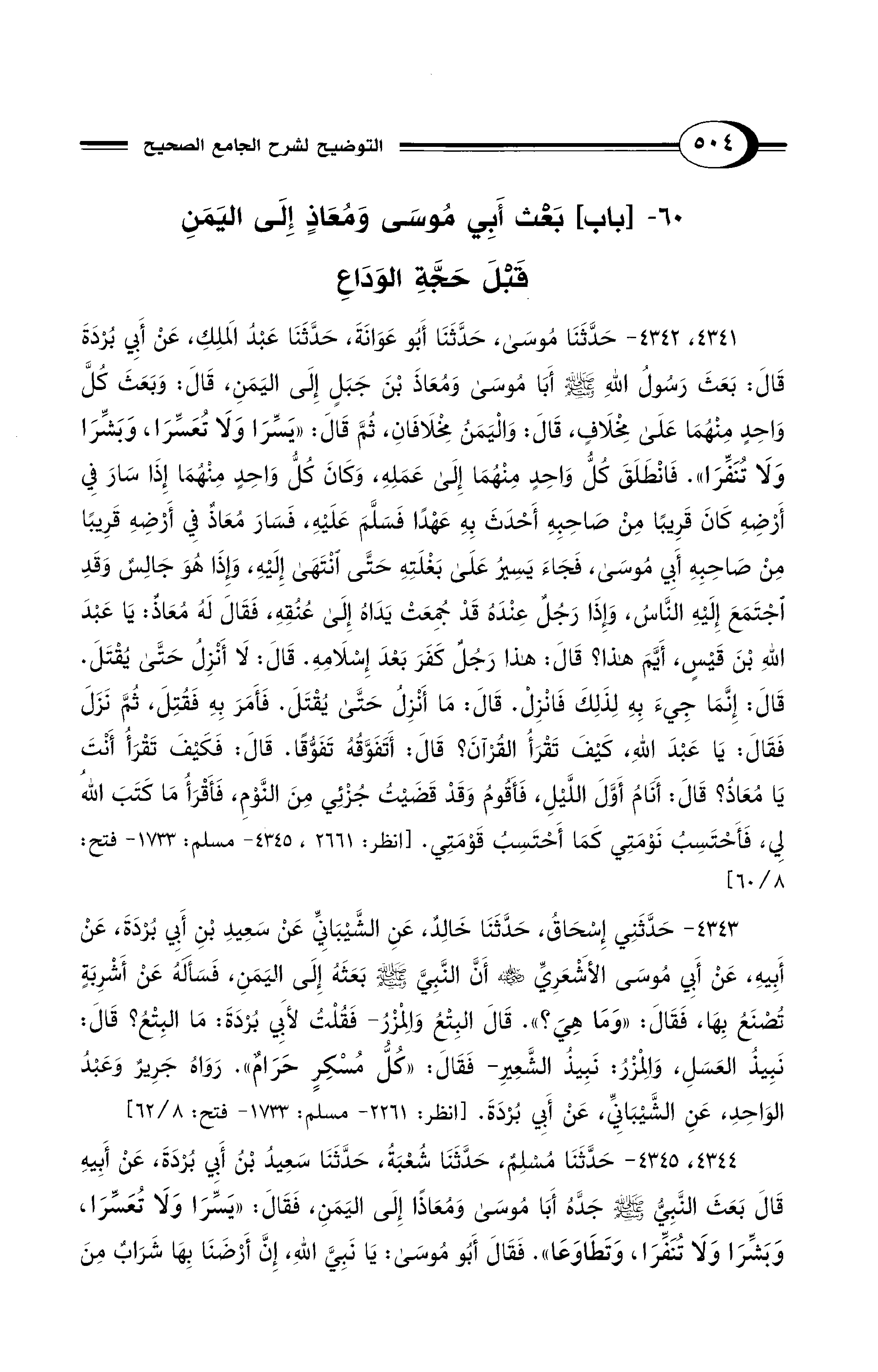 4341, 4342 - حَدَّثَنَا مُوسَى, حَدَّثَنَا أَبُو عَوَانَةَ, حَدَّثَنَا عَبْدُ الْمَلِكِ, عَنْ أَبِي بُرْدَةَ قَالَ: بَعَثَ رَسُولُ اللهِ - صلى الله عليه وسلم - أَبَا مُوسَى وَمُعَاذَ بْنَ جَبَلٍ إِلَى الْيَمَنِ، قَالَ: وَبَعَثَ كُلَّ وَاحِدٍ مِنْهُمَا عَلَى مِخْلاَفٍ, قَالَ: وَالْيَمَنُ مِخْلاَفَانِ, ثُمَّ قَالَ: "يَسِّرَا وَلاَ تُعَسِّرَا، وَبَشِّرَا وَلاَ تُنَفِّرَا". فَانْطَلَقَ كُلُّ وَاحِدٍ مِنْهُمَا إِلَى عَمَلِهِ، وَكَانَ كُلُّ وَاحِدٍ مِنْهُمَا إِذَا سَارَ فِي أَرْضِهِ كَانَ قَرِيبًا مِنْ صَاحِبِهِ أَحْدَثَ بِهِ عَهْدًا فَسَلَّمَ عَلَيْهِ، فَسَارَ مُعَاذٌ فِي أَرْضِهِ قَرِيبًا مِنْ صَاحِبِهِ أَبِي مُوسَى، فَجَاءَ يَسِيرُ عَلَى بَغْلَتِهِ حَتَّى انْتَهَى إِلَيْهِ، وَإِذَا هُوَ جَالِسٌ، وَقَدِ اجْتَمَعَ إِلَيْهِ النَّاسُ، وَإِذَا رَجُلٌ عِنْدَهُ قَدْ جُمِعَتْ يَدَاهُ إِلَى عُنُقِهِ, فَقَالَ لَهُ مُعَاذٌ: يَا عَبْدَ اللهِ بْنَ قَيْسٍ، أَيَّمَ هَذَا؟ قَالَ: هَذَا رَجُلٌ كَفَرَ بَعْدَ إِسْلاَمِهِ. قَالَ: لاَ أَنْزِلُ حَتَّى يُقْتَلَ. قَالَ: إِنَّمَا جِيءَ بِهِ لِذَلِكَ فَانْزِلْ. قَالَ: مَا أَنْزِلُ حَتَّى يُقْتَلَ. فَأَمَرَ بِهِ فَقُتِلَ, ثُمَّ نَزَلَ فَقَالَ: يَا عَبْدَ اللهِ، كَيْفَ تَقْرَأُ الْقُرْآنَ؟ قَالَ: أَتَفَوَّقُهُ تَفَوُّقًا. قَالَ: فَكَيْفَ تَقْرَأُ أَنْتَ يَا مُعَاذُ؟ قَالَ: أَنَامُ أَوَّلَ اللَّيْلِ, فَأَقُومُ وَقَدْ قَضَيْتُ جُزْئِي مِنَ النَّوْمِ، فَأَقْرَأُ مَا كَتَبَ اللهُ لِي، فَأَحْتَسِبُ نَوْمَتِي كَمَا أَحْتَسِبُ قَوْمَتِي. [انظر: 2661, 4345 - مسلم: 1733 - فتح: 8/ 60]