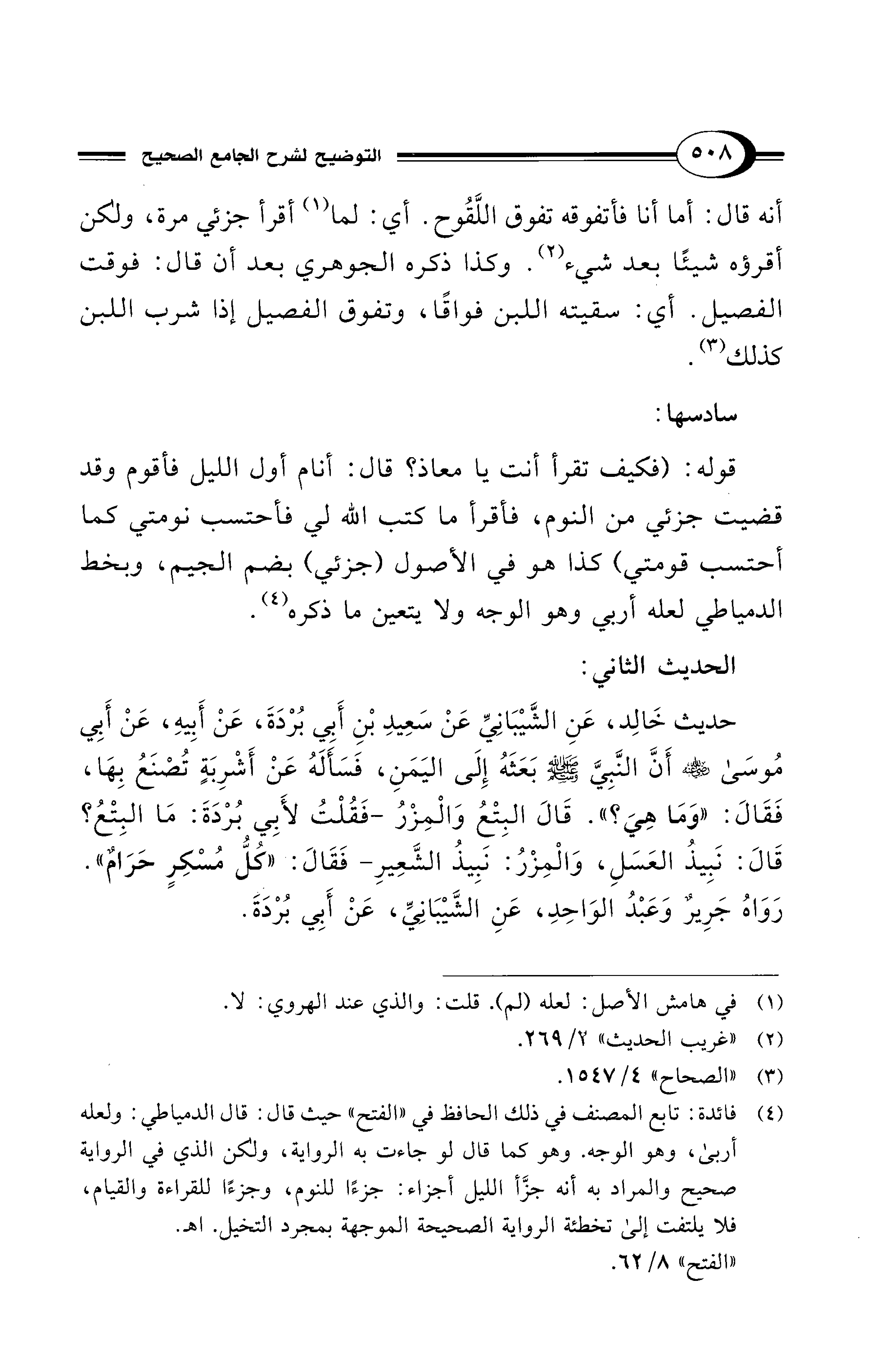 قوله: (فكيف تقرأ أنت يا معاذ؟ قال: أنام أول الليل فأقوم وقد قضيت جزئي من النوم، فأقرأ ما كتب الله لي فأحتسب نومتي كما أحتسب قومتي) كذا هو في الأصول (جزئي) بضم الجيم، وبخط الدمياطي لعله أربي وهو الوجه ولا يتعين ما ذكره (¬4).