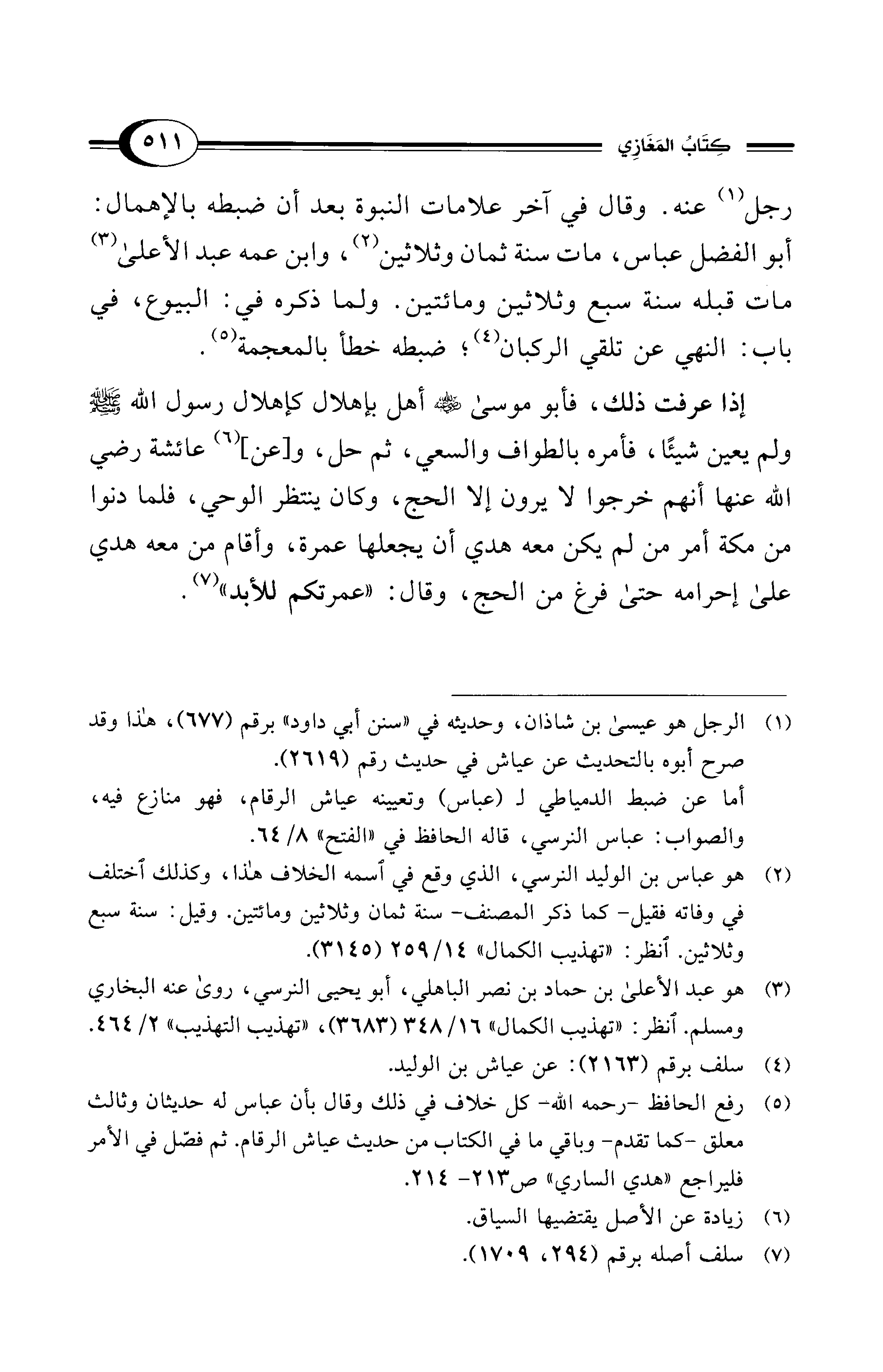 (¬5) رفع الحافظ -رحمه الله- كل خلاف في ذلك وقال بأن عباس له حديثان وثالث معلق -كما تقدم- وباقي ما في الكتاب من حديث عياش الرقام. ثم فصّل في الأمر فليراجع "هدي الساري" ص 213 - 214.