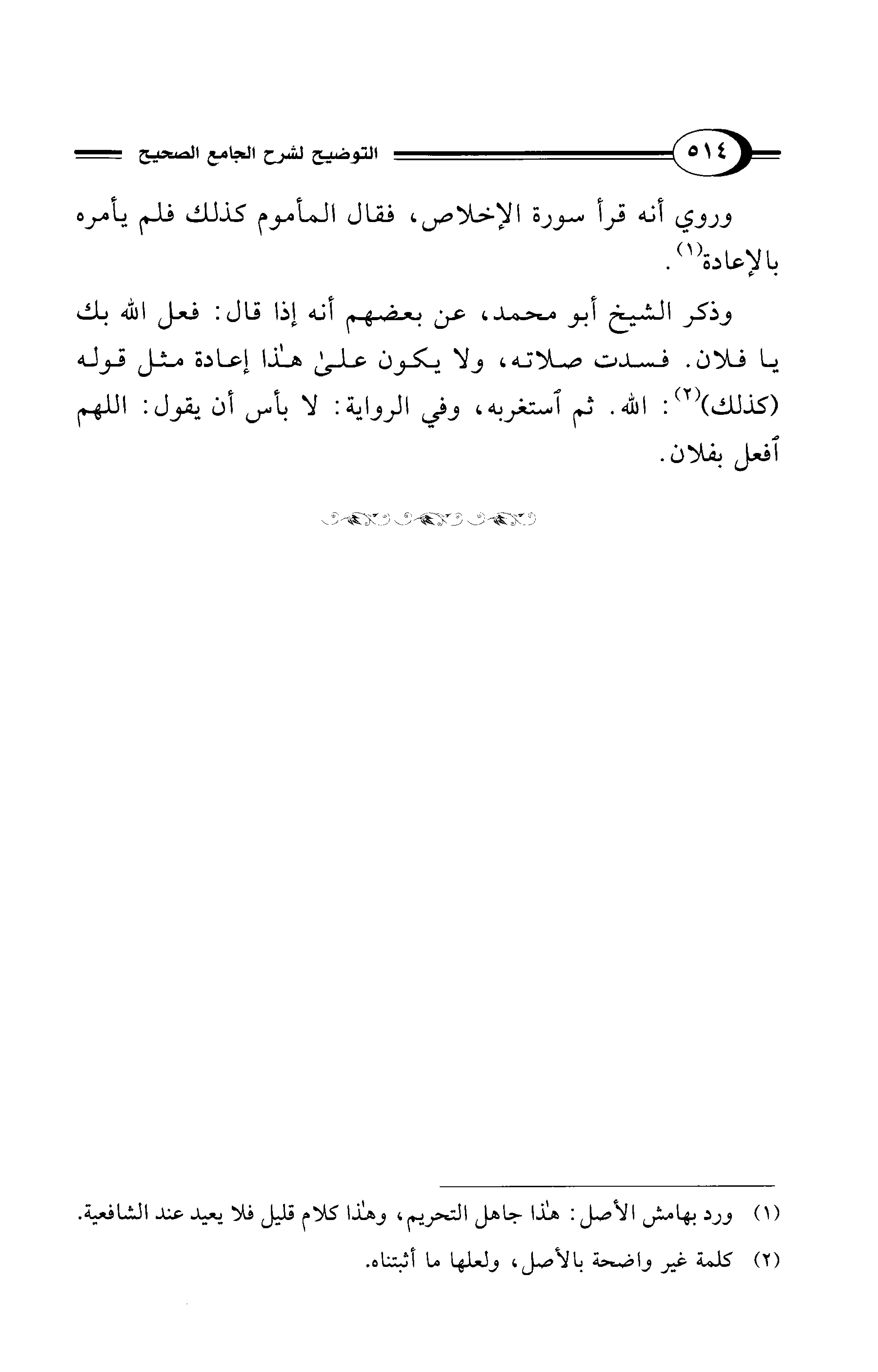 وذكر الشيخ أبو محمد، عن بعضهم أنه إذا قال: فعل الله بك يا فلان. فسدت صلاته، ولا يكون على هذا إعادة مثل قوله (كذلك) (¬2): الله. ثم استغربه، وفي الرواية: لا بأس أن يقول: اللهم افعل بفلان.