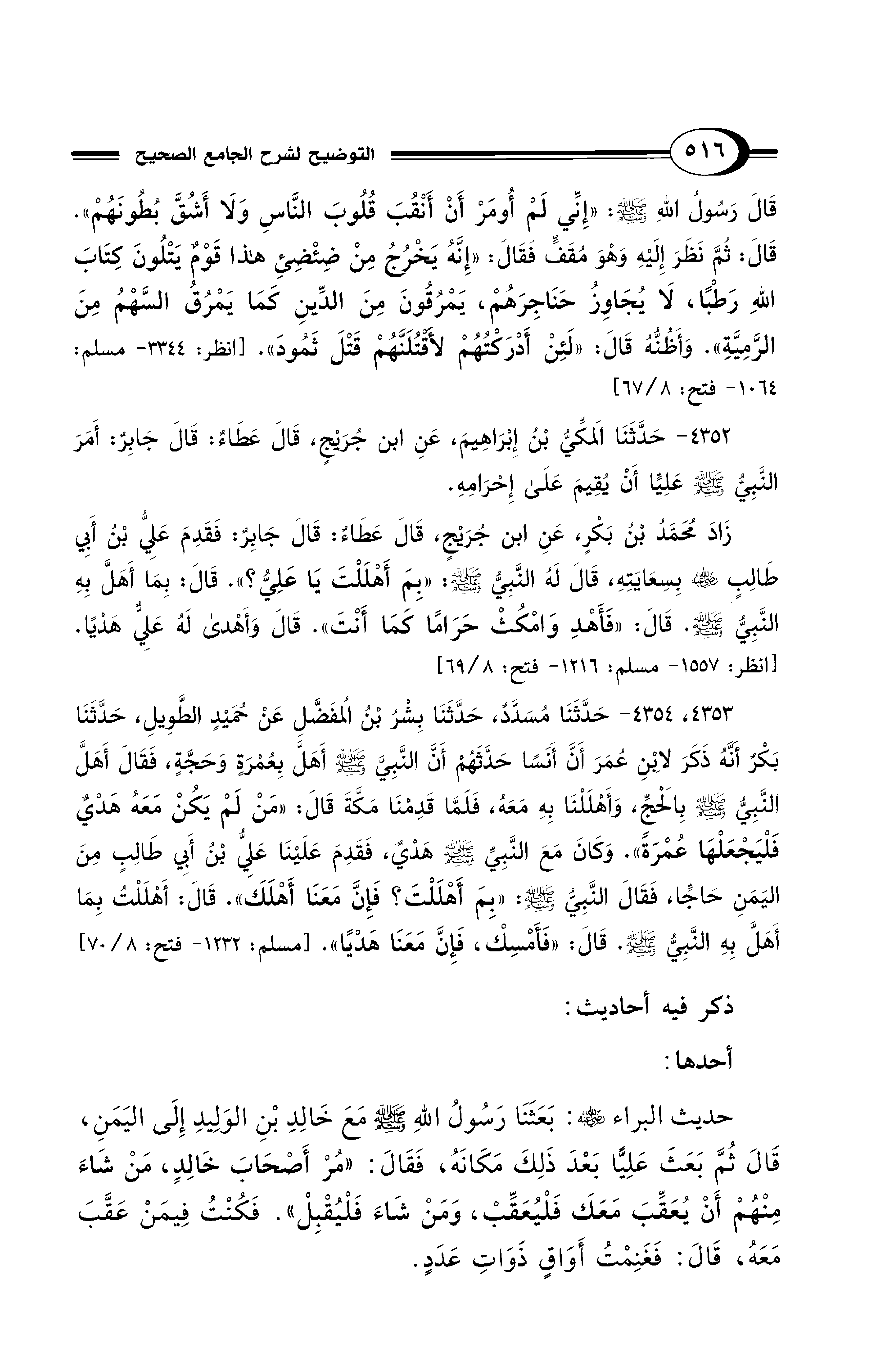 4354,4353 - حَدَّثَنَا مُسَدَّدٌ, حَدَّثَنَا بِشْرُ بْنُ الْمُفَضَّلِ عَنْ حُمَيْدٍ الطَّوِيلِ ,حَدَّثَنَا بَكْرٌ أَنَّهُ ذَكَرَ لاِبْنِ عُمَرَ أَنَّ أَنَسًا حَدَّثَهُمْ أَنَّ النَّبِيَّ - صلى الله عليه وسلم - أَهَلَّ بِعُمْرَةٍ وَحَجَّةٍ، فَقَالَ أَهَلَّ النَّبِيُّ - صلى الله عليه وسلم - بِالْحَجِّ، وَأَهْلَلْنَا بِهِ مَعَهُ، فَلَمَّا قَدِمْنَا مَكَّةَ قَالَ: "مَنْ لَمْ يَكُنْ مَعَهُ هَدْيٌ فَلْيَجْعَلْهَا عُمْرَةً". وَكَانَ مَعَ النَّبِيِّ - صلى الله عليه وسلم - هَدْيٌ، فَقَدِمَ عَلَيْنَا عَلِيُّ بْنُ أَبِي طَالِبٍ مِنَ الْيَمَنِ حَاجًّا, فَقَالَ النَّبِيُّ - صلى الله عليه وسلم -: "بِمَ أَهْلَلْتَ؟ فَإِنَّ مَعَنَا أَهْلَكَ". قَالَ: أَهْلَلْتُ بِمَا أَهَلَّ بِهِ النَّبِيُّ - صلى الله عليه وسلم -. قَالَ: "فَأَمْسِكْ، فَإِنَّ مَعَنَا هَدْيًا". [مسلم: 1232 - فتح: 8/ 70]