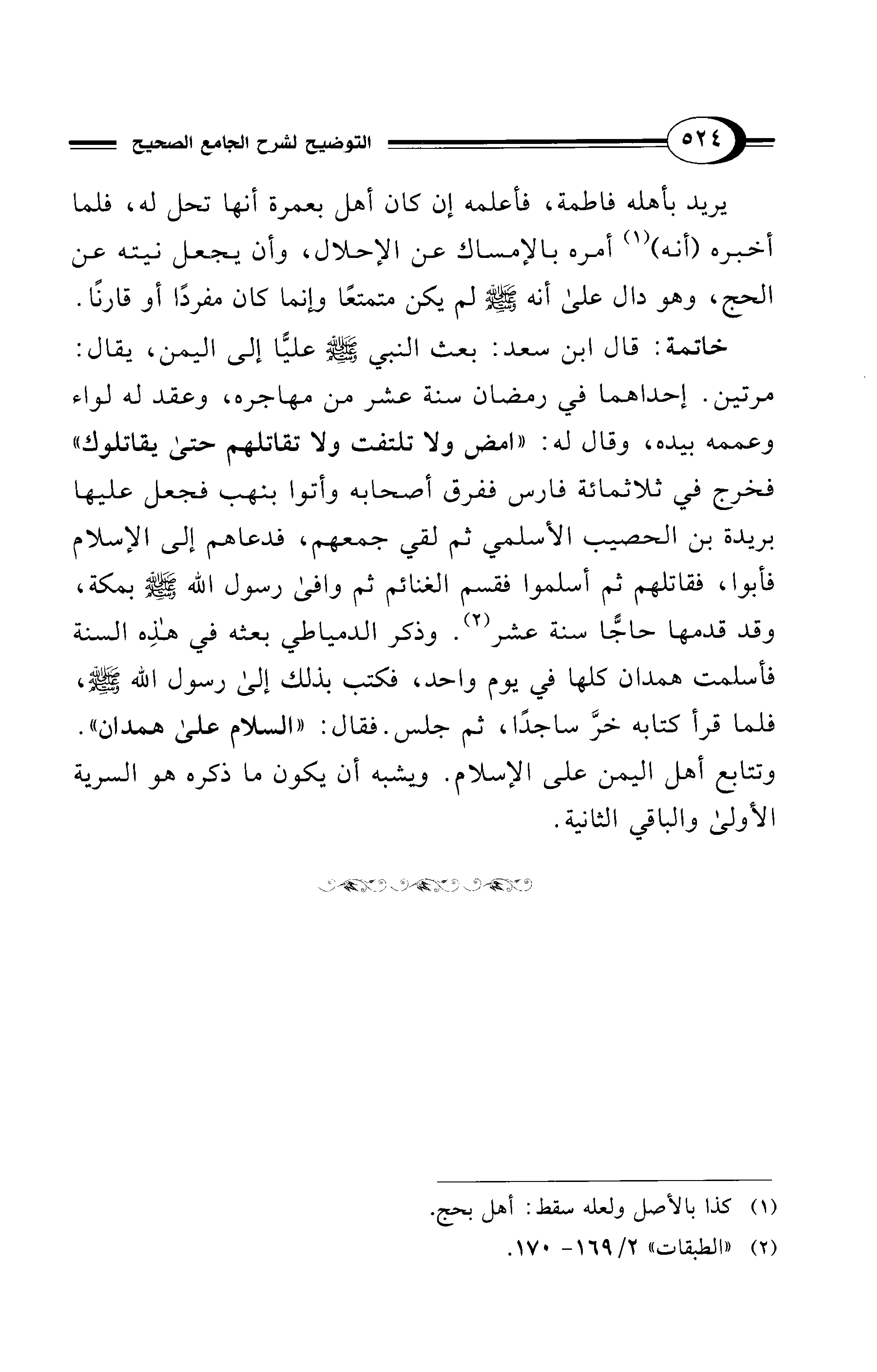 خاتمة: قال ابن سعد: بعث النبي - صلى الله عليه وسلم - عليًّا إلى اليمن، يقال: مرتين. إحداهما في رمضان سنة عشر من مهاجره، وعقد له لواء وعممه بيده، وقال له: "امض ولا تلتفت ولا تقاتلهم حتى يقاتلوك" فخرج في ثلاثمائة فارس ففرق أصحابه وأتوا بنهب فجعل عليها بريدة بن الحصيب الأسلمي ثم لقي جمعهم، فدعاهم إلى الإسلام فأبوا، فقاتلهم ثم أسلموا فقسم الغنائم ثم وافى رسول الله - صلى الله عليه وسلم - بمكة، وقد قدمها حاجًّا سنة عشر (¬2). وذكر الدمياطي بعثه في هذِه السنة فأسلمت همدان كلها في يوم واحد، فكتب بذلك إلى رسول الله - صلى الله عليه وسلم -، فلما قرأ كتابه خرَّ ساجدًا، ثم جلس. فقال: "السلام على همدان". وتتابع أهل اليمن على الإسلام. ويشبه أن يكون ما ذكره هو السرية الأولئ والباقي الثانية.