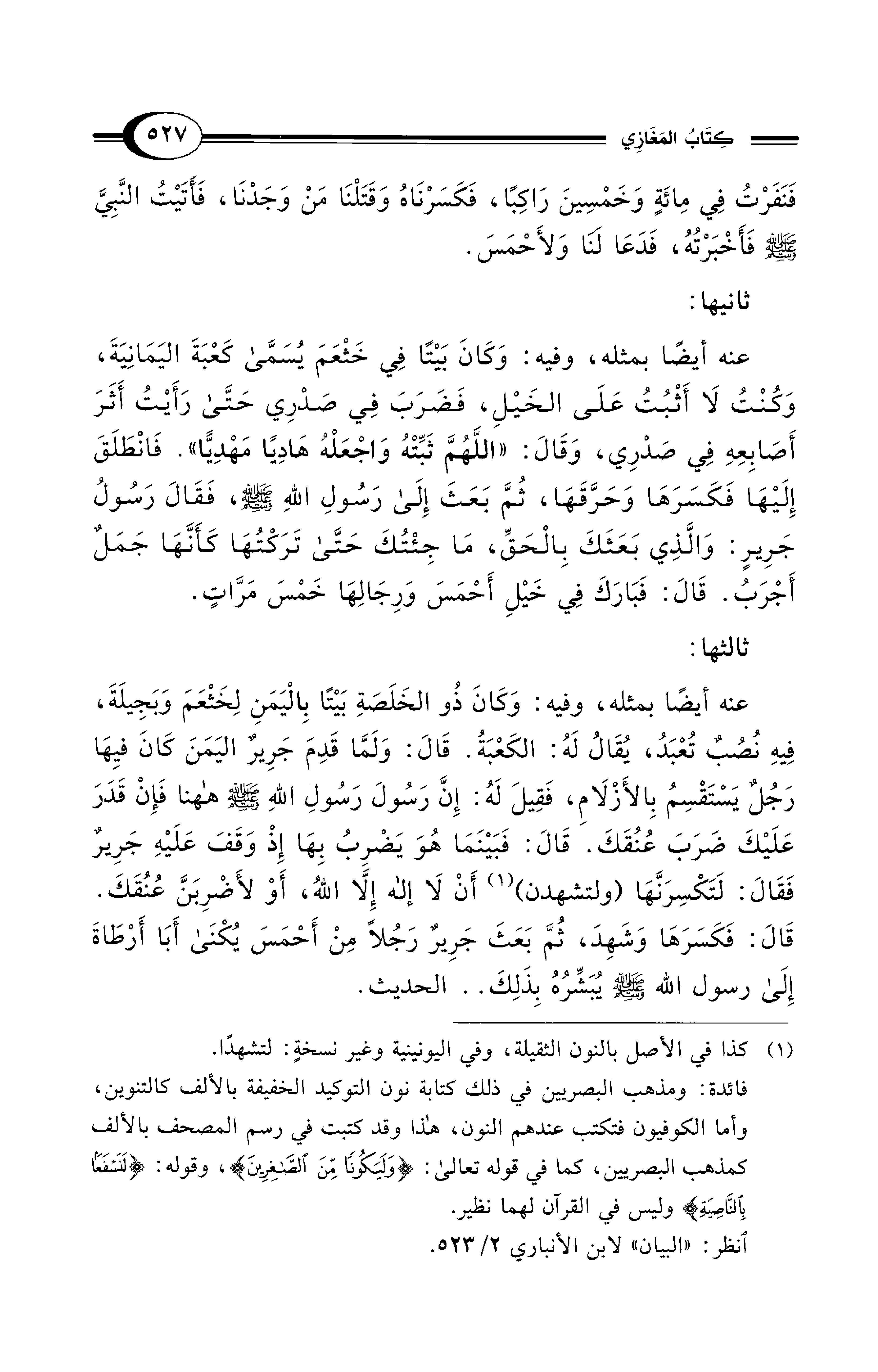 عنه أيضًا بمثله، وفيه: وَكَانَ بَيْتًا فِي خَثْعَمَ يُسَمَّى كَعْبَةَ اليَمَانِيَةَ، وَكُنْتُ لَا أَثْبُتُ عَلَى الخَيْلِ، فَضرَبَ فِي صَدْرِي حَتَّى رَأَيْتُ أَثَرَ أَصَابِعِهِ فِي صَدْرِي، وَقَالَ: "اللَّهُمَّ ثَبِّتْهُ وَاجْعَلْهُ هَادِيًا مَهْدِيًّا". فَانْطَلَقَ إِلَيْهَا فَكَسَرَهَا وَحَرَّقَهَا، ثُمَّ بَعَثَ إِلَى رَسُولِ اللهِ - صلى الله عليه وسلم -، فَقَالَ رَسُولُ جَرِيرٍ: وَالَّذِي بَعَثَكَ بِالْحَقِّ، مَا جِئْتُكَ حَتَّى تَرَكْتُهَا كَأَنَّهَا جَمَلٌ أَجْرَبُ. قَالَ: فَبَارَكَ فِي خَيْلِ أَحْمَسَ وَرِجَالِهَا خَمْسَ مَرَّاتٍ.