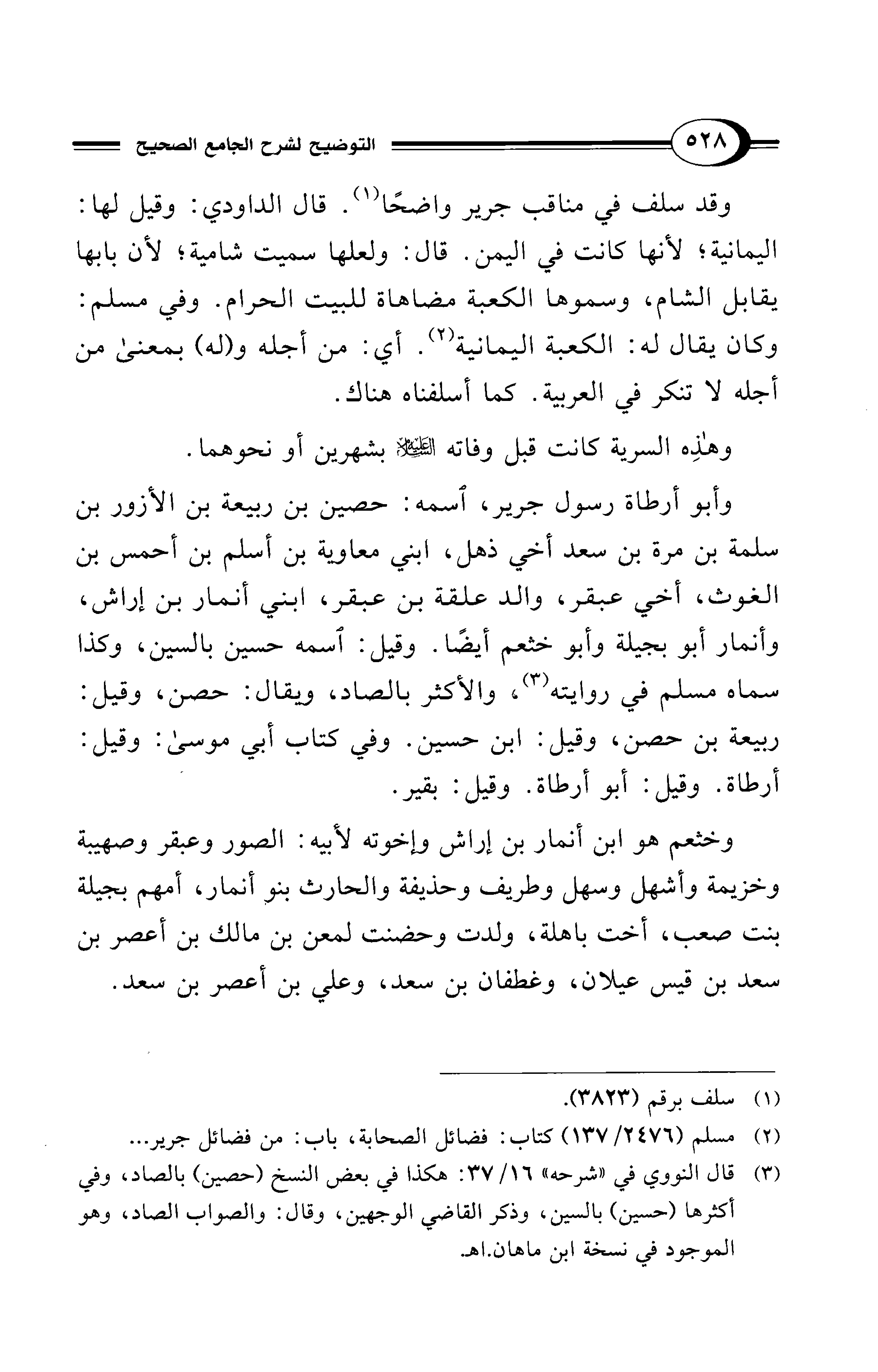وأبو أرطاة رسول جرير، اسمه: حصين بن ربيعة بن الأزور بن سلمة بن مرة بن سعد أخي ذهل، ابني معاوية بن أسلم بن أحمس بن الغوث، أخي عبقر، والد علقة بن عبقر، ابني أنمار بن إراش، وأنمار أبو بجيلة وأبو خثعم أيضًا. وقيل: اسمه حسين بالسين، وكذا سماه مسلم في روايته (¬3)، والأكثر بالصاد، ويقال: حصن، وقيل: ربيعة بن حصن، وقيل: ابن حسين. وفي كتاب أبي موسى: وقيل: أرطاة. وقيل: أبو أرطاة. وقيل: بقير.