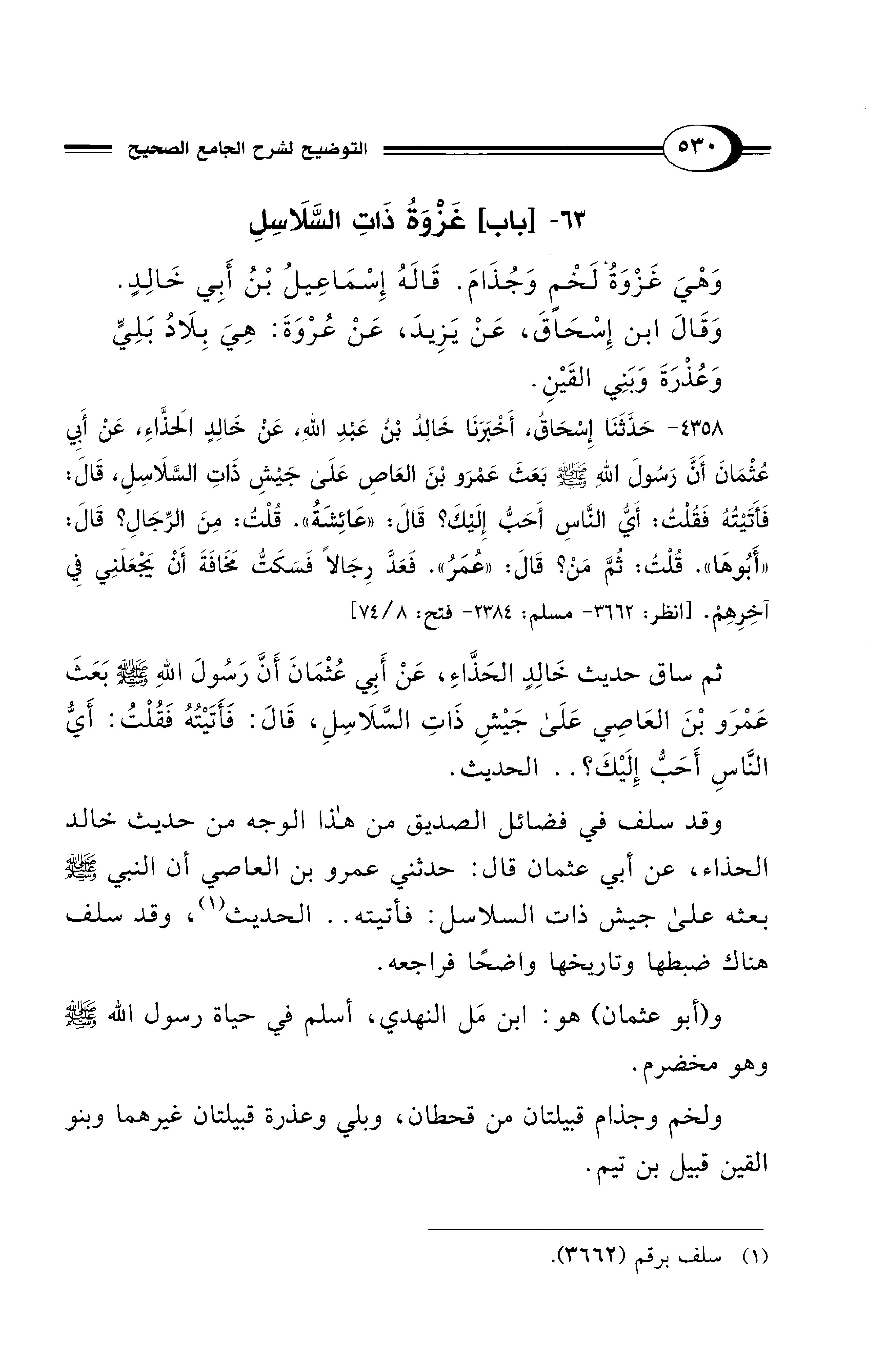 ثم ساق حديث خَالِدٍ الحَذَّاءِ، عَنْ أَبِي عُثْمَانَ أَنَّ رَسُولَ الله - صلى الله عليه وسلم - بَعَثَ عَمْرَو بْنَ العَاصِي عَلَى جَيْشِ ذَاتِ السَّلَاسِلِ، قَالَ: فَأَتَيْتُهُ فَقُلْتُ: أَيُّ النَّاسِ أَحَبُّ إِلَيْكَ؟ .. الحديث.