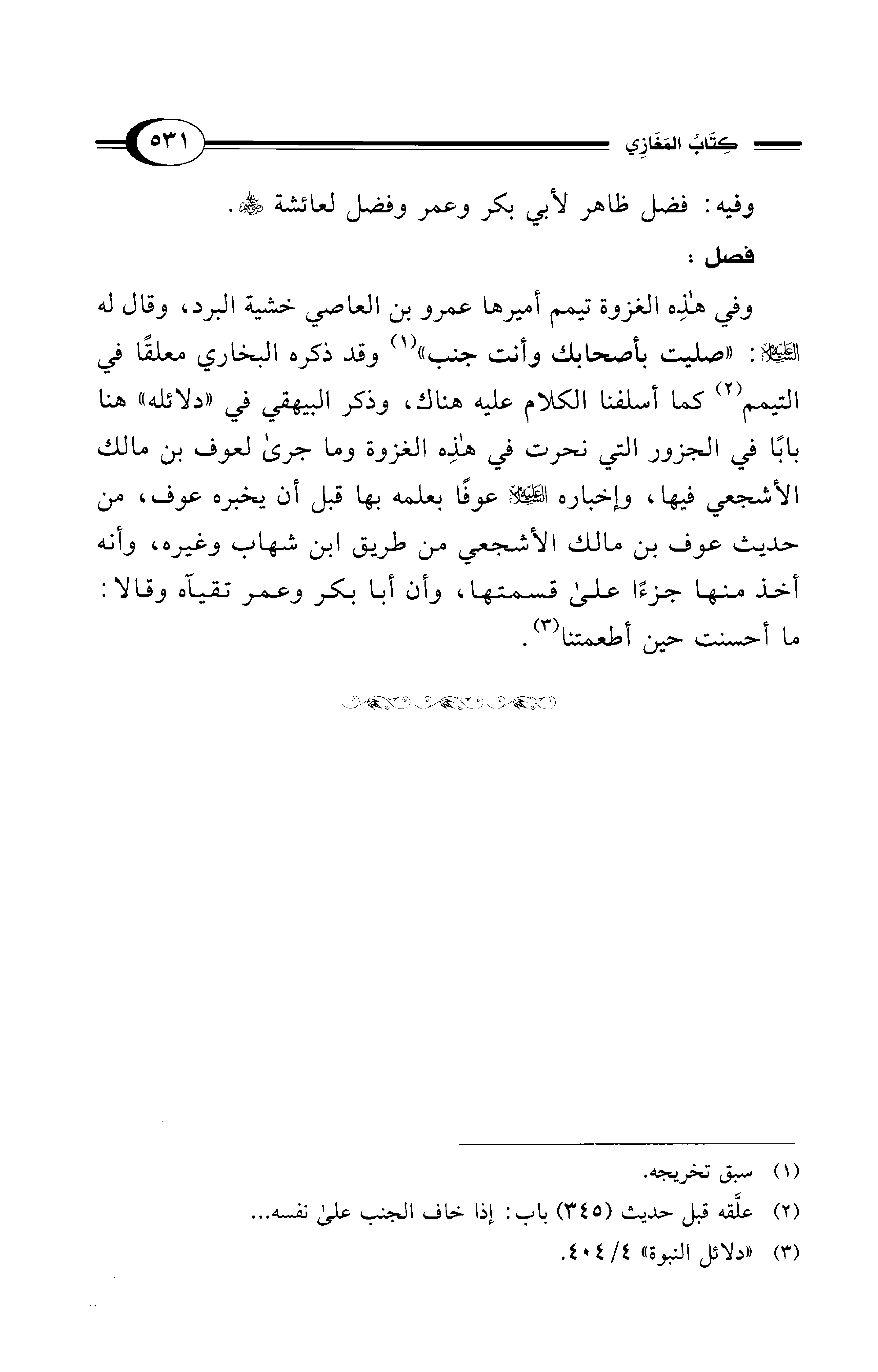 وفي هذِه الغزوة تيمم أميرها عمرو بن العاصي خشية البرد، وقال له - عليه السلام -: "صليت بأصحابك وأنت جنب" (¬1) وقد ذكره البخاري معلقًا في التيمم (¬2) كما أسلفنا الكلام عليه هناك، وذكر البيهقي في "دلائله" هنا بابًا في الجزور التي نحرت في هذِه الغزوة وما جرى لعوف بن مالك الأشجعي فيها، وإخباره - عليه السلام - عوفًا بعلمه بها قبل أن يخبره عوف، من حديث عوف بن مالك الأشجعي من طريق ابن شهاب وغيره، وأنه أخذ منها جزءًا على قسمتها، وأن أبا بكر وعمر تقيآه وقالا: ما أحسنت حين أطعمتنا (¬3).