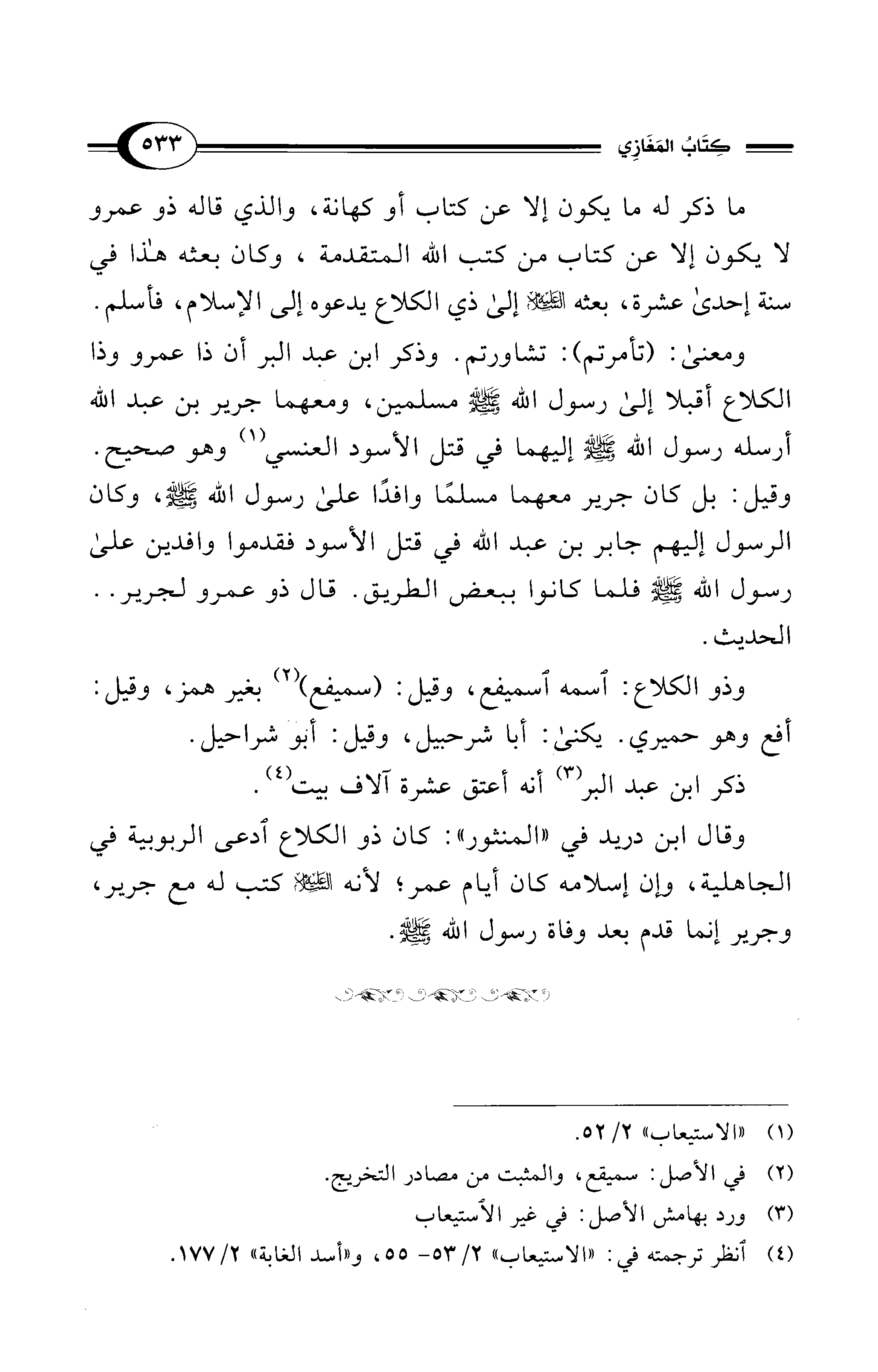 وقال ابن دريد في "المنثور": كان ذو الكلاع ادعى الربوبية في الجاهلية، وإن إسلامه كان أيام عمر؛ لأنه - عليه السلام - كتب له مع جرير، وجرير إنما قدم بعد وفاة رسول الله - صلى الله عليه وسلم -.