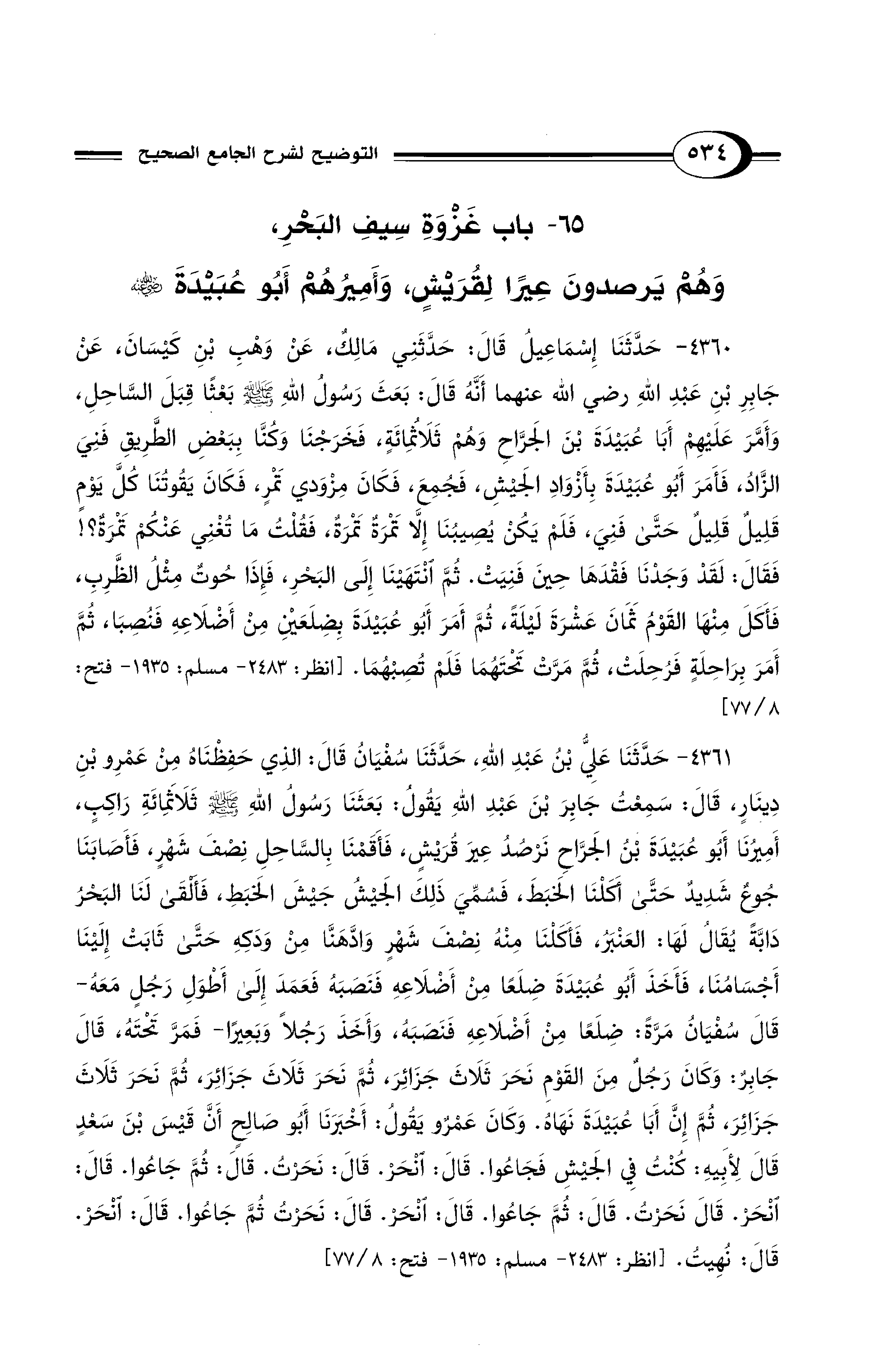 4361 - حَدَّثَنَا عَلِيُّ بْنُ عَبْدِ اللهِ, حَدَّثَنَا سُفْيَانُ قَالَ: الَّذِي حَفِظْنَاهُ مِنْ عَمْرِو بْنِ دِينَارٍ, قَالَ: سَمِعْتُ جَابِرَ بْنَ عَبْدِ اللهِ يَقُولُ: بَعَثَنَا رَسُولُ اللهِ - صلى الله عليه وسلم - ثَلاَثَمِائَةِ رَاكِبٍ, أَمِيرُنَا أَبُو عُبَيْدَةَ بْنُ الْجَرَّاحِ نَرْصُدُ عِيرَ قُرَيْشٍ، فَأَقَمْنَا بِالسَّاحِلِ نِصْفَ شَهْرٍ, فَأَصَابَنَا جُوعٌ شَدِيدٌ حَتَّى أَكَلْنَا الْخَبَطَ، فَسُمِّىَ ذَلِكَ الْجَيْشُ جَيْشَ الْخَبَطِ، فَأَلْقَى لَنَا الْبَحْرُ دَابَّةً يُقَالُ لَهَا: الْعَنْبَرُ، فَأَكَلْنَا مِنْهُ نِصْفَ شَهْرٍ وَادَّهَنَّا مِنْ وَدَكِهِ حَتَّى ثَابَتْ إِلَيْنَا أَجْسَامُنَا، فَأَخَذَ أَبُو عُبَيْدَةَ ضِلَعًا مِنْ أَضْلاَعِهِ فَنَصَبَهُ فَعَمَدَ إِلَى أَطْوَلِ رَجُلٍ مَعَهُ -قَالَ سُفْيَانُ مَرَّةً: ضِلَعًا مِنْ أَعْضَائِهِ فَنَصَبَهُ, وَأَخَذَ رَجُلاً وَبَعِيرًا- فَمَرَّ تَحْتَهُ, قَالَ جَابِرٌ: وَكَانَ رَجُلٌ مِنَ الْقَوْمِ نَحَرَ ثَلاَثَ جَزَائِرَ، ثُمَّ نَحَرَ ثَلاَثَ جَزَائِرَ، ثُمَّ نَحَرَ ثَلاَثَ جَزَائِرَ، ثُمَّ إِنَّ أَبَا عُبَيْدَةَ نَهَاهُ. وَكَانَ عَمْرٌو يَقُولُ: أَخْبَرَنَا أَبُو صَالِحٍ أَنَّ قَيْسَ بْنَ سَعْدٍ قَالَ لأَبِيهِ: كُنْتُ فِي الْجَيْشِ فَجَاعُوا. قَالَ: انْحَرْ. قَالَ: نَحَرْتُ. قَالَ: ثُمَّ جَاعُوا قَالَ: انْحَرْ. قَالَ: نَحَرْتُ. قَالَ: ثُمَّ جَاعُوا. قَالَ: انْحَرْ. قَالَ: نَحَرْتُ ثُمَّ جَاعُوا. قَالَ: انْحَرْ. قَالَ: نُهِيتُ. [انظر: 2483 - مسلم: 1935 - فتح: 8/ 77]