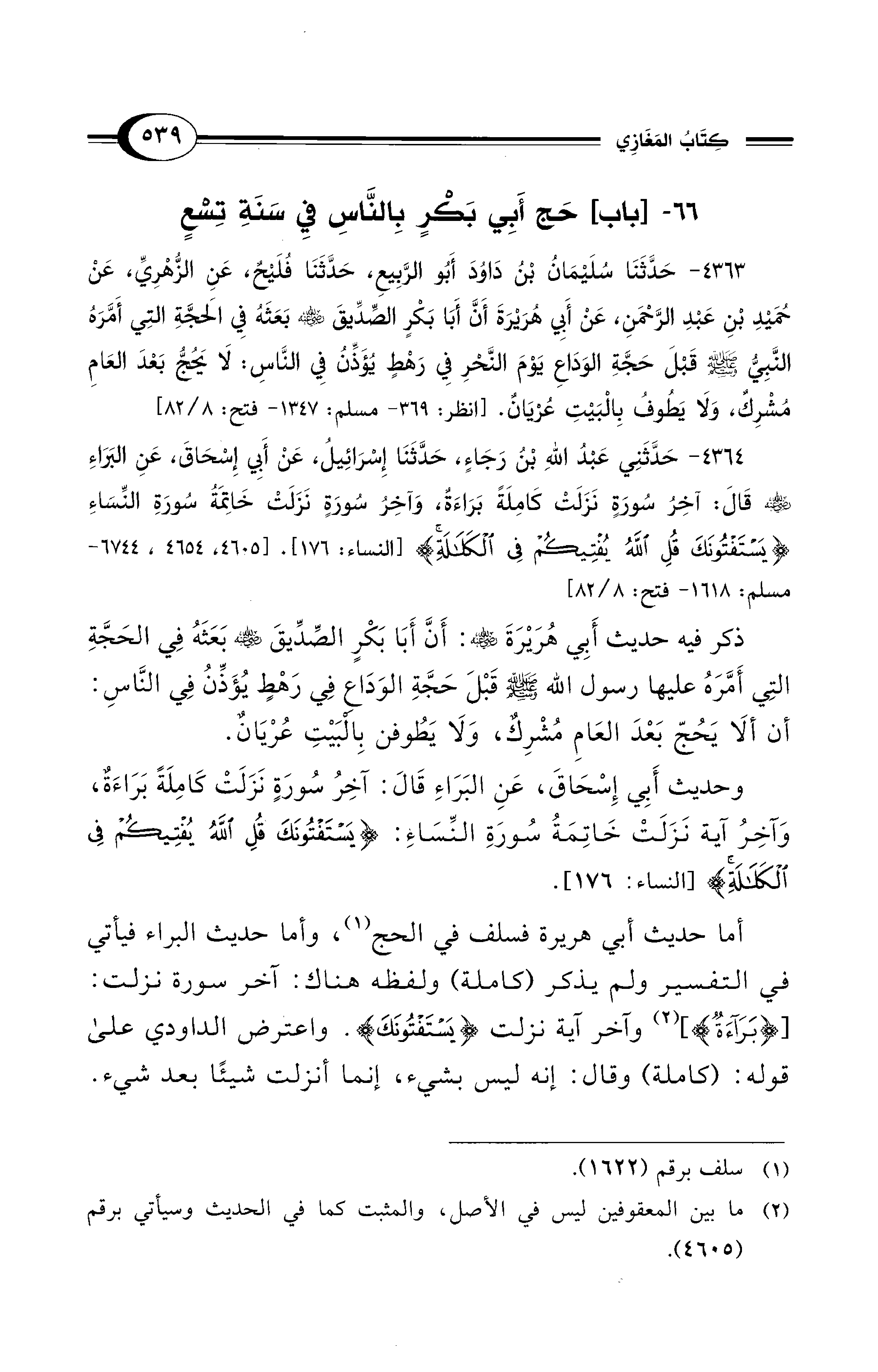 وحديث أَبِي إِسْحَاقَ، عَنِ البَرَاءِ قَالَ: آخِرُ سُورَةٍ نَزَلَتْ كَامِلَةً بَرَاءَةٌ، وَآخِرُ آية نَزَلَتْ خَاتِمَةُ سُورَةِ النِّسَاءِ: {يَسْتَفْتُونَكَ قُلِ اللهُ يُفْتِيكُمْ فِي الْكَلَالَةِ} [النساء: 176].