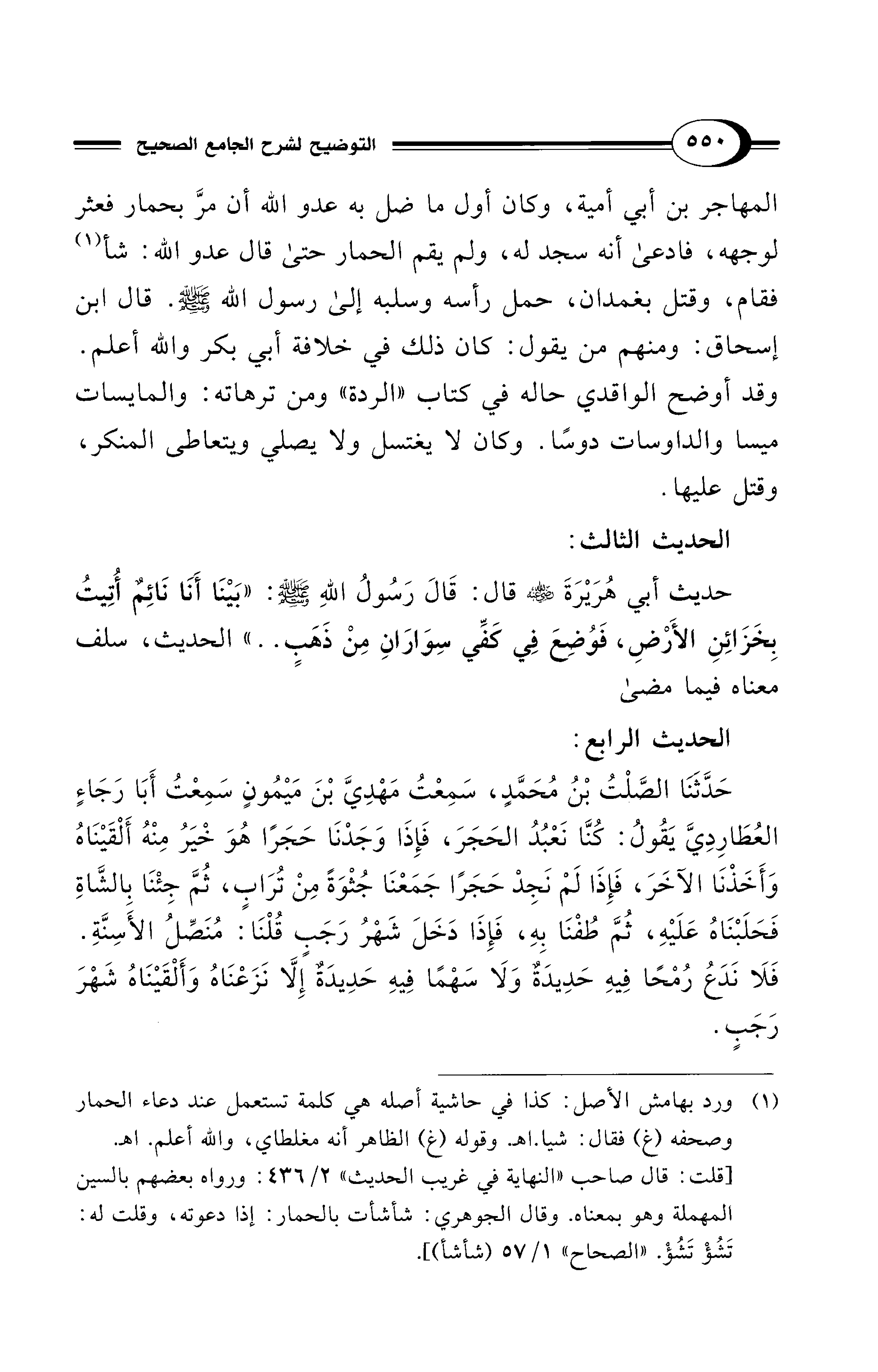 حديث أبي هُرَيْرَةَ - رضي الله عنه - قال: قَالَ رَسُولُ اللهِ - صلى الله عليه وسلم - "بَيْنَا أَنَا نَائِمٌ أُتِيتُ بِخَزَائِنِ الأَرْضِ، فَوُضِعَ فِي كَفِّي سِوَارَانِ مِنْ ذَهَبٍ .. " الحديث، سلف معناه فيما مضى