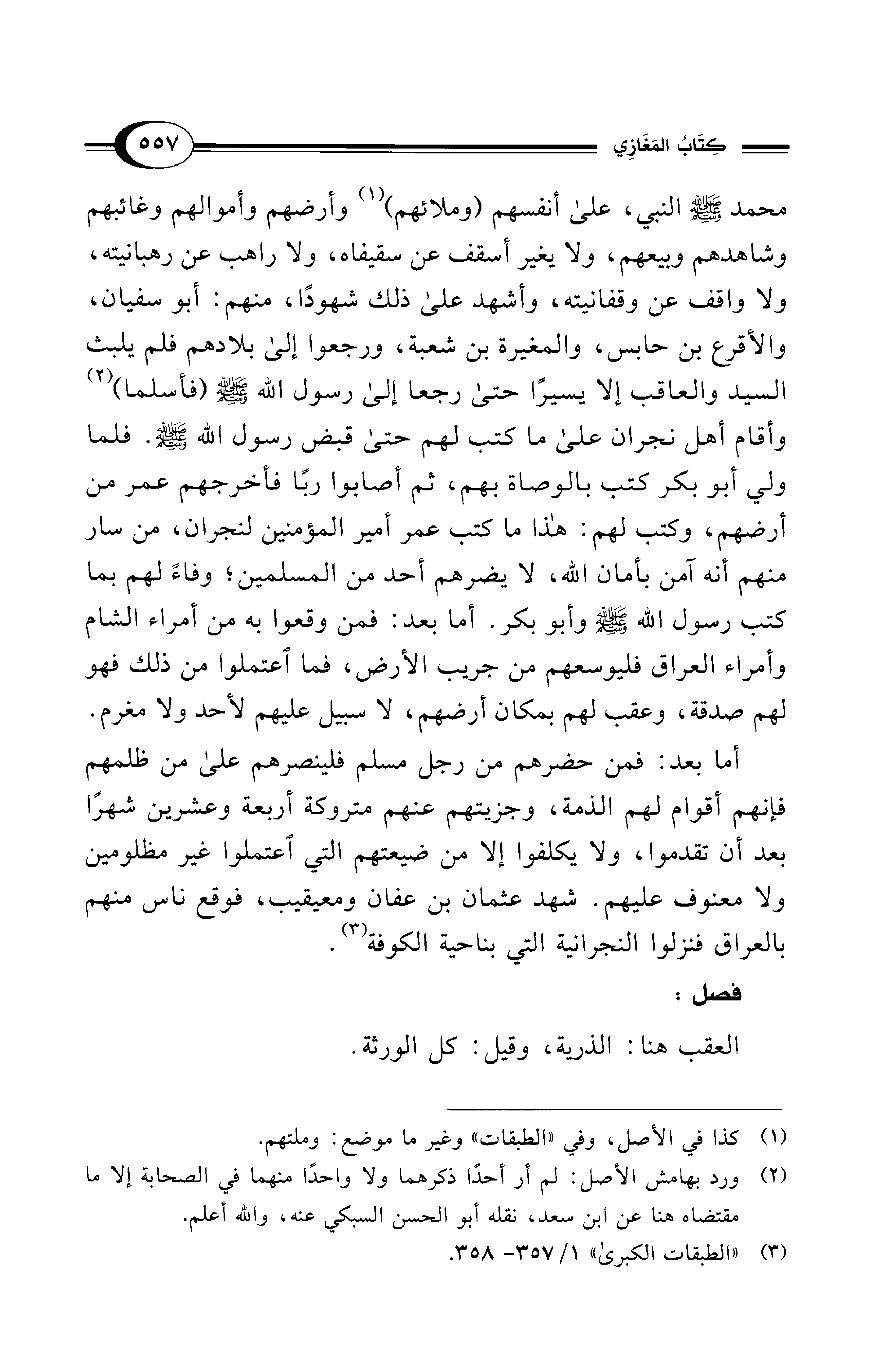 أما بعد: فمن حضرهم من رجل مسلم فلينصرهم على من ظلمهم فإنهم أقوام لهم الذمة، وجزيتهم عنهم متروكة أربعة وعشرين شهرًا بعد أن تقدموا، ولا يكلفوا إلا من ضيعتهم التي اعتملوا غير مظلومين ولا معنوف عليهم. شهد عثمان بن عفان ومعيقيب، فوقع ناس منهم بالعراق فنزلوا النجرانية التي بناحية الكوفة (¬3).