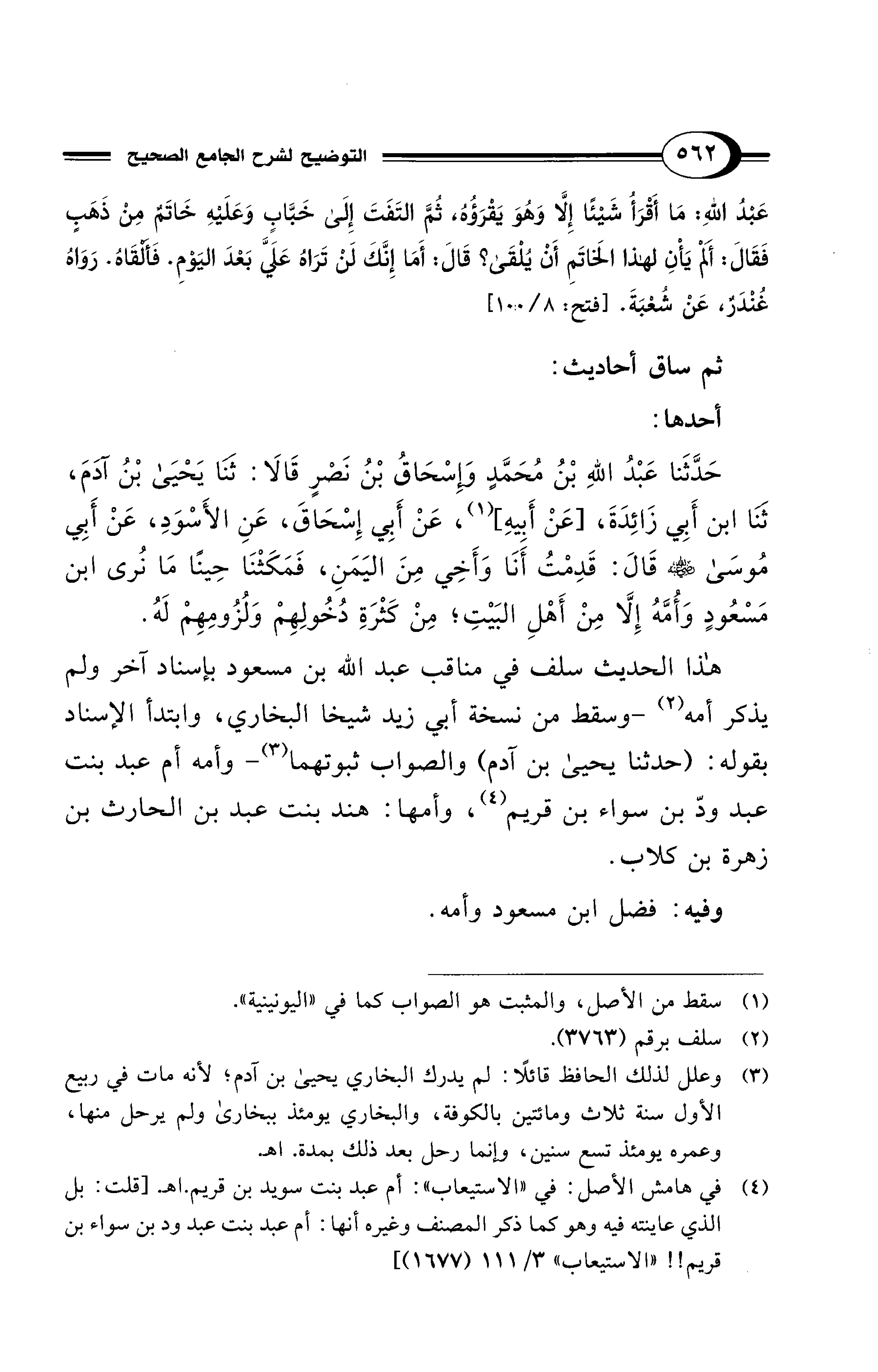 (¬3) وعلل لذلك الحافظ قائلًا: لم يدرك البخاري يحيى بن آدم؛ لأنه مات في ربيع الأول سنة ثلاث ومائتين بالكوفة، والبخاري يومئذ ببخارى ولم يرحل منها، وعمره يومئذ تسع سنين، وإنما رحل بعد ذلك بمدة. اهـ.
