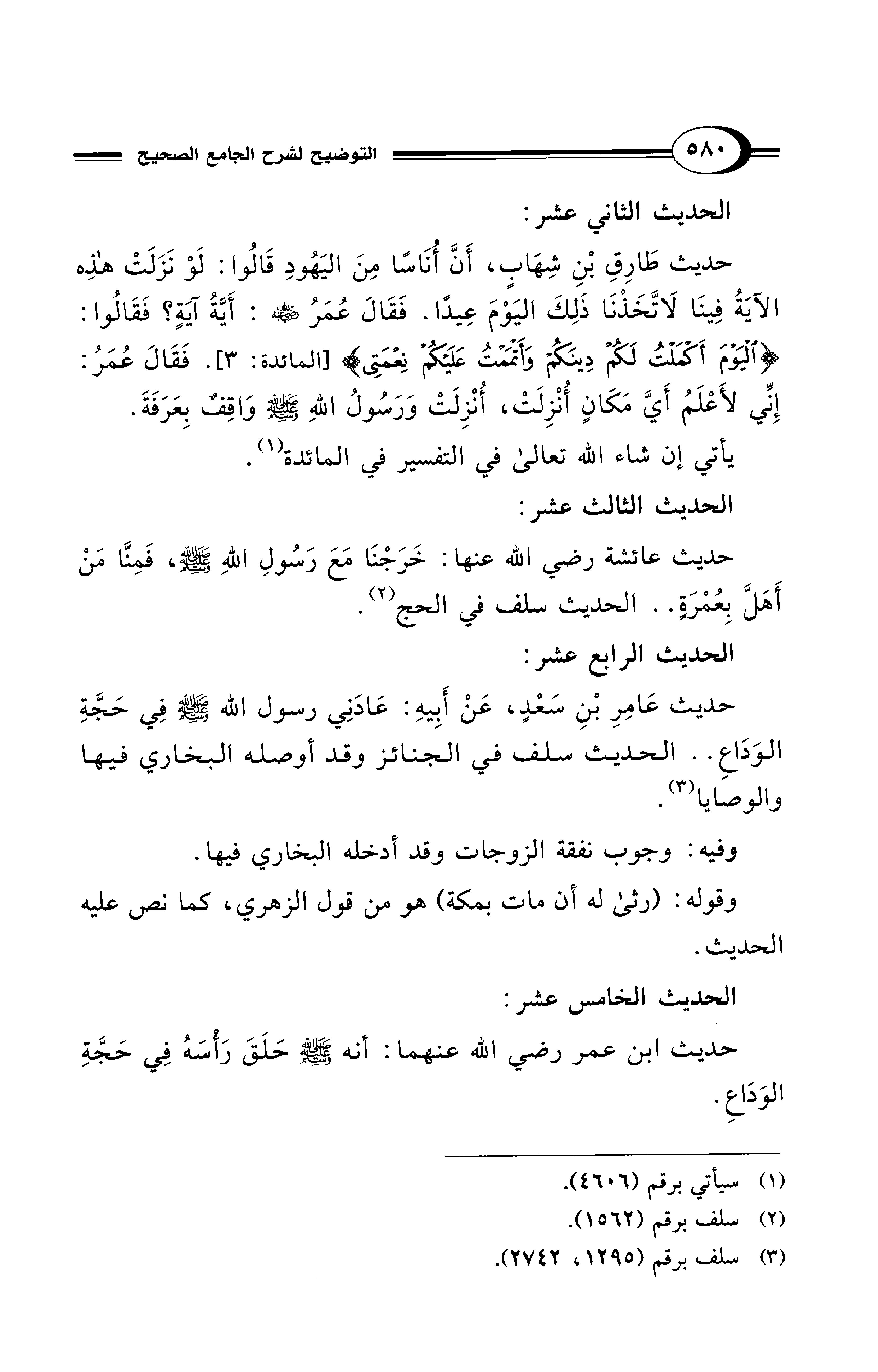 حديث عائشة رضي الله عنها: خَرَجْنَا مَعَ رَسُولِ اللهِ - صلى الله عليه وسلم -، فَمِنَّا مَنْ أَهَل بِعُمْرَةٍ .. الحديث سلف في الحج (¬2).