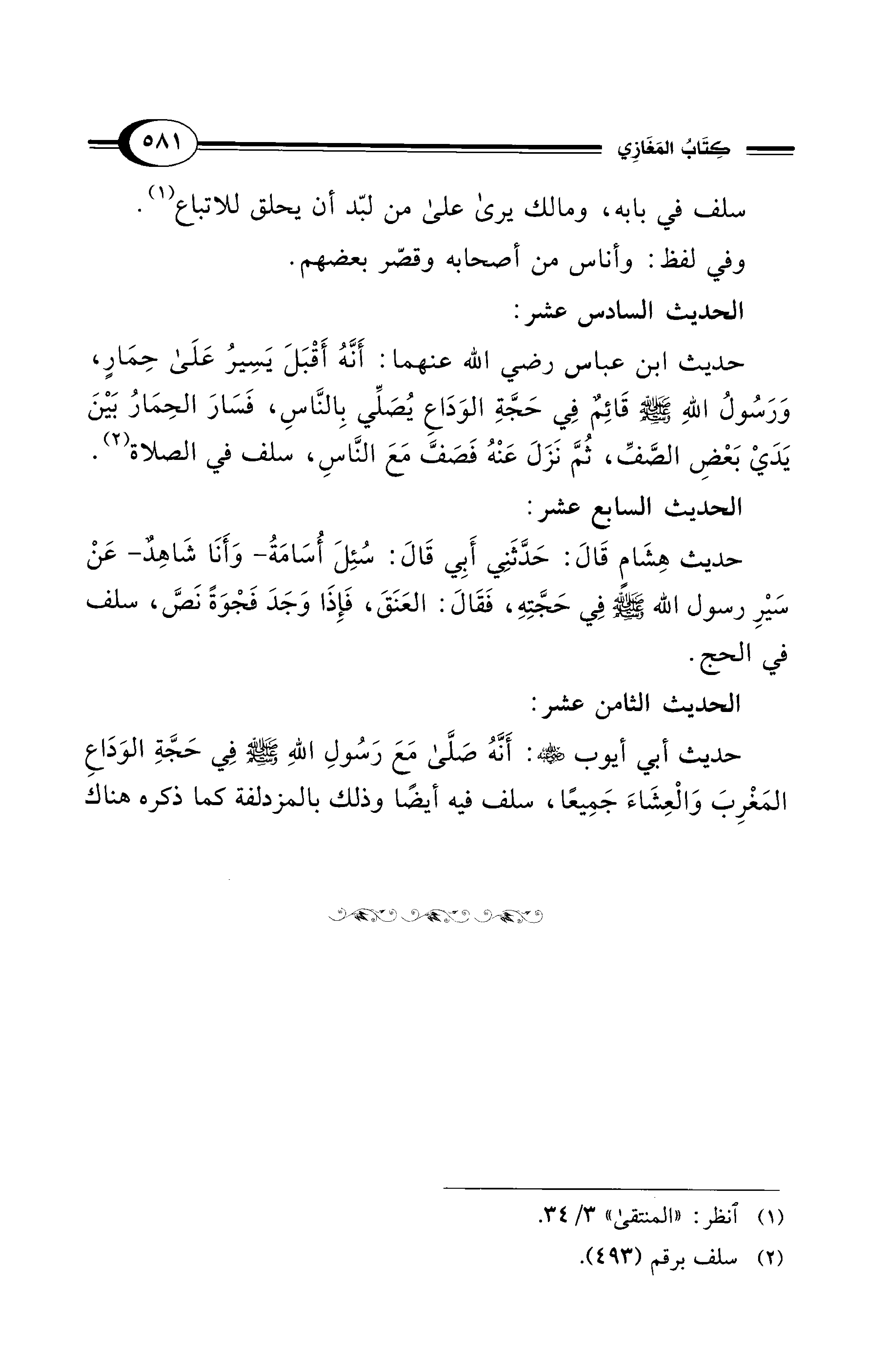 حديث هِشَامٍ قَالَ: حَدَّثَنِي أَبِي قَالَ: سُئِلَ أُسَامَةُ -وَأَنَا شَاهِدٌ- عَنْ سَيْرِ رسول الله - صلى الله عليه وسلم - فِي حَجَّتِهِ، فَقَالَ: العَنَقَ، فَإِذَا وَجَدَ فَجْوَةً نَصَّ، سلف في الحج.