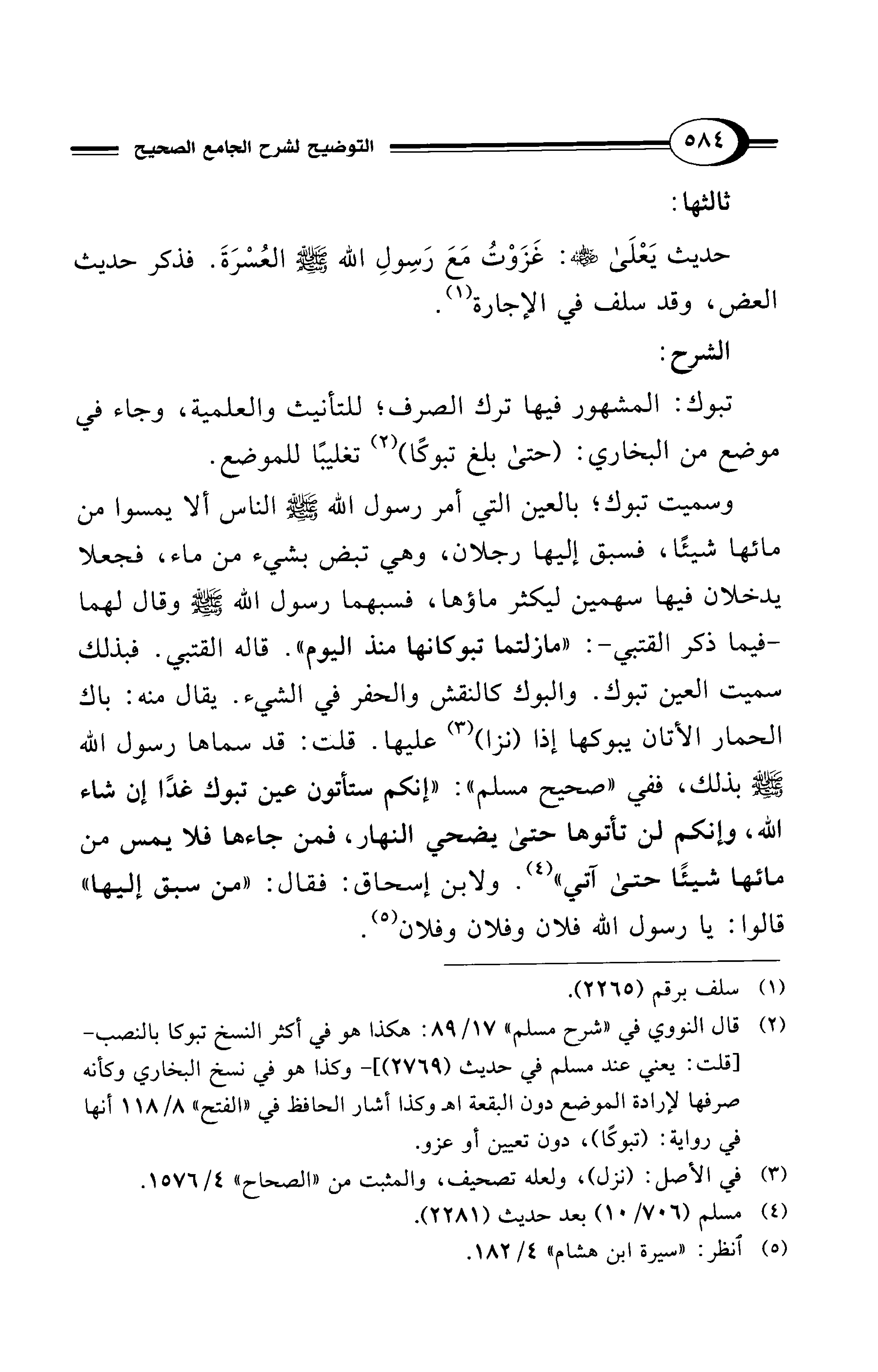 (¬2) قال النووي في "شرح مسلم" 17/ 89: هكذا هو في أكثر النسخ تبوكا بالنصب -[قلت: يعني عند مسلم في حديث (2769)]- وكذا هو في نسخ البخاري وكأنه صرفها لإرادة الموضع دون البقعة اهـ وكذا أشار الحافظ في "الفتح" 8/ 118 أنها في رواية: (تبوكًا)، دون تعيين أو عزو.