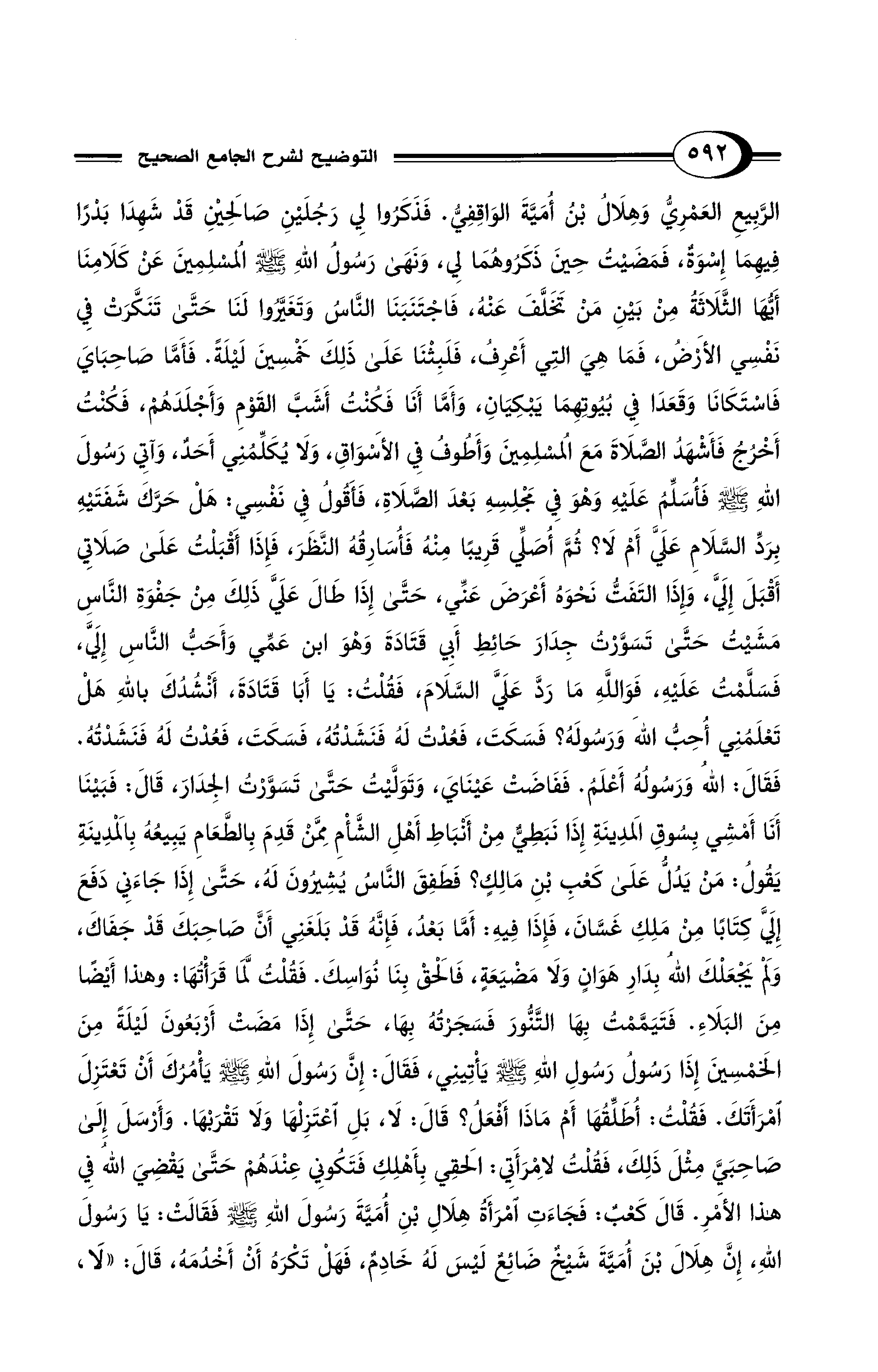 الرَّبِيعِ الْعَمْرِيُّ وَهِلاَلُ بْنُ أُمَيَّةَ الْوَاقِفِيُّ. فَذَكَرُوا لِي رَجُلَيْنِ صَالِحَيْنِ قَدْ شَهِدَا بَدْرًا فِيهِمَا إِسْوَةٌ، فَمَضَيْتُ حِينَ ذَكَرُوهُمَا لِي، وَنَهَى رَسُولُ اللهِ - صلى الله عليه وسلم - الْمُسْلِمِينَ عَنْ كَلاَمِنَا أَيُّهَا الثَّلاَثَةُ مِنْ بَيْنِ مَنْ تَخَلَّفَ عَنْهُ، فَاجْتَنَبَنَا النَّاسُ وَتَغَيَّرُوا لَنَا حَتَّى تَنَكَّرَتْ فِي نَفْسِي الأَرْضُ، فَمَا هِيَ الَّتِي أَعْرِفُ، فَلَبِثْنَا عَلَى ذَلِكَ خَمْسِينَ لَيْلَةً. فَأَمَّا صَاحِبَايَ فَاسْتَكَانَا وَقَعَدَا فِي بُيُوتِهِمَا يَبْكِيَانِ، وَأَمَّا أَنَا فَكُنْتُ أَشَبَّ الْقَوْمِ وَأَجْلَدَهُمْ، فَكُنْتُ أَخْرُجُ فَأَشْهَدُ الصَّلاَةَ مَعَ الْمُسْلِمِينَ وَأَطُوفُ فِي الأَسْوَاقِ، وَلاَ يُكَلِّمُنِي أَحَدٌ، وَآتِى رَسُولَ اللهِ - صلى الله عليه وسلم - فَأُسَلِّمُ عَلَيْهِ وَهْوَ فِي مَجْلِسِهِ بَعْدَ الصَّلاَةِ، فَأَقُولُ فِي نَفْسِي: هَلْ حَرَّكَ شَفَتَيْهِ بِرَدِّ السَّلاَمِ عَلَيَّ أَمْ لاَ؟ ثُمَّ أُصَلِّي قَرِيبًا مِنْهُ فَأُسَارِقُهُ النَّظَرَ، فَإِذَا أَقْبَلْتُ عَلَى صَلاَتِي أَقْبَلَ إِلَيَّ، وَإِذَا الْتَفَتُّ نَحْوَهُ أَعْرَضَ عَنِّي، حَتَّى إِذَا طَالَ عَلَيَّ ذَلِكَ مِنْ جَفْوَةِ النَّاسِ مَشَيْتُ حَتَّى تَسَوَّرْتُ جِدَارَ حَائِطِ أَبِي قَتَادَةَ وَهْوَ ابْنُ عَمِّي وَأَحَبُّ النَّاسِ إِلَيَّ، فَسَلَّمْتُ عَلَيْهِ، فَوَاللهِ مَا رَدَّ عَلَيَّ السَّلاَمَ، فَقُلْتُ: يَا أَبَا قَتَادَةَ، أَنْشُدُكَ بِاللهِ هَلْ تَعْلَمُنِي أُحِبُّ اللهَ وَرَسُولَهُ؟ فَسَكَتَ، فَعُدْتُ لَهُ فَنَشَدْتُهُ, فَسَكَتَ، فَعُدْتُ لَهُ فَنَشَدْتُهُ. فَقَالَ: اللهُ وَرَسُولُهُ أَعْلَمُ. فَفَاضَتْ عَيْنَايَ, وَتَوَلَّيْتُ حَتَّى تَسَوَّرْتُ الْجِدَارَ، قَالَ: فَبَيْنَا أَنَا أَمْشِي بِسُوقِ الْمَدِينَةِ إِذَا نَبَطِيٌّ مِنْ أَنْبَاطِ أَهْلِ الشَّأْمِ مِمَّنْ قَدِمَ بِالطَّعَامِ يَبِيعُهُ بِالْمَدِينَةِ يَقُولُ: مَنْ يَدُلُّ عَلَى كَعْبِ بْنِ مَالِكٍ؟ فَطَفِقَ النَّاسُ يُشِيرُونَ لَهُ، حَتَّى إِذَا جَاءَنِي دَفَعَ إِلَيَّ كِتَابًا مِنْ مَلِكِ غَسَّانَ، فَإِذَا فِيهِ: أَمَّا بَعْدُ, فَإِنَّهُ قَدْ بَلَغَنِي أَنَّ صَاحِبَكَ قَدْ جَفَاكَ، وَلَمْ يَجْعَلْكَ اللهُ بِدَارِ هَوَانٍ وَلاَ مَضْيَعَةٍ، فَالْحَقْ بِنَا نُوَاسِكَ. فَقُلْتُ لَمَّا قَرَأْتُهَا: وَهَذَا أَيْضًا مِنَ الْبَلاَءِ. فَتَيَمَّمْتُ بِهَا التَّنُّورَ فَسَجَرْتُهُ بِهَا، حَتَّى إِذَا مَضَتْ أَرْبَعُونَ لَيْلَةً مِنَ الْخَمْسِينَ إِذَا رَسُولُ رَسُولِ اللهِ - صلى الله عليه وسلم - يَأْتِينِي, فَقَالَ: إِنَّ رَسُولَ اللهِ - صلى الله عليه وسلم - يَأْمُرُكَ أَنْ تَعْتَزِلَ امْرَأَتَكَ. فَقُلْتُ: أُطَلِّقُهَا أَمْ مَاذَا أَفْعَلُ؟ قَالَ: لاَ, بَلِ اعْتَزِلْهَا وَلاَ تَقْرَبْهَا. وَأَرْسَلَ إِلَى صَاحِبَيَّ مِثْلَ ذَلِكَ، فَقُلْتُ لاِمْرَأَتِي: الْحَقِي بِأَهْلِكِ فَتَكُونِي عِنْدَهُمْ حَتَّى يَقْضِيَ اللهُ فِي هَذَا الأَمْرِ. قَالَ كَعْبٌ: فَجَاءَتِ امْرَأَةُ هِلاَلِ بْنِ أُمَيَّةَ رَسُولَ اللهِ - صلى الله عليه وسلم - فَقَالَتْ: يَا رَسُولَ اللهِ، إِنَّ هِلاَلَ بْنَ أُمَيَّةَ شَيْخٌ ضَائِعٌ لَيْسَ لَهُ خَادِمٌ فَهَلْ تَكْرَهُ أَنْ أَخْدُمَهُ, قَالَ: "لاَ,