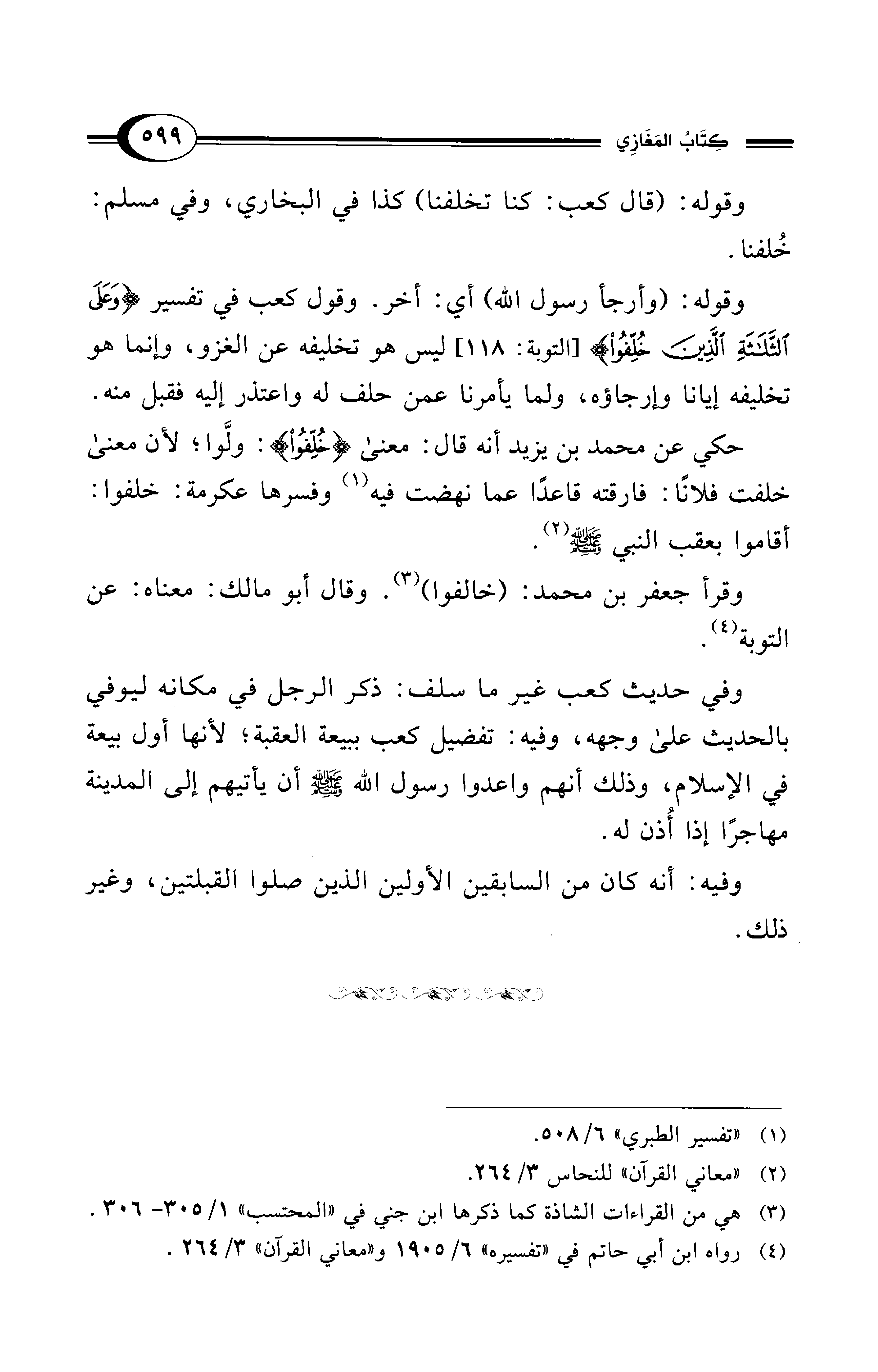 وقوله: (وأرجأ رسول الله) أي: أخر. وقول كعب في تفسير {وَعَلَى الثَّلَاثَةِ الَّذِينَ خُلِّفُوا} [التوبة: 118] ليس هو تخليفه عن الغزو، وإنما هو تخليفه إيانا وإرجاؤه، ولما يأمرنا عمن حلف له واعتذر إليه فقبل منه.