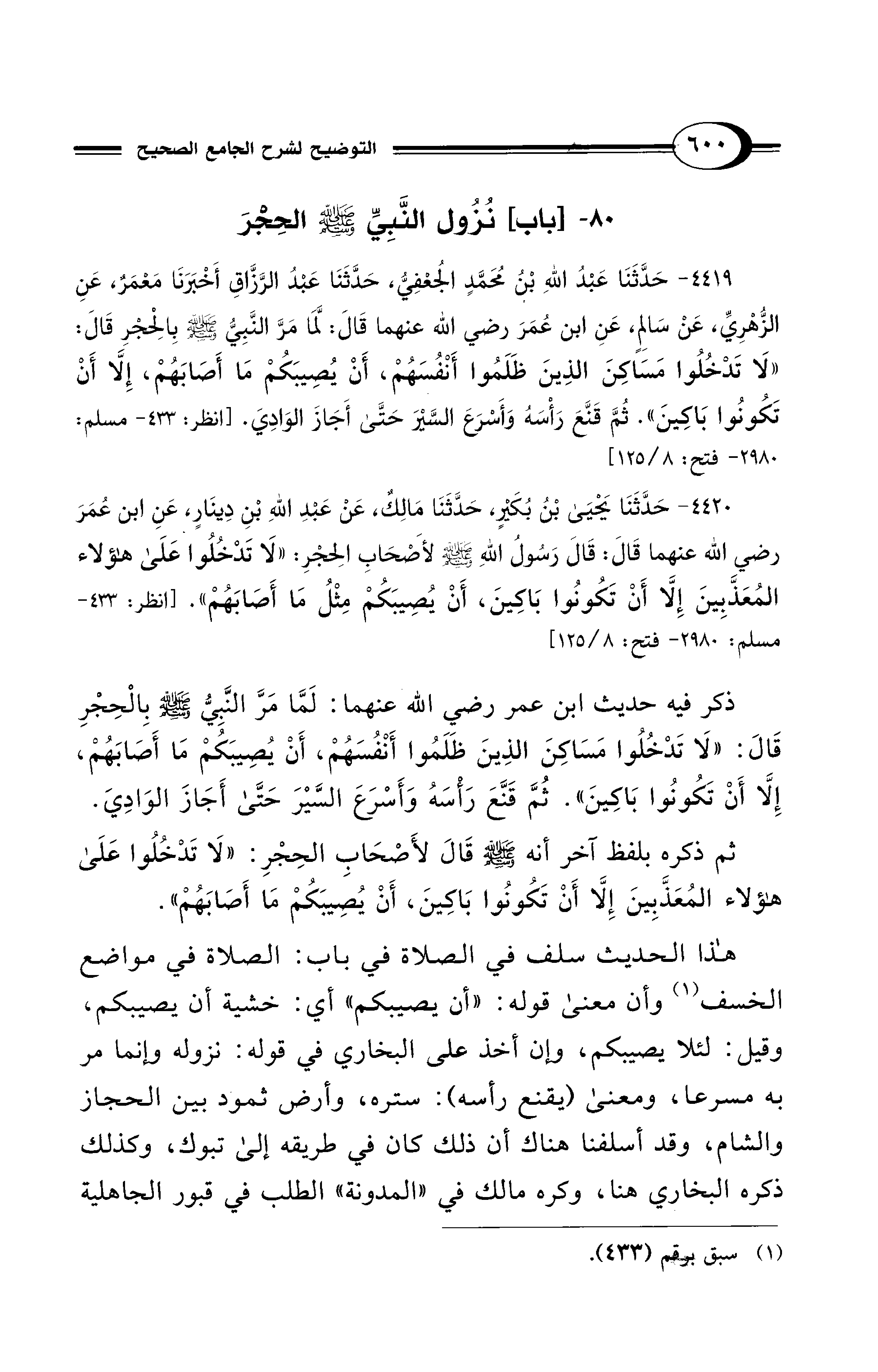 ذكر فيه حديث ابن عمر رضي الله عنهما: لَمَّا مَرَّ النَّبِيُّ - صلى الله عليه وسلم - بِالْحِجْرِ قَالَ: "لَا تَدْخُلُوا مَسَاكِنَ الذِينَ ظَلَمُوا أَنْفُسَهُمْ، أَنْ يُصِيبَكُم مَا أَصَابَهُمْ، إِلَّا أَنْ تَكُونُوا بَاكِينَ". ثُمَّ قَنَّعَ رَأْسَهُ وَأَسْرَعَ السَّيْرَ حَتَّى أَجَازَ الوَادِيَ.