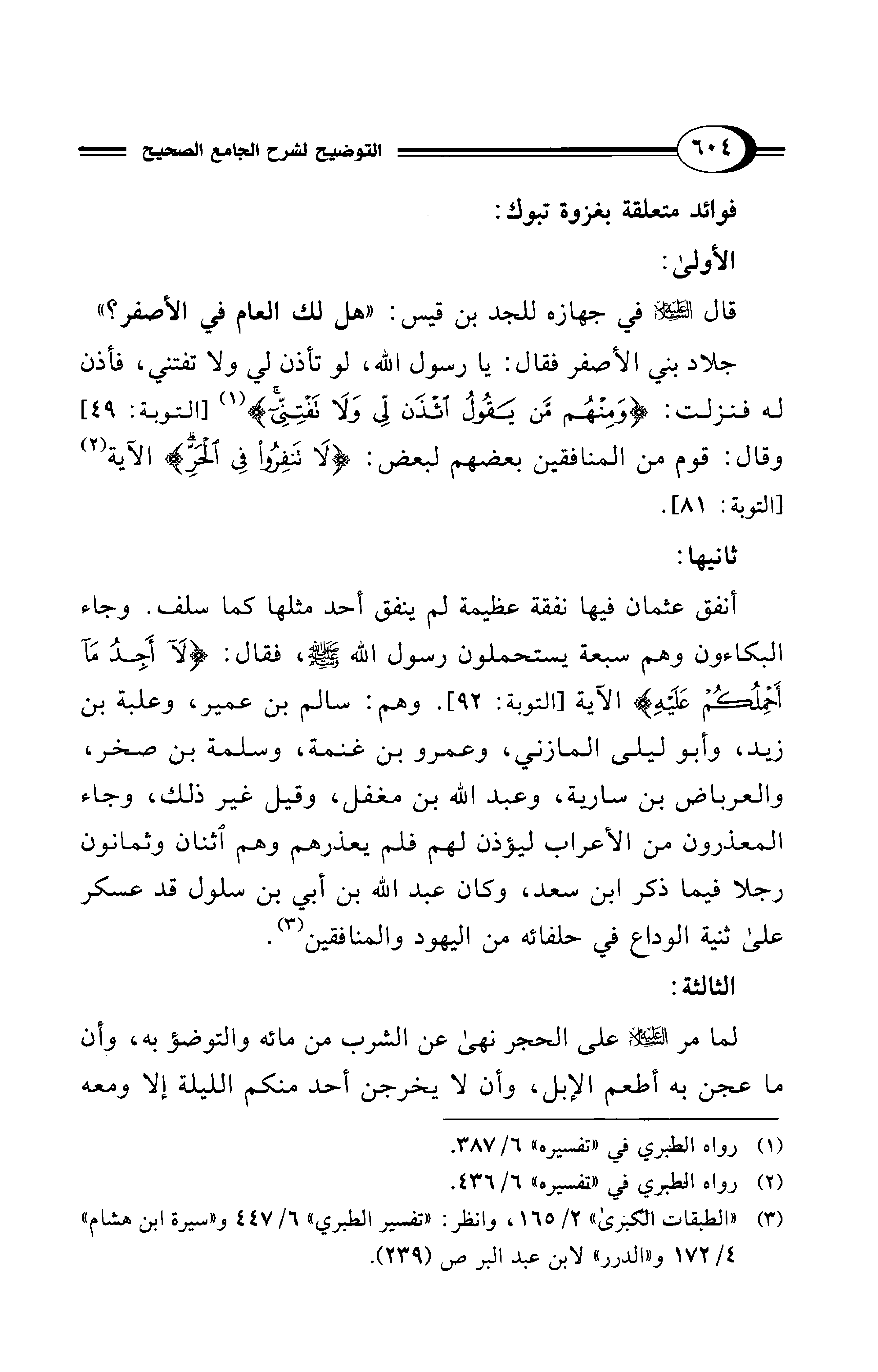 أنفق عثمان فيها نفقة عظيمة لم ينفق أحد مثلها كما سلف. وجاء البكاءون وهم سبعة يستحملون رسول الله - صلى الله عليه وسلم -، فقال: {لَا أَجِدُ مَا أَحْمِلُكُمْ عَلَيْهِ} الآية [التوبة: 92]. وهم: سالم بن عمير، وعلبة بن زيد، وأبو ليلى المازني، وعمرو بن غنمة، وسلمة بن صخر، والعرباض بن سارية، وعبد الله بن مغفل، وقيل غير ذلك، وجاء المعذرون من الأعراب ليؤذن لهم فلم يعذرهم وهم اثنان وثمانون رجلا فيما ذكر ابن سعد، وكان عبد الله بن أبي بن سلول قد عسكر على ثنية الوداع في حلفائه من اليهود والمنافقين (¬3).