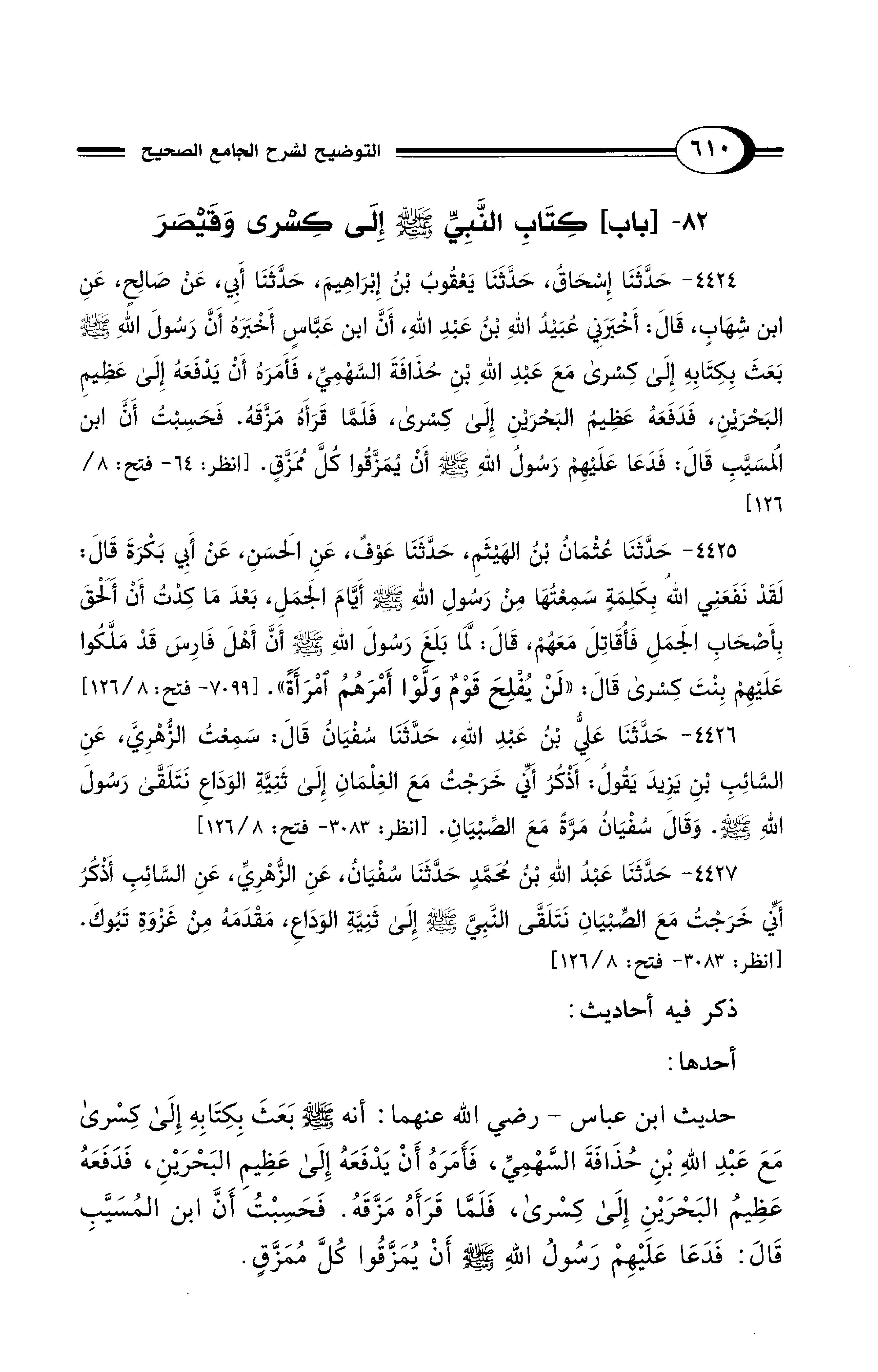 4424 - حَدَّثَنَا إِسْحَاقُ, حَدَّثَنَا يَعْقُوبُ بْنُ إِبْرَاهِيمَ, حَدَّثَنَا أَبِي, عَنْ صَالِحٍ, عَنِ ابْنِ شِهَابٍ, قَالَ: أَخْبَرَنِي عُبَيْدُ اللهِ بْنُ عَبْدِ اللهِ, أَنَّ ابْنَ عَبَّاسٍ أَخْبَرَهُ أَنَّ رَسُولَ اللهِ - صلى الله عليه وسلم - بَعَثَ بِكِتَابِهِ إِلَى كِسْرَى مَعَ عَبْدِ اللهِ بْنِ حُذَافَةَ السَّهْمِيِّ، فَأَمَرَهُ أَنْ يَدْفَعَهُ إِلَى عَظِيمِ الْبَحْرَيْنِ، فَدَفَعَهُ عَظِيمُ الْبَحْرَيْنِ إِلَى كِسْرَى، فَلَمَّا قَرَأَهُ مَزَّقَهُ. فَحَسِبْتُ أَنَّ ابْنَ الْمُسَيَّبِ قَالَ: فَدَعَا عَلَيْهِمْ رَسُولُ اللهِ - صلى الله عليه وسلم - أَنْ يُمَزَّقُوا كُلَّ مُمَزَّقٍ. [انظر: 64 - فتح: 8/ 126]