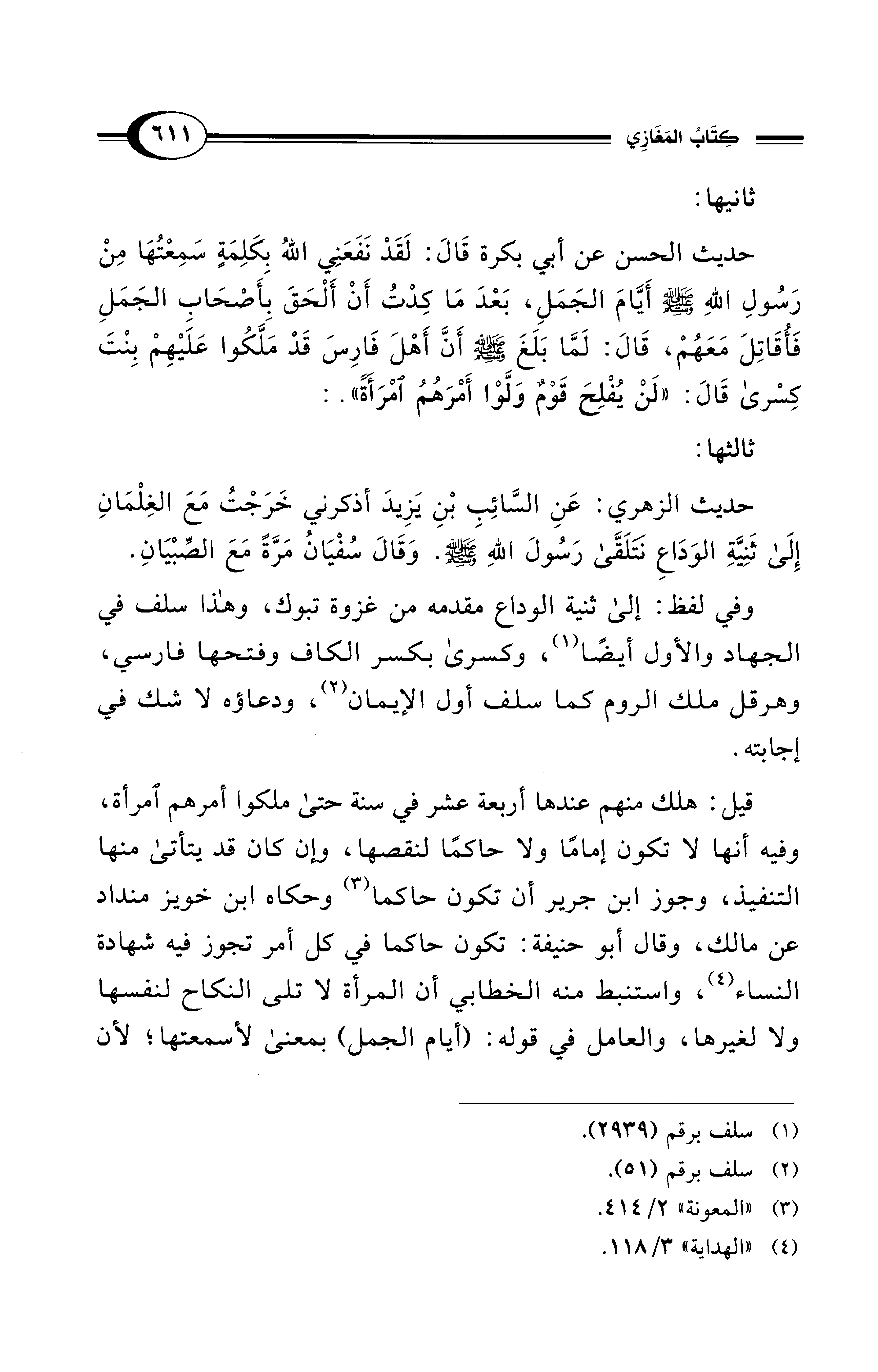 حديث الحسن عن أبي بكرة قَالَ: لَقَدْ نَفَعَنِي اللهُ بِكَلِمَةٍ سَمِعْتُهَا مِنْ رَسُولِ اللهِ - صلى الله عليه وسلم - أَيَّامَ الجَمَلِ، بَعْدَ مَا كِدْتُ أَنْ أَلْحَقَ بِأَصْحَابِ الجَمَلِ فَأُقَاتِلَ مَعَهُمْ، قَالَ: لَمَّا بَلَغَ - صلى الله عليه وسلم - أَنَّ أَهْلَ فَارِسَ قَدْ مَلَّكُوا عَلَيْهِمْ بِنْتَ كِسْرى قَالَ: "لَنْ يُفْلِحَ قَوْمٌ وَلَّوْا أَمْرَهُمُ امْرَأة".:
