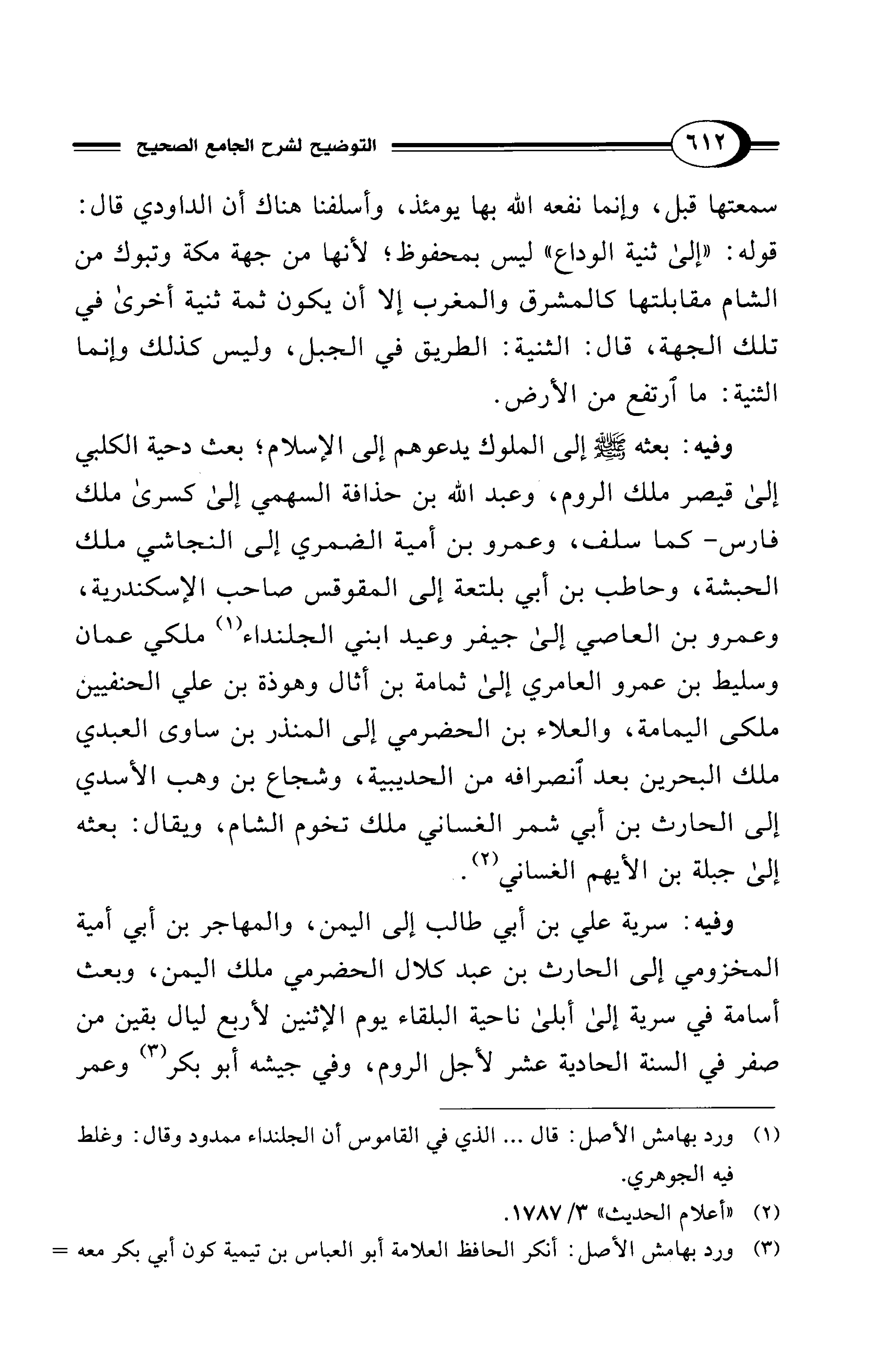 وفيه: بعثه - صلى الله عليه وسلم - إلى الملوك يدعوهم إلى الإسلام؛ بعث دحية الكلبي إلى قيصر ملك الروم، وعبد الله بن حذافة السهمي إلى كسرى ملك فارس -كما سلف، وعمرو بن أمية الضمري إلى النجاشي ملك الحبشة، وحاطب بن أبى بلتعة إلى المقوقس صاحب الإسكندرية، وعمرو بن العاصي إلى جيفر وعيد ابني الجلنداء (¬1) ملكي عمان وسليط بن عمرو العامري إلى ثمامة بن أثال وهوذة بن علي الحنفيين ملكى اليمامة، والعلاء بن الحضرمي إلى المنذر بن ساوى العبدي ملك البحرين بعد انصرافه من الحديبية، وشجاع بن وهب الأسدي إلى الحارث بن أبي شمر الغساني ملك تخوم الشام، ويقال: بعثه إلى جبلة بن الأيهم الغساني (¬2).