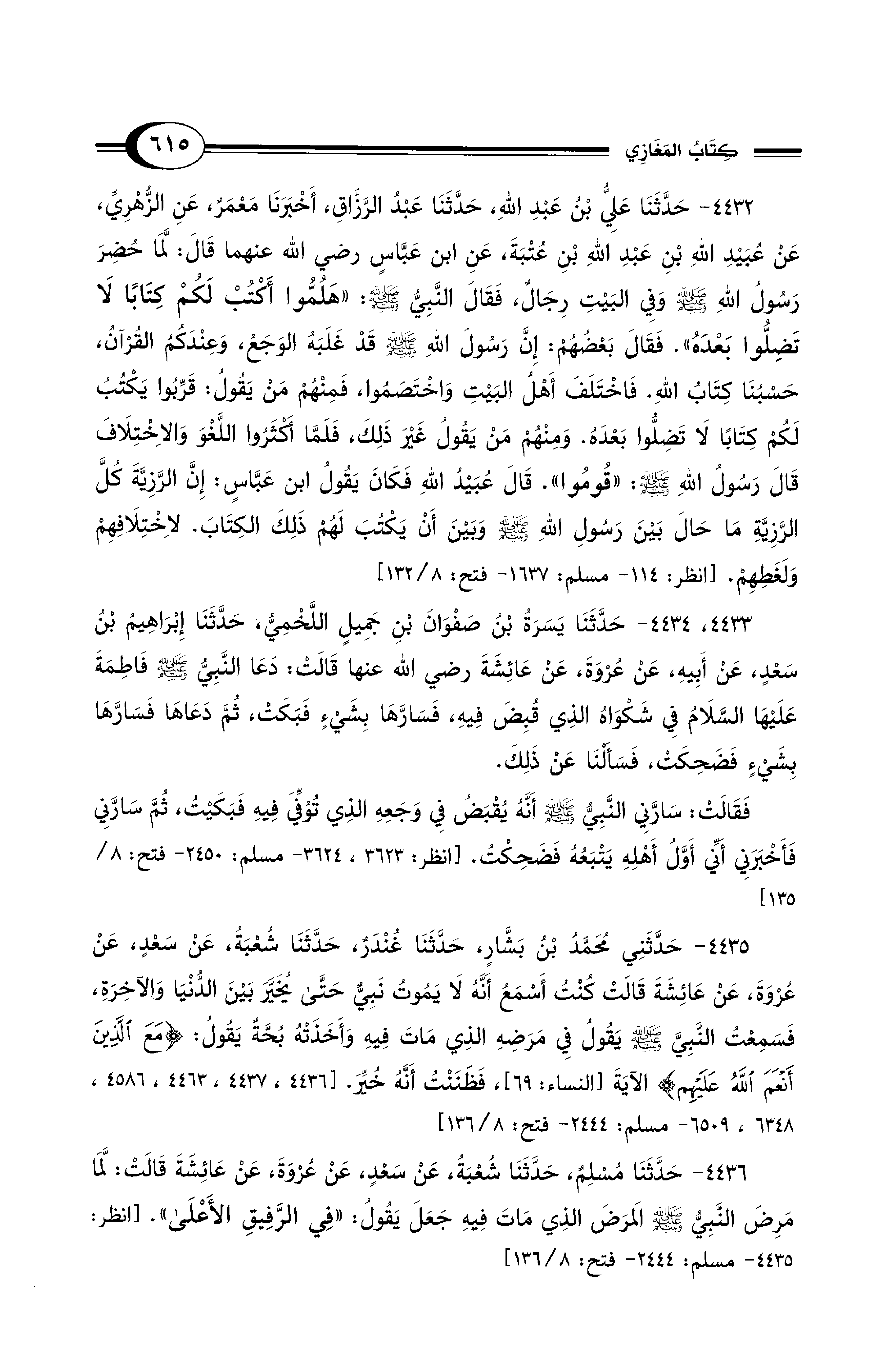 4432 - حَدَّثَنَا عَلِيُّ بْنُ عَبْدِ اللهِ, حَدَّثَنَا عَبْدُ الرَّزَّاقِ, أَخْبَرَنَا مَعْمَرٌ, عَنِ الزُّهْرِيِّ, عَنْ عُبَيْدِ اللهِ بْنِ عَبْدِ اللهِ بْنِ عُتْبَةَ, عَنِ ابْنِ عَبَّاسٍ - رضي الله عنهما - قَالَ: لَمَّا حُضِرَ رَسُولُ اللهِ - صلى الله عليه وسلم - وَفِي الْبَيْتِ رِجَالٌ، فَقَالَ النَّبِيُّ - صلى الله عليه وسلم -: "هَلُمُّوا أَكْتُبْ لَكُمْ كِتَابًا لاَ تَضِلُّوا بَعْدَهُ". فَقَالَ بَعْضُهُمْ إِنَّ رَسُولَ اللهِ - صلى الله عليه وسلم - قَدْ غَلَبَهُ الْوَجَعُ, وَعِنْدَكُمُ الْقُرْآنُ، حَسْبُنَا كِتَابُ اللهِ. فَاخْتَلَفَ أَهْلُ الْبَيْتِ وَاخْتَصَمُوا، فَمِنْهُمْ مَنْ يَقُولُ: قَرِّبُوا يَكْتُبُ لَكُمْ كِتَابًا لاَ تَضِلُّوا بَعْدَهُ. وَمِنْهُمْ مَنْ يَقُولُ غَيْرَ ذَلِكَ، فَلَمَّا أَكْثَرُوا اللَّغْوَ وَالاِخْتِلاَفَ قَالَ رَسُولُ اللهِ - صلى الله عليه وسلم - "قُومُوا". قَالَ عُبَيْدُ اللهِ فَكَانَ يَقُولُ ابْنُ عَبَّاسٍ: إِنَّ الرَّزِيَّةَ كُلَّ الرَّزِيَّةِ مَا حَالَ بَيْنَ رَسُولِ اللهِ - صلى الله عليه وسلم - وَبَيْنَ أَنْ يَكْتُبَ لَهُمْ ذَلِكَ الْكِتَابَ. لاِخْتِلاَفِهِمْ وَلَغَطِهِمْ. [انظر: 114 - مسلم: 1637 - فتح: 8/ 132]