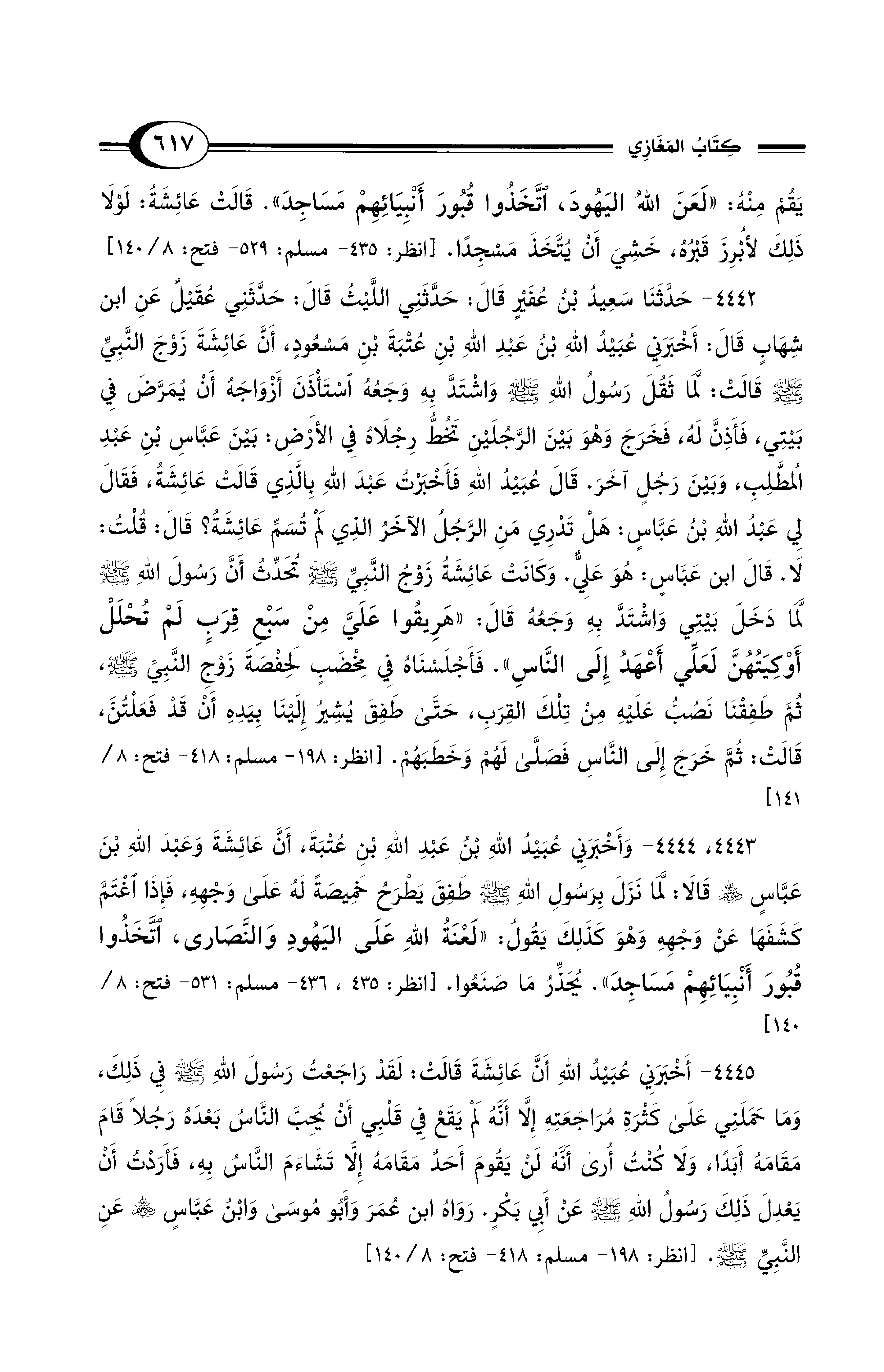 4443, 4444 - وَأَخْبَرَنِي عُبَيْدُ اللهِ بْنُ عَبْدِ اللهِ بْنِ عُتْبَةَ, أَنَّ عَائِشَةَ وَعَبْدَ اللهِ بْنَ عَبَّاسٍ رضي الله عنهم قَالا: لَمَّا نَزَلَ بِرَسُولِ اللهِ - صلى الله عليه وسلم - طَفِقَ يَطْرَحُ خَمِيصَةً لَهُ عَلَى وَجْهِهِ، فَإِذَا اغْتَمَّ كَشَفَهَا عَنْ وَجْهِهِ وَهْوَ كَذَلِكَ يَقُولُ: "لَعْنَةُ اللهِ عَلَى الْيَهُودِ وَالنَّصَارَى، اتَّخَذُوا قُبُورَ أَنْبِيَائِهِمْ مَسَاجِدَ". يُحَذِّرُ مَا صَنَعُوا. [انظر: 435، 436 - مسلم: 531 - فتح: 8/ 140]