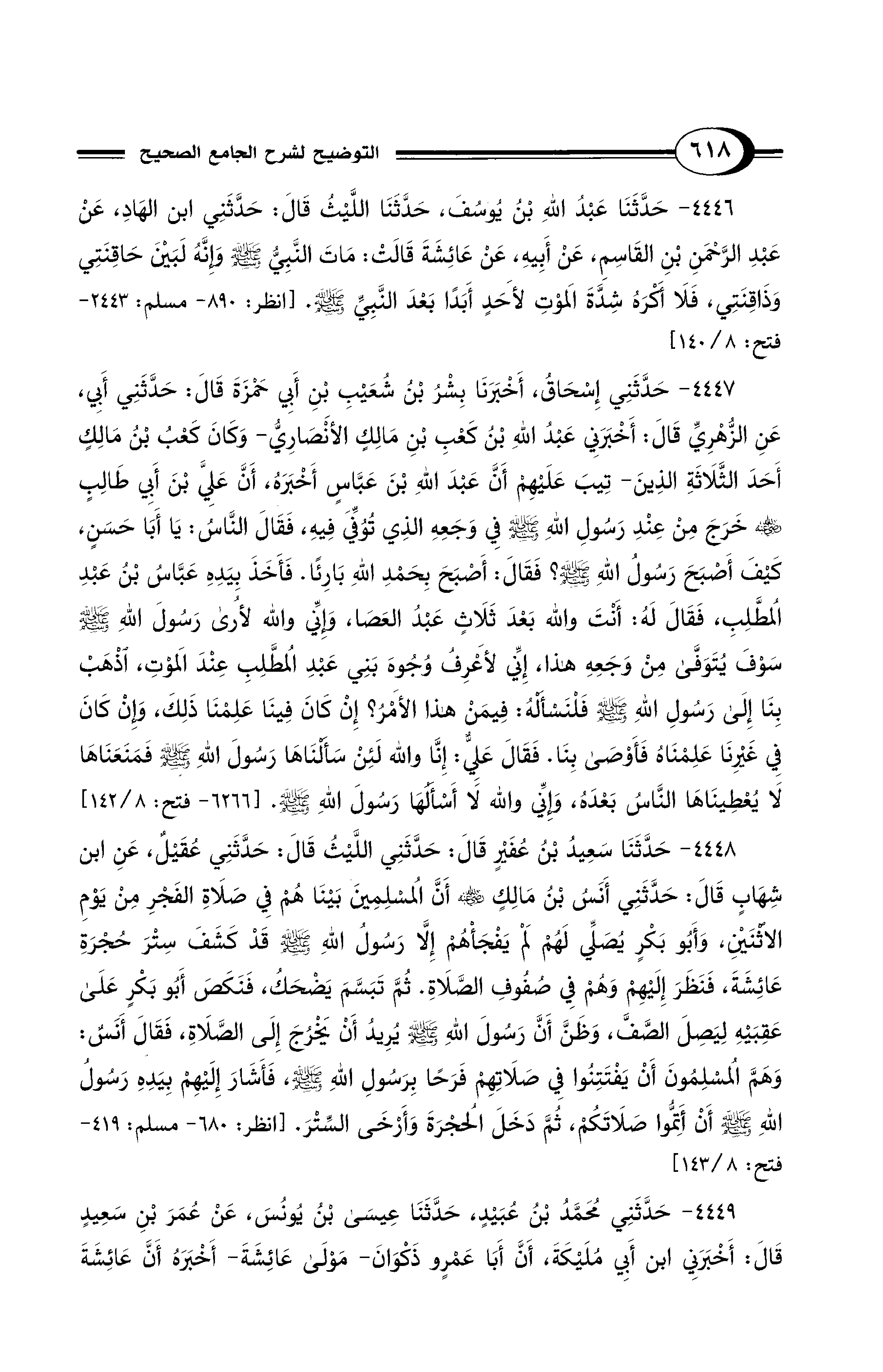 4447 - حَدَّثَنِي إِسْحَاقُ, أَخْبَرَنَا بِشْرُ بْنُ شُعَيْبِ بْنِ أَبِي حَمْزَةَ قَالَ: حَدَّثَنِي أَبِي, عَنِ الزُّهْرِيِّ قَالَ: أَخْبَرَنِي عَبْدُ اللهِ بْنُ كَعْبِ بْنِ مَالِكٍ الأَنْصَاريُّ -وَكَانَ كَعْبُ بْنُ مَالِكٍ أَحَدَ الثَّلاَثَةِ الَّذِينَ- تِيبَ عَلَيْهِمْ أَنَّ عَبْدَ اللهِ بْنَ عَبَّاسٍ أَخْبَرَهُ, أَنَّ عَلِيَّ بْنَ أَبِي طَالِبٍ - رضي الله عنه - خَرَجَ مِنْ عِنْدِ رَسُولِ اللهِ - صلى الله عليه وسلم - فِي وَجَعِهِ الَّذِي تُوُفِّيَ فِيهِ، فَقَالَ النَّاسُ يَا أَبَا حَسَنٍ، كَيْفَ أَصْبَحَ رَسُولُ اللهِ - صلى الله عليه وسلم -؟ فَقَالَ: أَصْبَحَ بِحَمْدِ اللهِ بَارِئًا. فَأَخَذَ بِيَدِهِ عَبَّاسُ بْنُ عَبْدِ الْمُطَّلِبِ، فَقَالَ لَهُ: أَنْتَ وَاللهِ بَعْدَ ثَلاَثٍ عَبْدُ الْعَصَا، وَإِنِّي وَاللهِ لأُرَى رَسُولَ اللهِ - صلى الله عليه وسلم - سَوْفَ يُتَوَفَّى مِنْ وَجَعِهِ هَذَا، إِنِّي لأَعْرِفُ وُجُوهَ بَنِي عَبْدِ الْمُطَّلِبِ عِنْدَ الْمَوْتِ، اذْهَبْ بِنَا إِلَى رَسُولِ اللهِ - صلى الله عليه وسلم - فَلْنَسْأَلْهُ: فِيمَنْ هَذَا الأَمْرُ؟ إِنْ كَانَ فِينَا عَلِمْنَا ذَلِكَ، وَإِنْ كَانَ فِي غَيْرِنَا عَلِمْنَاهُ فَأَوْصَى بِنَا. فَقَالَ عَلِيٌّ: إِنَّا وَاللهِ لَئِنْ سَأَلْنَاهَا رَسُولَ اللهِ - صلى الله عليه وسلم - فَمَنَعَنَاهَا لاَ يُعْطِينَاهَا النَّاسُ بَعْدَهُ، وَإِنِّي وَاللهِ لاَ أَسْأَلُهَا رَسُولَ اللهِ - صلى الله عليه وسلم -. [6266 - فتح: 8/ 142]