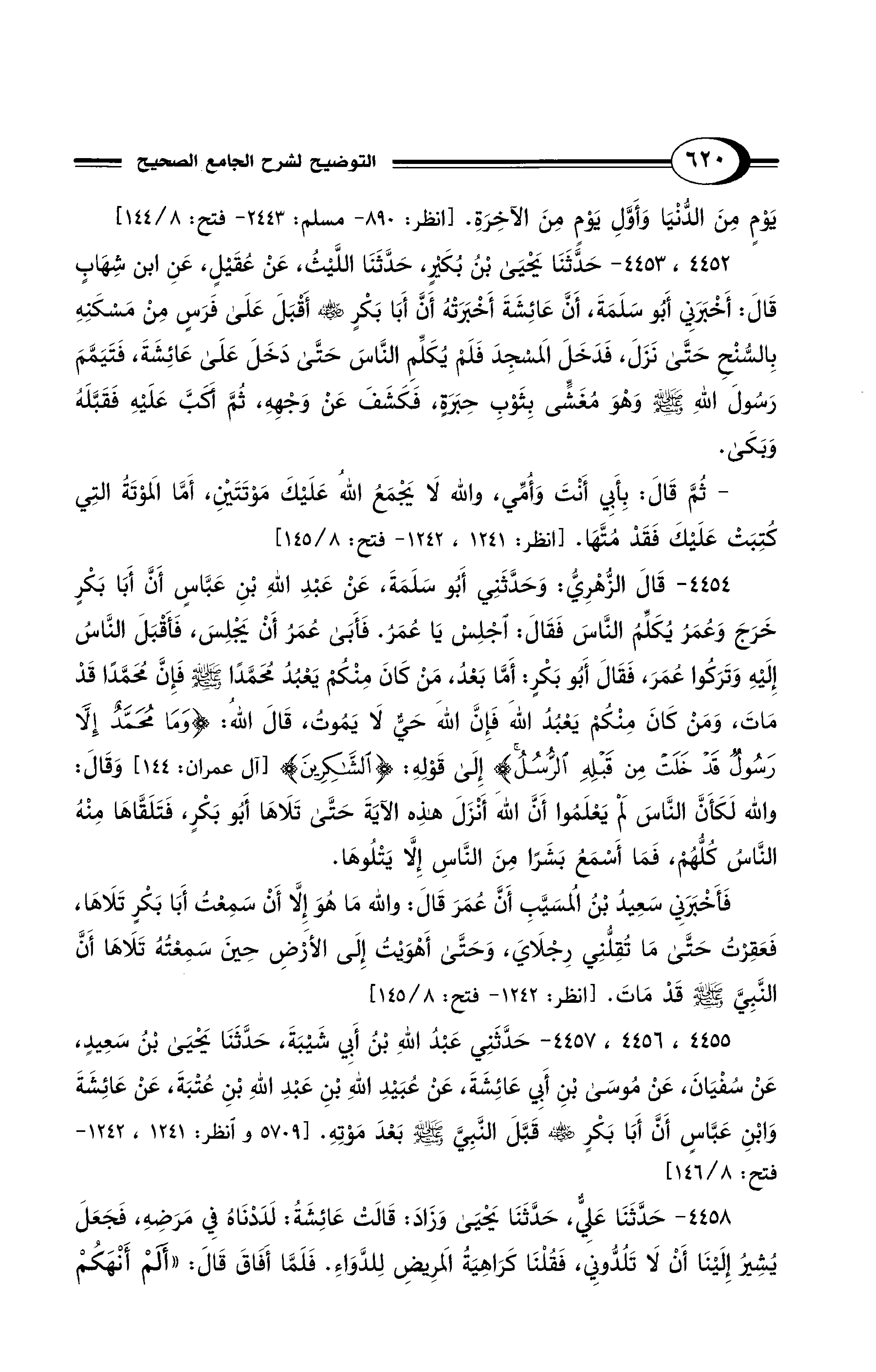 4452, 4453 - حَدَّثَنَا يَحْيَى بْنُ بُكَيْرٍ, حَدَّثَنَا اللَّيْثُ, عَنْ عُقَيْلٍ, عَنِ ابْنِ شِهَابٍ قَالَ: أَخْبَرَنِي أَبُو سَلَمَةَ, أَنَّ عَائِشَةَ أَخْبَرَتْهُ أَنَّ أَبَا بَكْرٍ - رضي الله عنه - أَقْبَلَ عَلَى فَرَسٍ مِنْ مَسْكَنِهِ بِالسُّنْحِ حَتَّى نَزَلَ، فَدَخَلَ الْمَسْجِدَ فَلَمْ يُكَلِّمِ النَّاسَ حَتَّى دَخَلَ عَلَى عَائِشَةَ، فَتَيَمَّمَ رَسُولَ اللهِ - صلى الله عليه وسلم - وَهْوَ مُغَشًّى بِثَوْبِ حِبَرَةٍ، فَكَشَفَ عَنْ وَجْهِه, ثُمَّ أَكَبَّ عَلَيْهِ فَقَبَّلَهُ وَبَكَى.