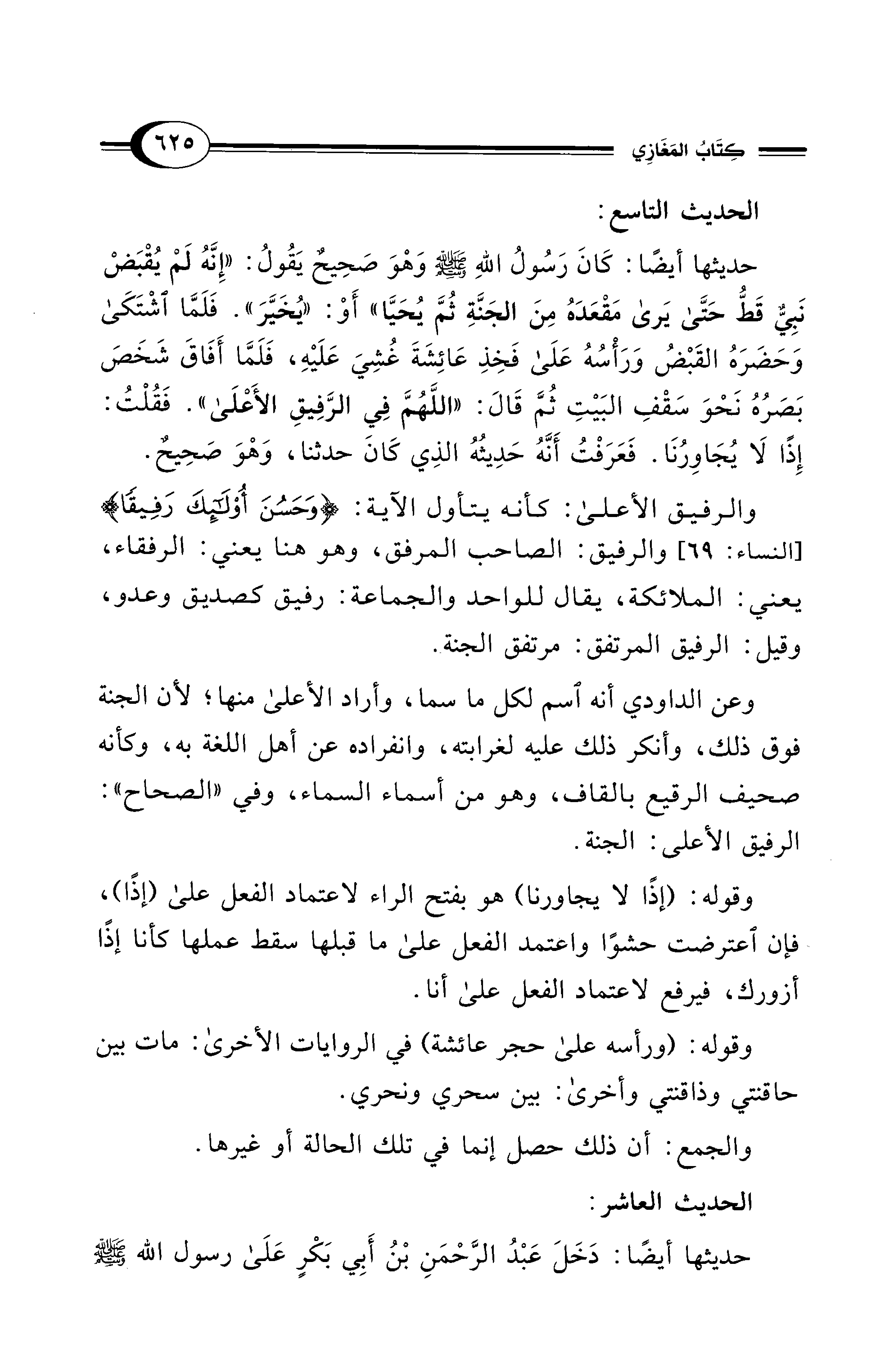 حديثها أيضًا: كَانَ رَسُولُ اللهِ - صلى الله عليه وسلم - وَهْوَ صَحِيحٌ يَقُولُ: "إِنَّهُ لَمْ يُقْبَضْ نَبِيٌّ قَطُّ حَتَّى يَرى مَقْعَدَهُ مِنَ الجَنَّةِ ثُمَّ يُحَيَّا" أَوْ: "يُخَيَّرَ". فَلَمَّا اشْتَكَى وَحَضَرَهُ القَبْضُ وَرَأْسُهُ عَلى فَخِذِ عَائِشَةَ غُشِيَ عَلَيْهِ، فَلَمَّا أَفَاقَ شَخَصَ بَصَرُهُ نَحْوَ سَقْفِ البَيْتِ ثُمَّ قَالَ: "اللَّهُمَّ فِي الرَّفِيقِ الأَعْلى". فَقُلْتُ: إِذًا لَا يُجَاوِرُنَا. فَعَرَفْتُ أَنَّهُ حَدِيثُهُ الذِي كَانَ حدثنا، وَهْوَ صَحِيحٌ.