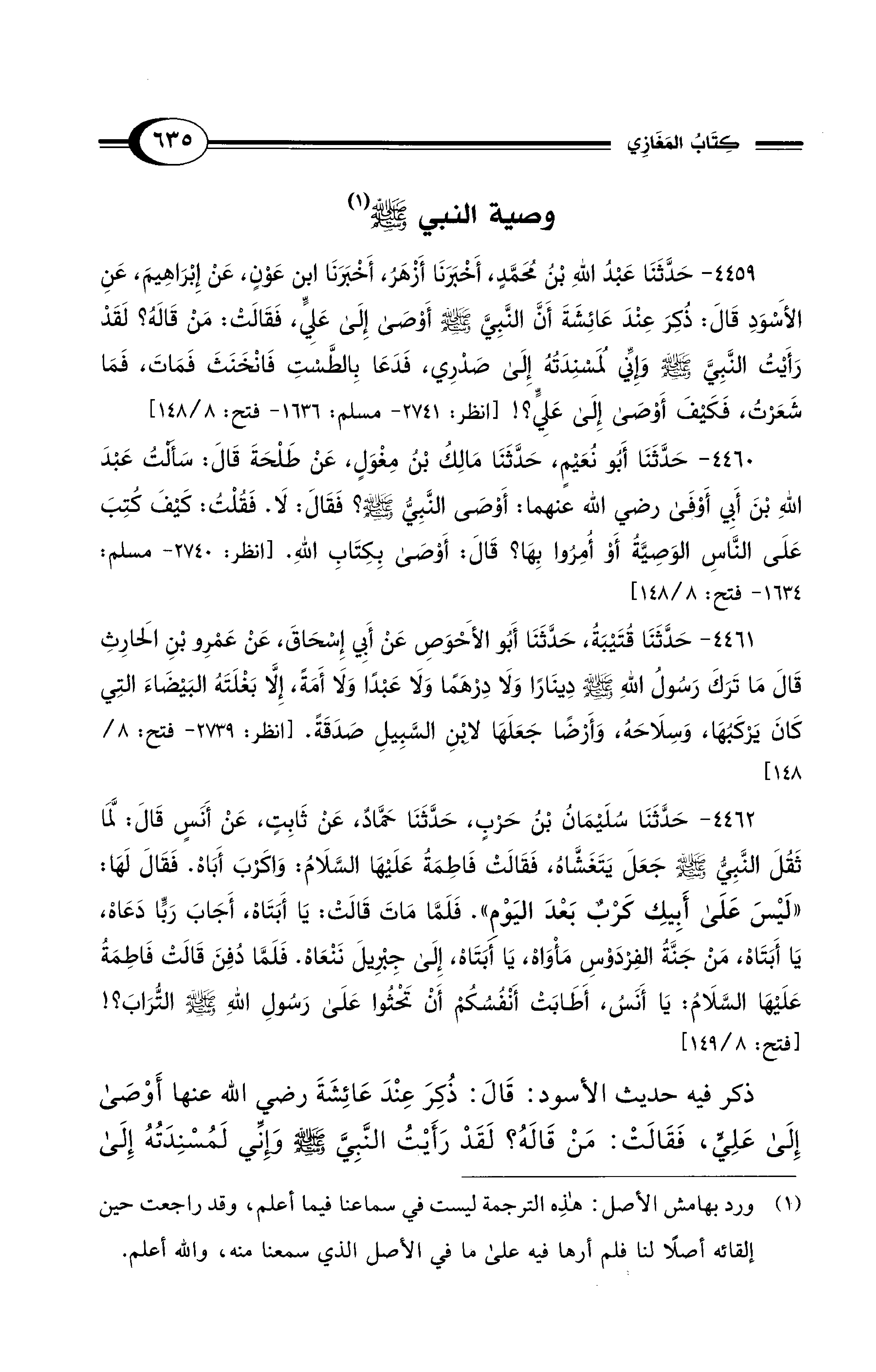 4459 - حَدَّثَنَا عَبْدُ اللهِ بْنُ مُحَمَّدٍ, أَخْبَرَنَا أَزْهَرُ, أَخْبَرَنَا ابْنُ عَوْنٍ, عَنْ إِبْرَاهِيمَ, عَنِ الأَسْوَدِ قَالَ: ذُكِرَ عِنْدَ عَائِشَةَ أَنَّ النَّبِيَّ - صلى الله عليه وسلم -أَوْصَى إِلَى عَلِيٍّ، فَقَالَتْ: مَنْ قَالَهُ؟ لَقَدْ رَأَيْتُ النَّبِيَّ - صلى الله عليه وسلم - وَإِنِّي لَمُسْنِدَتُهُ إِلَى صَدْرِي، فَدَعَا بِالطَّسْتِ فَانْخَنَثَ فَمَاتَ، فَمَا شَعَرْتُ، فَكَيْفَ أَوْصَى إِلَى عَلِيٍّ؟! [انظر: 2741 - مسلم: 1636 - فتح: 8/ 148]