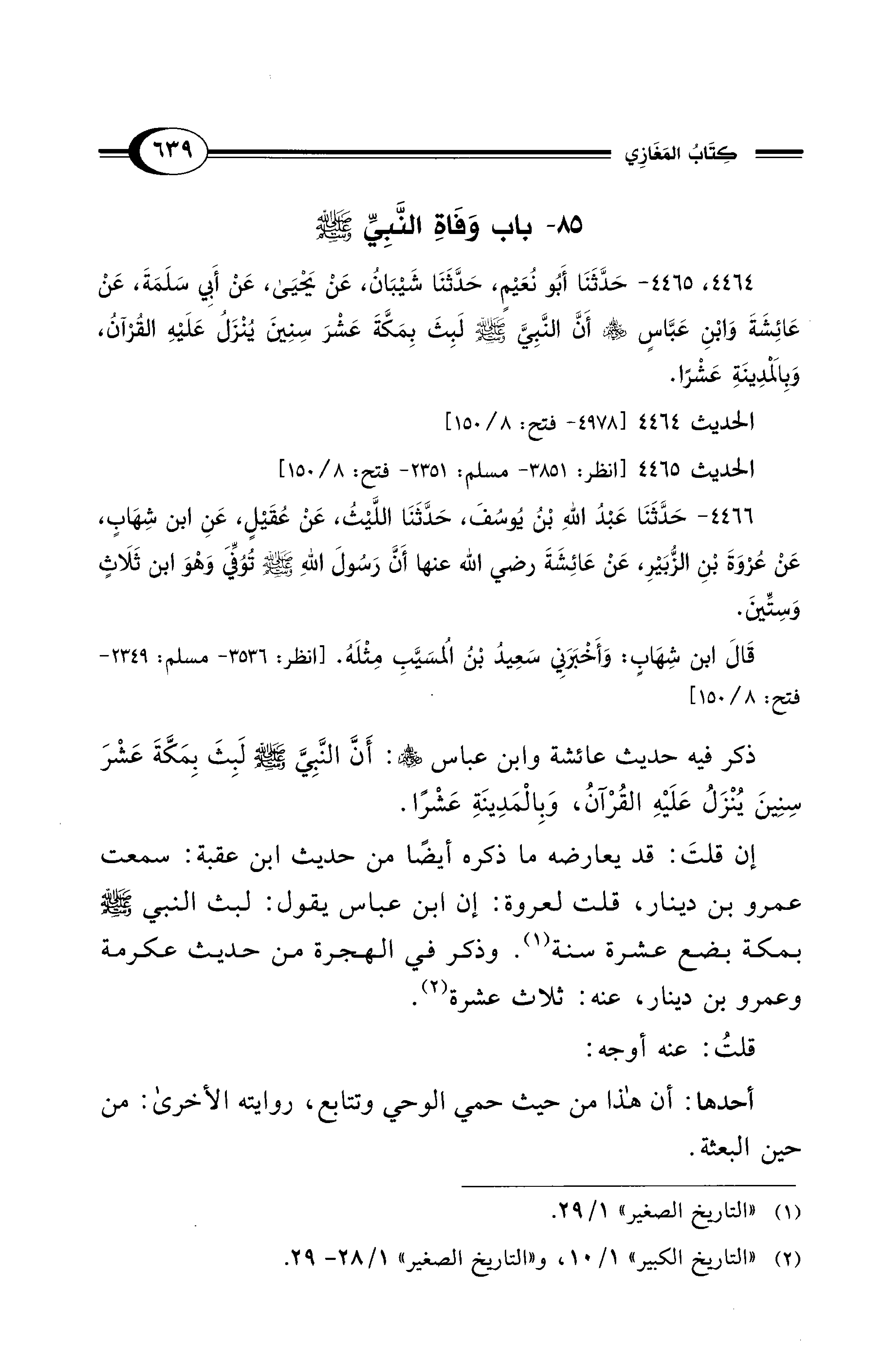 4466 - حَدَّثَنَا عَبْدُ اللهِ بْنُ يُوسُفَ, حَدَّثَنَا اللَّيْثُ, عَنْ عُقَيْلٍ, عَنِ ابْنِ شِهَابٍ, عَنْ عُرْوَةَ بْنِ الزُّبَيْرِ, عَنْ عَائِشَةَ - رضي الله عنها - أَنَّ رَسُولَ اللهِ - صلى الله عليه وسلم - تُوُفِّيَ وَهْوَ ابْنُ ثَلاَثٍ وَسِتِّينَ. قَالَ ابْنُ شِهَابٍ: وَأَخْبَرَنِي سَعِيدُ بْنُ الْمُسَيَّبِ مِثْلَهُ. [انظر: 3536 - مسلم: 2341 - فتح: 8/ 150]
