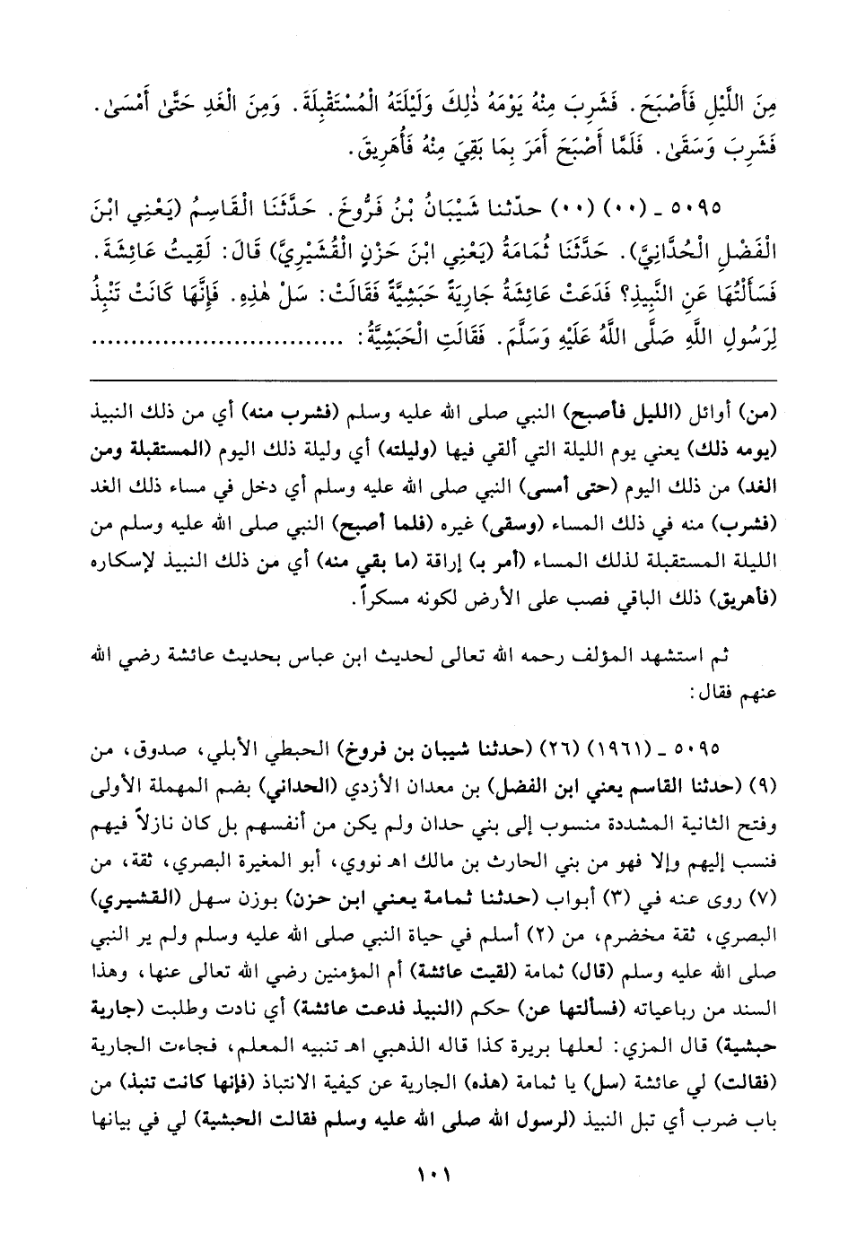 ٥٠٩٥ - (٠٠) (٠٠) حدَّثنا شَيبَانُ بْنُ فَرُّوخَ. حَدَّثَنَا الْقَاسِمُ (يَعْنِي ابْنَ الْفَضْلِ الْحُدَّانِيَّ). حَدَّثَنَا ثُمَامَةُ (يَعْنِي ابْنَ حَزْنٍ الْقُشَيرِيَّ) قَال: لَقِيتُ عَائِشَةَ. فَسَأَلْتُهَا عَنِ النَّبِيذِ؟ فَدَعَتْ عَائِشَةُ جَارِيَةً حَبَشِيَّةً فَقَالتْ: سَلْ هذِهِ. فَإِنَّهَا كَانَتْ تَنْبِذُ لِرَسُولِ اللهِ صَلَّى اللهُ عَلَيهِ وَسَلَّمَ، فَقَالتِ الْحَبَشِيَّةُ: