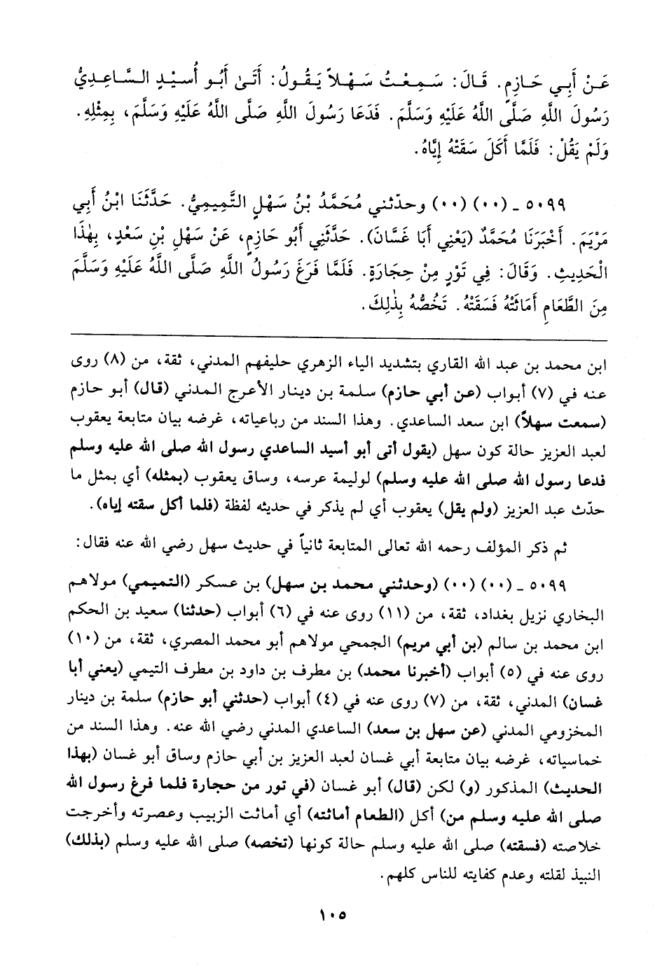 ٥٠٩٩ - (٠٠) (٠٠) (وحدثني محمد بن سهل) بن عسكر (التميمي) مولاهم البخاري نزيل بغداد، ثقة، من (١١) روى عنه في (٦) أبواب (حدثنا) سعيد بن الحكم ابن محمد بن سالم (بن أبي مريم) الجمحي مولاهم أبو محمد المصري، ثقة، من (١٠) روى عنه في (٥) أبواب (أخبرنا محمد) بن مطرف بن داود بن مطرف التيمي (يعني أبا غسان) المدني، ثقة، من (٧) روى عنه في (٤) أبواب (حدثني أبو حازم) سلمة بن دينار المخزومي المدني (عن سهل بن سعد) الساعدي المدني رضي الله عنه. وهذا السند من خماسياته، غرضه بيان متابعة أبي غسان لعبد العزيز بن أبي حازم وساق أبو غسان (بهذا الحديث) المذكور (و) لكن (قال) أبو غسان (في تور من حجارة فلما فرغ رسول الله صلى الله عليه وسلم من) أكل (الطعام أماثته) أي أماثت الزبيب وعصرته وأخرجت خلاصته (فسقته) صلى الله عليه وسلم حالة كونها (تخصه) صلى الله عليه وسلم (بذلك) النبيذ لقلته وعدم كفايته للناس كلهم.