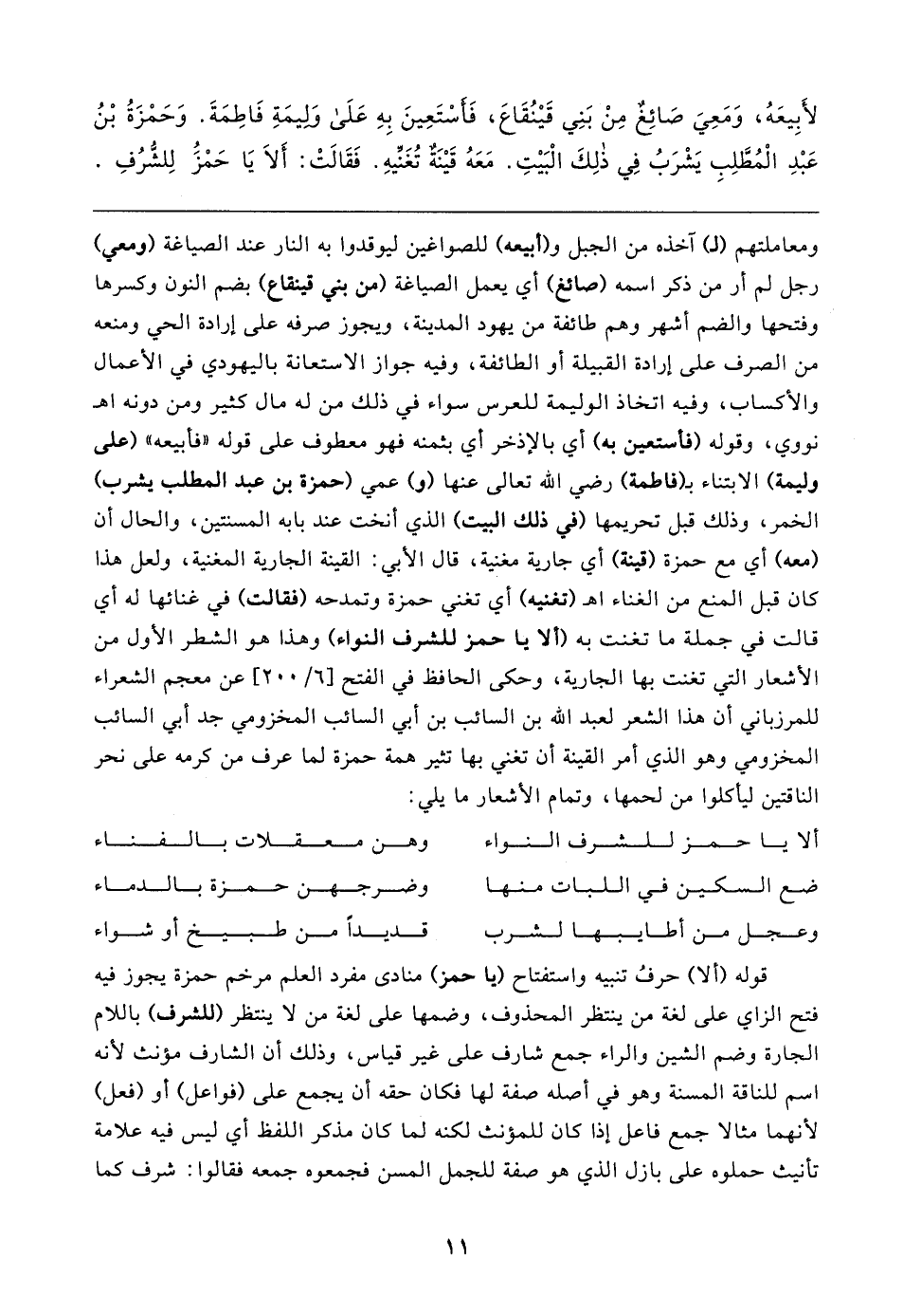 لأَبِيعَهُ، وَمَعِيَ صَائِغٌ مِنْ بَنِي قَينُقَاعَ، فَأسْتَعِينَ بِهِ عَلَى وَليمَةِ فَاطِمَةَ. وَحَمْزَةُ بْنُ عَبْدِ المُطَّلِبِ يَشْرَبُ في ذلِكَ البَيتِ. مَعَهُ قَينَةٌ تُغَنِّيهِ. فَقَالتْ: أَلا يَا حَمْزُ لِلشُّرُفِ
