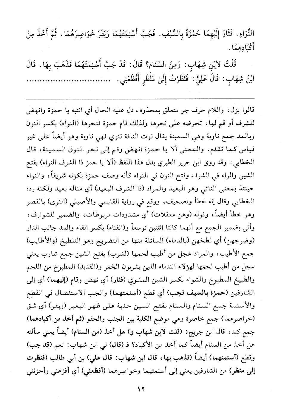 قالوا بزل، والسلام حرف جر متعلق بمحذوف دل عليه الحال أي انتبه يَا حمزة وانهض للشرف أو قم لها، تحرضه على نحرها ولذلك قام حمزة فنحرها (النواء) بكسر النُّون وبالمد جمع ناوية وهي السمينة يقال نوت الناقة تنوي فهي ناوية وهو أَيضًا على غير قياس كما تقدم، والمعنى ألا يَا حمزة انهض وقم إلى نحر النوق السمينة، قال الخطابي: وقد روى ابن جرير الطبري بدل هذا اللفظ (ألا يَا حمز ذا الشرف النواء) بفتح الشين والراء في الشرف وفتح النُّون في النواء كأنه وصف حمزة بكونه شريفًا، والنواء حينئذ بمعنى النَّائِيّ وهو البعيد والمراد (ذا الشرف البعيد) أي مناله بعيد ولكنه رده الخطابي وقال إنه خطأ وتصحيف، ووقع في رواية القابسي والأصيلي (النوى) بالقصر وهو خطأ أَيضًا، وقوله (وهن معقلات) أي مشدودات مربوطات، والضمير للشوارف، وأتى بضمير الجمع مع أنهما كانتا اثنتين توسعًا و (الفناء) بكسر الفاء والمد جانب الدار (وضرجهن) أي لطخهن (بالدماء) السائلة منها من التضريج وهو التلطيخ (والأطايب) جمع الأطيب، والمراد عجل من أطيب لحمها (لشرب) بفتح الشين جمع شارب يعني عجل من أطيب لحمها لهؤلاء الندماء الذين يشربون الخمر و (القديد) المطبوخ من اللحم والطبيخ المطبوخ والشواء بكسر الشين المشوي (فثار) أي نهض وقام (إليهما) أي إلى الشارفين (حمزة بالسيف فجب) أي قطع (أسنمتهما) والجب الاستئصال في القطع والأسنمة جمع السنام والسنام بفتح السين حدبة على ظهر البعير (وبقر) أي شق (خواصرهما) جمع خاصرة وهي موضع الكلية بين الجنب والحقو (ثم أخذ من أكبادهما) جمع كبد، قال ابن جريج: (قلت لابن شهاب و) هل أخذ (من السنام) أَيضًا يعني سألته هل أخذ من السنام أَيضًا كما أخذ من الأكباد؟ فـ (قال) لي ابن شهاب: نعم (قد جب) وقطع (أسنمتهما) أَيضًا (فذهب بها، قال ابن شهاب: قال علي) بن أبي طالب (فنظرت إلى منظر) من الشارفين يعني إلى أسنمتهما وخواصرهما (أفظعني) أي أفزعني وأحزنني