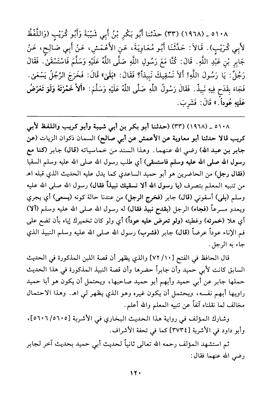٥١٠٨ - (١٩٦٨) (٣٣) حدَّثنا أبُو بَكْرِ بْنُ أَبِي شَيبَةَ وَأَبُو كُرَيبٍ (وَاللَّفْظُ لأَبِي كُرَيبٍ). قَالا: حَدَّثَنَا أَبُو مُعَاويةَ، عَنِ الأَعْمَشِ، عَنْ أَبِي صَالِحٍ، عَنْ جَابِرِ بْنِ عَبْدِ اللهِ. قَال: كُنَّا مَعَ رَسُولِ اللهِ صَلَّى اللهُ عَلَيهِ وَسَلَّمَ فَاسْتَسْقَى. فَقَال رَجُلٌ: يَا رَسُولَ اللهِ! أَلا نَسْقِيكَ نَبِيذًا؟ فَقَال: "بَلَى" قَال: فَخَرَجَ الرَّجُلُ يَسْعَى. فَجَاءَ بِقَدَحِ فِيهِ نَبِيذٌ. فَقَال رَسُولُ اللهِ صَلَّى اللهُ عَلَيهِ وَسَلَّمَ: "أَلَّا خَمَّرْتَهُ وَلَوْ تَعْرُضُ عَلَيهِ عُودًا." قَال: فَشَرِبَ