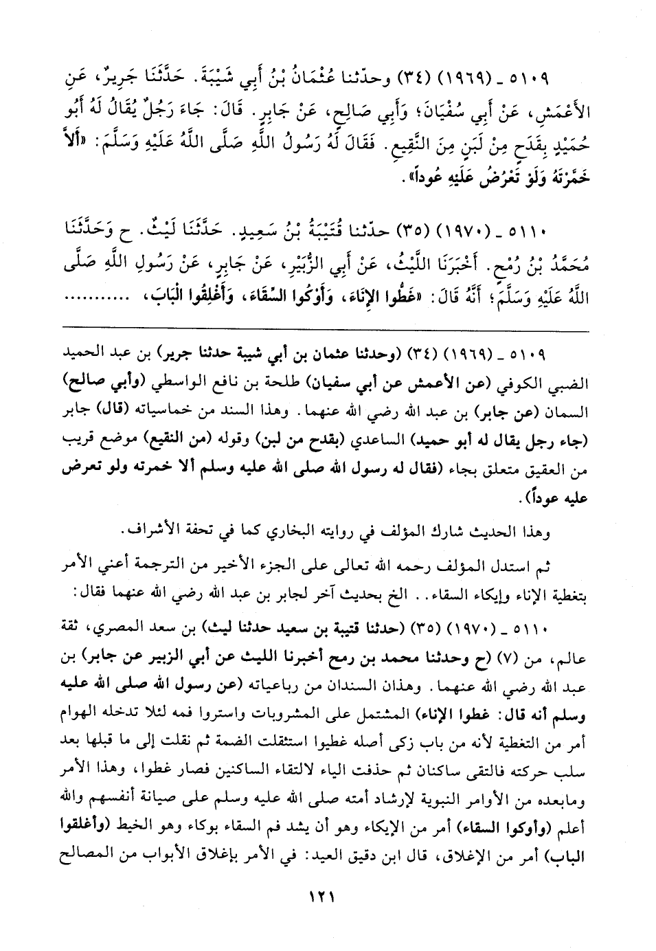 ٥١١٠ - (١٩٧٠) (٣٥) حدَّثنا قُتَيبَةُ بْنُ سَعِيدٍ. حَدَّثَنَا لَيثٌ. ح وَحَدَّثَنَا مُحَمَّدُ بْنُ رُمْحٍ. أَخْبَرَنَا اللَّيثُ، عَنْ أَبِي الزُّبَيرِ، عَنْ جَابِرٍ، عَنْ رَسُولِ اللهِ صَلَّى اللَّهُ عَلَيهِ وَسَلَّمَ؛ أَنَّهُ قَال: "غَطُّوا الإِنَاءَ، وَأَوْكُوا السِّقَاءَ، وَأَغْلِقُوا الْبَابَ،