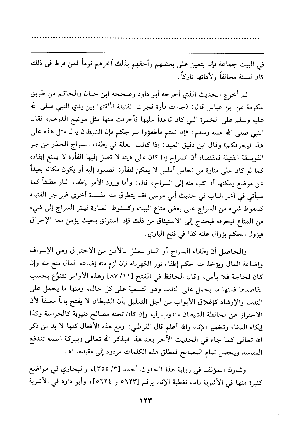 ثم أخرج الحديث الذي أخرجه أبو داود وصححه ابن حبان والحاكم من طريق عكرمة عن ابن عباس قال: (جاءت فأرة فجرت الفتيلة فألقتها بين يدي النبي صلى الله عليه وسلم على الخمرة التي كان قاعدًا عليها فأحرقت منها مثل موضع الدرهم، فقال النبي صلى الله عليه وسلم: "إذا نمتم فأطفؤوا سراجكم فإن الشيطان يدل مثل هذه على هذا فيحرقكم" وقال ابن دقيق العيد: إذا كانت العلة في إطفاء السراج الحذر من جر الفويسقة الفتيلة فمقتضاه أن السراج إذا كان على هيئة لا تصل إليها الفأرة لا يمنع إيقاده كما لو كان على منارة من نحاس أملس لا يمكن للفأرة الصعود إليه أو يكون مكانه بعيدًا عن موضع يمكنها أن تثب منه إلى السراج، قال: وأما ورود الأمر بإطفاء النار مطلقًا كما سيأتي في آخر الباب في حديث أبي موسى فقد يتطرق منه مفسدة أخرى غير جر الفتيلة كسقوط شيء من السراج على بعض متاع البيت وكسقوط المنارة فينثر السراج إلى شيء من المتاع فيحرقه فيحتاج إلى الاستيثاق من ذلك فإذا استوثق بحيث يؤمن معه الإحراق فيزول الحكم بزوال علته كذا في فتح الباري.